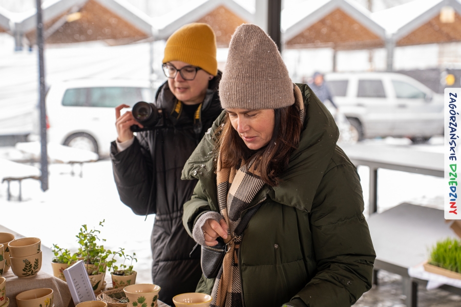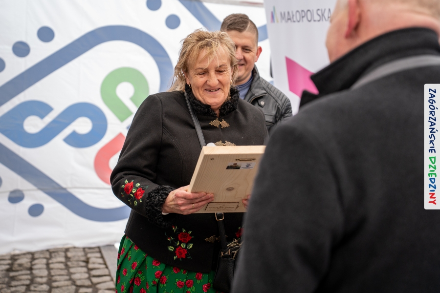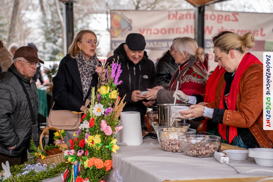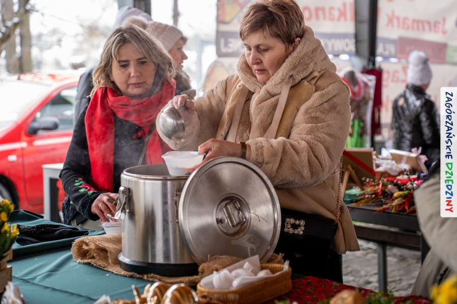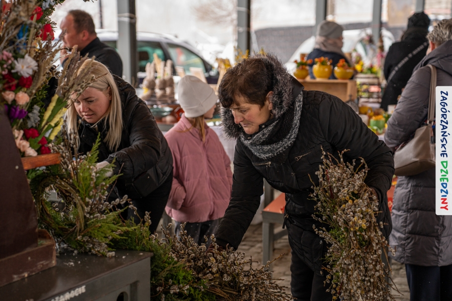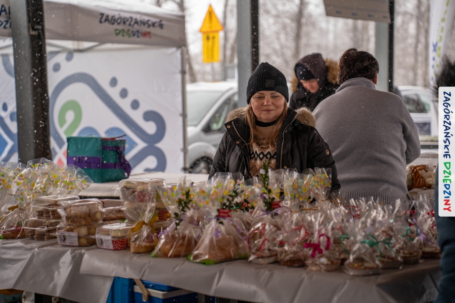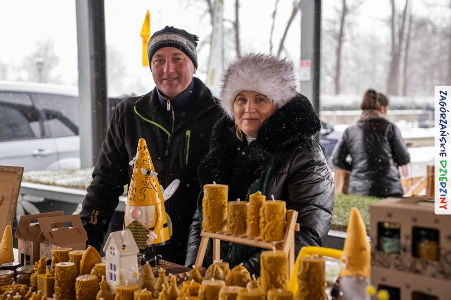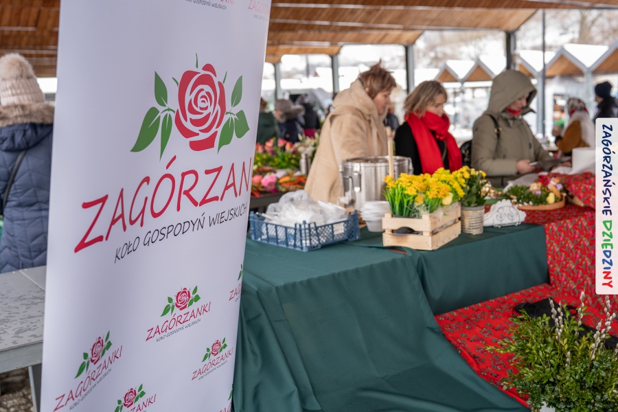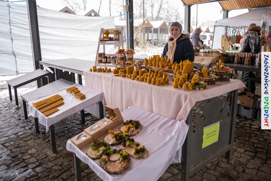 A to dopiero połowa listy! Posiadacze Znaku Promocyjnego Zagórzańskie Dziedziny stanowili mocny zespół, który w tym roku poszerzył się o kolejne nadania. Stoiskiem gastronomicznym z wielkanocnym żurkiem zarządzała rodzina Kościelniaków; to właśnie tam można było zakupić zarówno produkowany w mszańskiej octowni zagórzański żurek i ocet, ale także drożdżowe barany i kolorowe mazurki. Co więcej, nasza licencjonowana Baca w spódnicy, czyli Monika Kościelniak, przywiozła ze sobą swoje najmłodsze pociechy – młode baranki, wśród których serce skradł najmniejszy, Maniek. Wokół ich niewielkiej zagrody zrobiło się zielono i soczyście – to dzięki współpracy z firmą „Lux trawka” mieliśmy możliwość doświadczyć zielonego trawnika w ten śnieżny dzień. Miody od Moniki i Piotra Woźniaków dzięki wielu nagrodom mają swoich nabywców, a do tego sery od Moniki Kubik pasują jak ulał! Co więcej, na tym stoisku zawsze zaskoczy nas jakaś nowość! Tym razem były to serowe paluchy w różnych smakach. Widzieliście wielkanocne propozycje pierników od Gosi Suder? Aż żal będzie je zjeść, tak cieszą oko i zachwycają! Miodu u nas dostatek, wszak drugim, zagórzańskim, dostawcą tego produktu jest Józef Bierowiec, który również pojawił się na jarmarku dotrzymując towarzystwa naszej szydełkowej królowej, Zosi Piętoń. Ślinka ciekła jeszcze bardziej, gdy docieraliśmy na stoisko Moniki Kołodziej vel Cukiernia Babeczka. Ona miała świąteczną ofertę przeróżnych wypieków, wszystko w wielkanocnej aranżacji! Zawsze uśmiechnięta i radosna, Stanisława Blacharczyk, z równie sympatycznym mężem – Janem, na jarmark przywiozła barany – drożdżowe! i te „gołe” i te ubrane w biały, bezowy kożuszek, szybko znalazły nowych właścicieli. Nasze artystki - specjalistki od misternej i dokładnej pracy również mogły zaprezentować swój kunszt. Każdy Drzewniany łobrozek Józi Potaczek, to dopracowana w każdym detalu piękna, uduchowiona twórczość, a Sznurkowe Perełki - koszyczki do święcenia, czapeczki na jajka, okazjonalne dekoracje, pudełka czy zabawki – wszystko to szydełkowa robota. Nie mogło też zabraknąć palm wielkanocnych wykonanych przez Marię Bolisęgę, jak i produktów „Nie z Galerii” oraz dzieł Gabrysi vel Elondi. To właśnie one poszerzyły nasze „markowe grono”. Dziewczyny z Węglówki przywiozły ze sobą sporą ilość przeróżnego rękodzieła, ale nam wzrok uciekał w stronę fantastycznych, turystycznych poduszek. Cieszymy się ogromnie, że zawsze jest z nami Paulina Hanula z całym swoim asortymentem zawierającym się w rodzinnej nazwie firmy „Hafthan Konina”. Poza wszelką regionalną konfekcją i galanterią skórzaną polecamy ciepłe skarpety, które uratowały niejedne zimne nóżki w ten dzień. Na koniec zostawiamy sobie opis stoiska, które wyjątkowo nas urzekło, a należało do naszych przyjaciół, Karoliny i Filipa z „Pora na wycieczkę”. Okazuje się, że ta para ma talent nie tylko do turystycznych wypraw, ale całkiem nieźle radzą sobie w dekoracjach. Drewniana sklejka, naturalny materiał z pięknym świątecznym wzorem, zapakowany w pudełko, zachwycał swoją prostotą, a dodatkowo świecił i przepięknie wyglądał na drewnianej paterze z zielonym mchem chrobotkiem między dekoracją z wysianego owsa.
