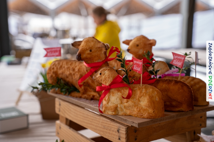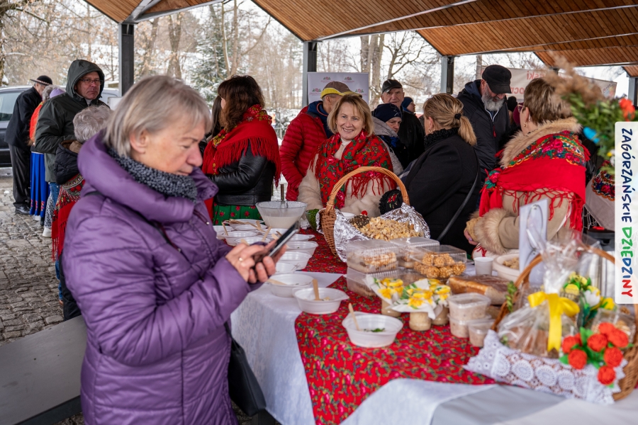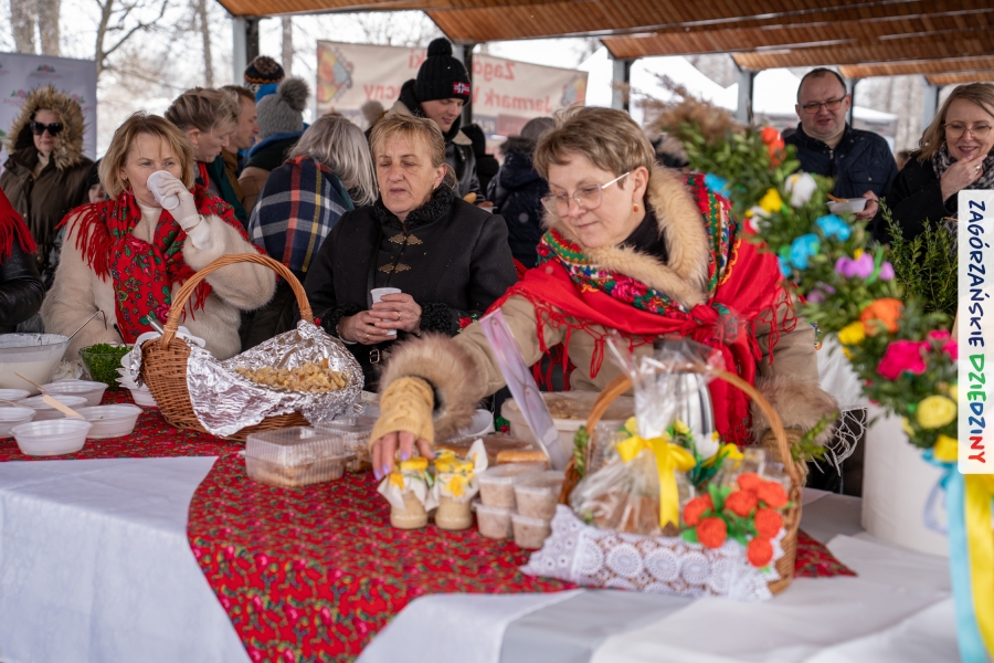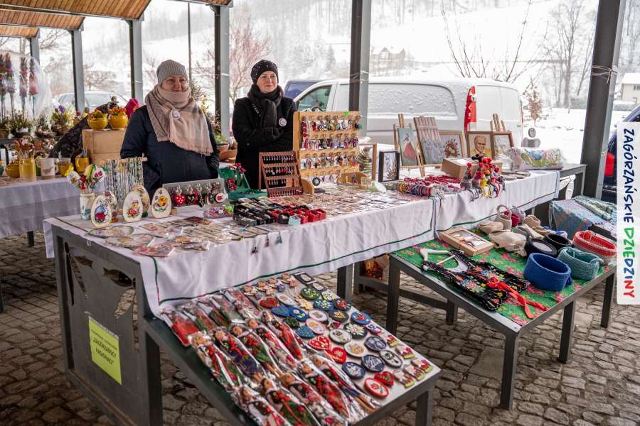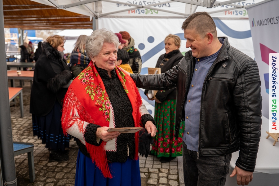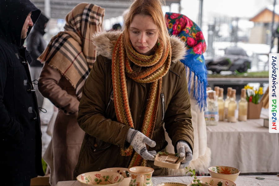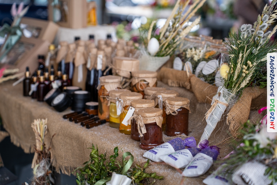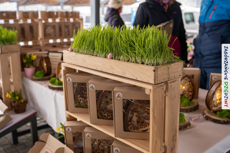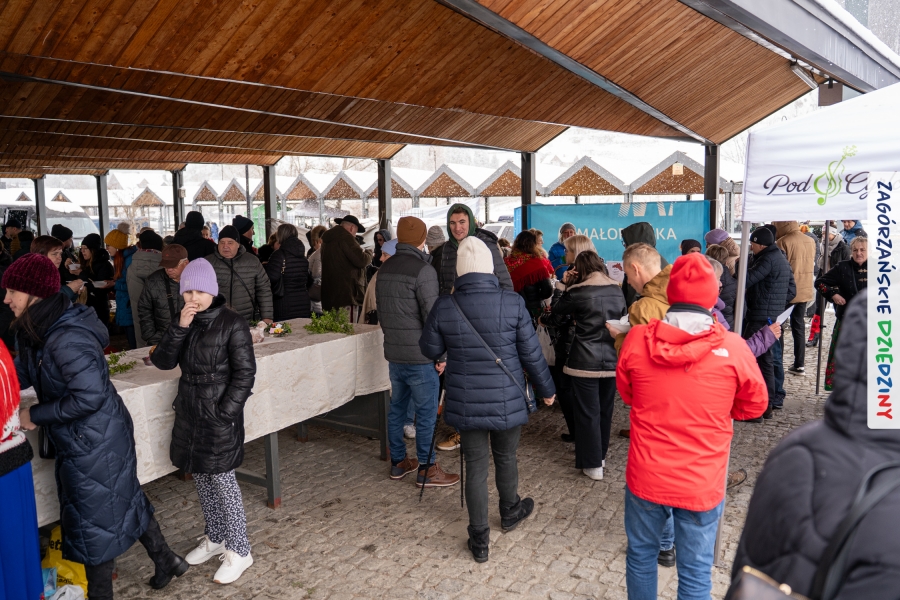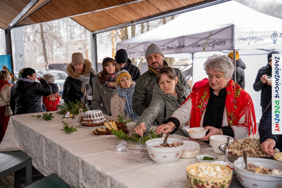 A to dopiero połowa listy! Posiadacze Znaku Promocyjnego Zagórzańskie Dziedziny stanowili mocny zespół, który w tym roku poszerzył się o kolejne nadania. Stoiskiem gastronomicznym z wielkanocnym żurkiem zarządzała rodzina Kościelniaków; to właśnie tam można było zakupić zarówno produkowany w mszańskiej octowni zagórzański żurek i ocet, ale także drożdżowe barany i kolorowe mazurki. Co więcej, nasza licencjonowana Baca w spódnicy, czyli Monika Kościelniak, przywiozła ze sobą swoje najmłodsze pociechy – młode baranki, wśród których serce skradł najmniejszy, Maniek. Wokół ich niewielkiej zagrody zrobiło się zielono i soczyście – to dzięki współpracy z firmą „Lux trawka” mieliśmy możliwość doświadczyć zielonego trawnika w ten śnieżny dzień. Miody od Moniki i Piotra Woźniaków dzięki wielu nagrodom mają swoich nabywców, a do tego sery od Moniki Kubik pasują jak ulał! Co więcej, na tym stoisku zawsze zaskoczy nas jakaś nowość! Tym razem były to serowe paluchy w różnych smakach. Widzieliście wielkanocne propozycje pierników od Gosi Suder? Aż żal będzie je zjeść, tak cieszą oko i zachwycają! Miodu u nas dostatek, wszak drugim, zagórzańskim, dostawcą tego produktu jest Józef Bierowiec, który również pojawił się na jarmarku dotrzymując towarzystwa naszej szydełkowej królowej, Zosi Piętoń. Ślinka ciekła jeszcze bardziej, gdy docieraliśmy na stoisko Moniki Kołodziej vel Cukiernia Babeczka. Ona miała świąteczną ofertę przeróżnych wypieków, wszystko w wielkanocnej aranżacji! Zawsze uśmiechnięta i radosna, Stanisława Blacharczyk, z równie sympatycznym mężem – Janem, na jarmark przywiozła barany – drożdżowe! i te „gołe” i te ubrane w biały, bezowy kożuszek, szybko znalazły nowych właścicieli. Nasze artystki - specjalistki od misternej i dokładnej pracy również mogły zaprezentować swój kunszt. Każdy Drzewniany łobrozek Józi Potaczek, to dopracowana w każdym detalu piękna, uduchowiona twórczość, a Sznurkowe Perełki - koszyczki do święcenia, czapeczki na jajka, okazjonalne dekoracje, pudełka czy zabawki – wszystko to szydełkowa robota. Nie mogło też zabraknąć palm wielkanocnych wykonanych przez Marię Bolisęgę, jak i produktów „Nie z Galerii” oraz dzieł Gabrysi vel Elondi. To właśnie one poszerzyły nasze „markowe grono”. Dziewczyny z Węglówki przywiozły ze sobą sporą ilość przeróżnego rękodzieła, ale nam wzrok uciekał w stronę fantastycznych, turystycznych poduszek. Cieszymy się ogromnie, że zawsze jest z nami Paulina Hanula z całym swoim asortymentem zawierającym się w rodzinnej nazwie firmy „Hafthan Konina”. Poza wszelką regionalną konfekcją i galanterią skórzaną polecamy ciepłe skarpety, które uratowały niejedne zimne nóżki w ten dzień. Na koniec zostawiamy sobie opis stoiska, które wyjątkowo nas urzekło, a należało do naszych przyjaciół, Karoliny i Filipa z „Pora na wycieczkę”. Okazuje się, że ta para ma talent nie tylko do turystycznych wypraw, ale całkiem nieźle radzą sobie w dekoracjach. Drewniana sklejka, naturalny materiał z pięknym świątecznym wzorem, zapakowany w pudełko, zachwycał swoją prostotą, a dodatkowo świecił i przepięknie wyglądał na drewnianej paterze z zielonym mchem chrobotkiem między dekoracją z wysianego owsa.