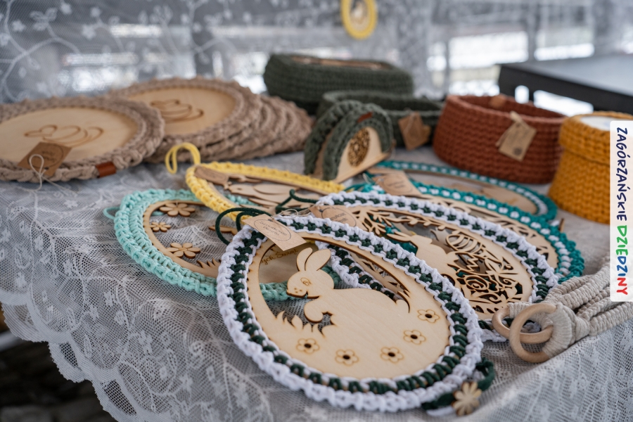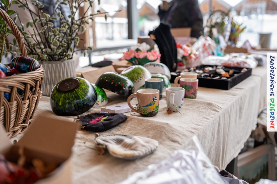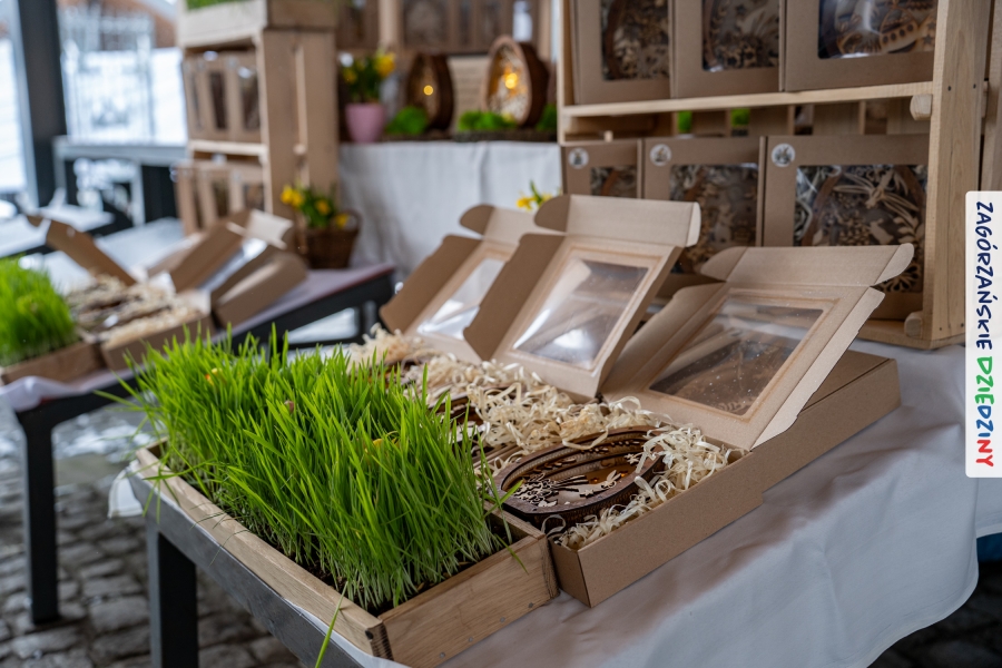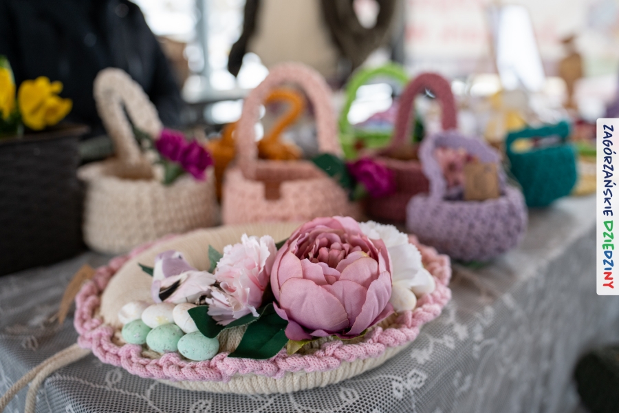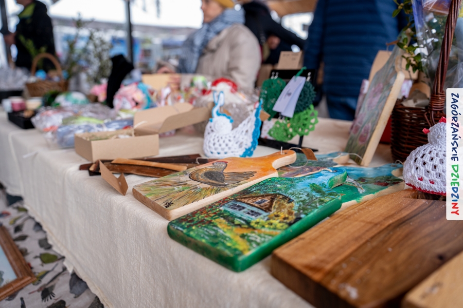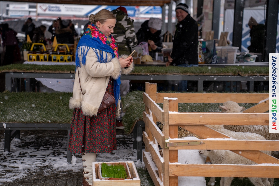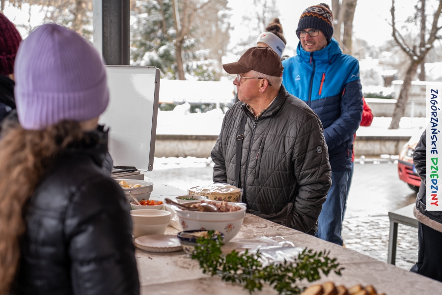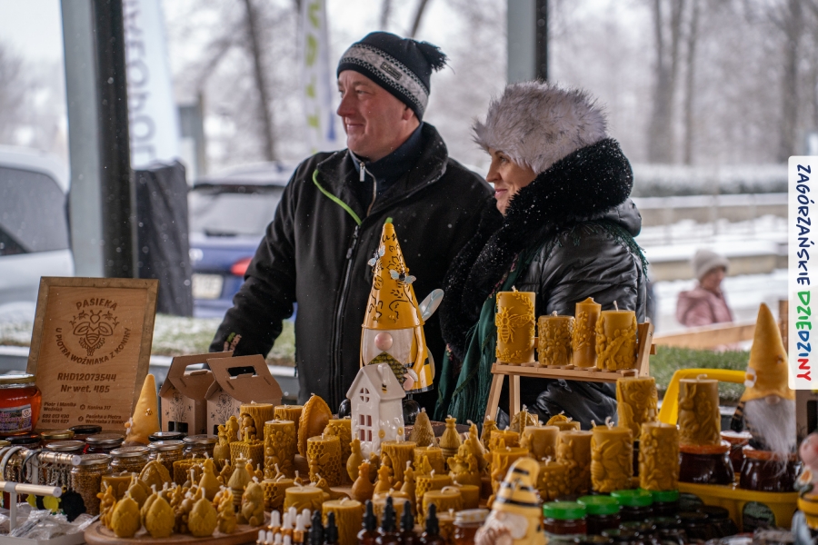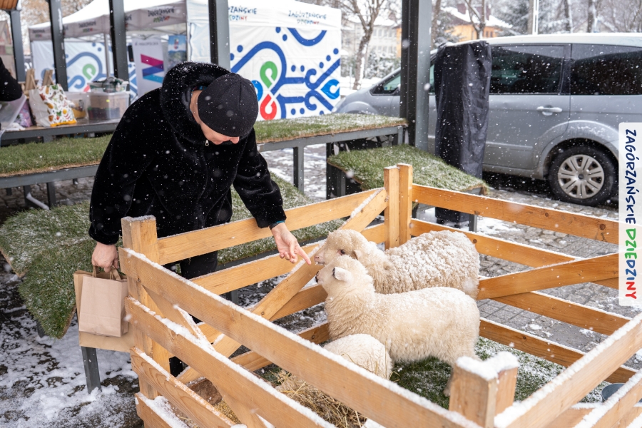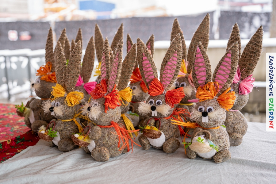 A to dopiero połowa listy! Posiadacze Znaku Promocyjnego Zagórzańskie Dziedziny stanowili mocny zespół, który w tym roku poszerzył się o kolejne nadania. Stoiskiem gastronomicznym z wielkanocnym żurkiem zarządzała rodzina Kościelniaków; to właśnie tam można było zakupić zarówno produkowany w mszańskiej octowni zagórzański żurek i ocet, ale także drożdżowe barany i kolorowe mazurki. Co więcej, nasza licencjonowana Baca w spódnicy, czyli Monika Kościelniak, przywiozła ze sobą swoje najmłodsze pociechy – młode baranki, wśród których serce skradł najmniejszy, Maniek. Wokół ich niewielkiej zagrody zrobiło się zielono i soczyście – to dzięki współpracy z firmą „Lux trawka” mieliśmy możliwość doświadczyć zielonego trawnika w ten śnieżny dzień. Miody od Moniki i Piotra Woźniaków dzięki wielu nagrodom mają swoich nabywców, a do tego sery od Moniki Kubik pasują jak ulał! Co więcej, na tym stoisku zawsze zaskoczy nas jakaś nowość! Tym razem były to serowe paluchy w różnych smakach. Widzieliście wielkanocne propozycje pierników od Gosi Suder? Aż żal będzie je zjeść, tak cieszą oko i zachwycają! Miodu u nas dostatek, wszak drugim, zagórzańskim, dostawcą tego produktu jest Józef Bierowiec, który również pojawił się na jarmarku dotrzymując towarzystwa naszej szydełkowej królowej, Zosi Piętoń. Ślinka ciekła jeszcze bardziej, gdy docieraliśmy na stoisko Moniki Kołodziej vel Cukiernia Babeczka. Ona miała świąteczną ofertę przeróżnych wypieków, wszystko w wielkanocnej aranżacji! Zawsze uśmiechnięta i radosna, Stanisława Blacharczyk, z równie sympatycznym mężem – Janem, na jarmark przywiozła barany – drożdżowe! i te „gołe” i te ubrane w biały, bezowy kożuszek, szybko znalazły nowych właścicieli. Nasze artystki - specjalistki od misternej i dokładnej pracy również mogły zaprezentować swój kunszt. Każdy Drzewniany łobrozek Józi Potaczek, to dopracowana w każdym detalu piękna, uduchowiona twórczość, a Sznurkowe Perełki - koszyczki do święcenia, czapeczki na jajka, okazjonalne dekoracje, pudełka czy zabawki – wszystko to szydełkowa robota. Nie mogło też zabraknąć palm wielkanocnych wykonanych przez Marię Bolisęgę, jak i produktów „Nie z Galerii” oraz dzieł Gabrysi vel Elondi. To właśnie one poszerzyły nasze „markowe grono”. Dziewczyny z Węglówki przywiozły ze sobą sporą ilość przeróżnego rękodzieła, ale nam wzrok uciekał w stronę fantastycznych, turystycznych poduszek. Cieszymy się ogromnie, że zawsze jest z nami Paulina Hanula z całym swoim asortymentem zawierającym się w rodzinnej nazwie firmy „Hafthan Konina”. Poza wszelką regionalną konfekcją i galanterią skórzaną polecamy ciepłe skarpety, które uratowały niejedne zimne nóżki w ten dzień. Na koniec zostawiamy sobie opis stoiska, które wyjątkowo nas urzekło, a należało do naszych przyjaciół, Karoliny i Filipa z „Pora na wycieczkę”. Okazuje się, że ta para ma talent nie tylko do turystycznych wypraw, ale całkiem nieźle radzą sobie w dekoracjach. Drewniana sklejka, naturalny materiał z pięknym świątecznym wzorem, zapakowany w pudełko, zachwycał swoją prostotą, a dodatkowo świecił i przepięknie wyglądał na drewnianej paterze z zielonym mchem chrobotkiem między dekoracją z wysianego owsa.