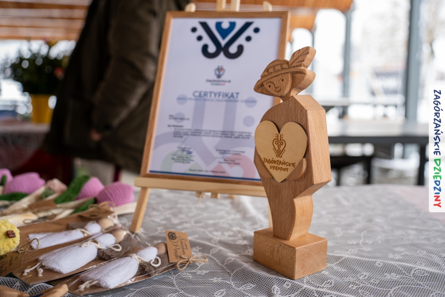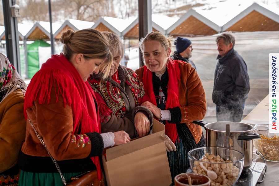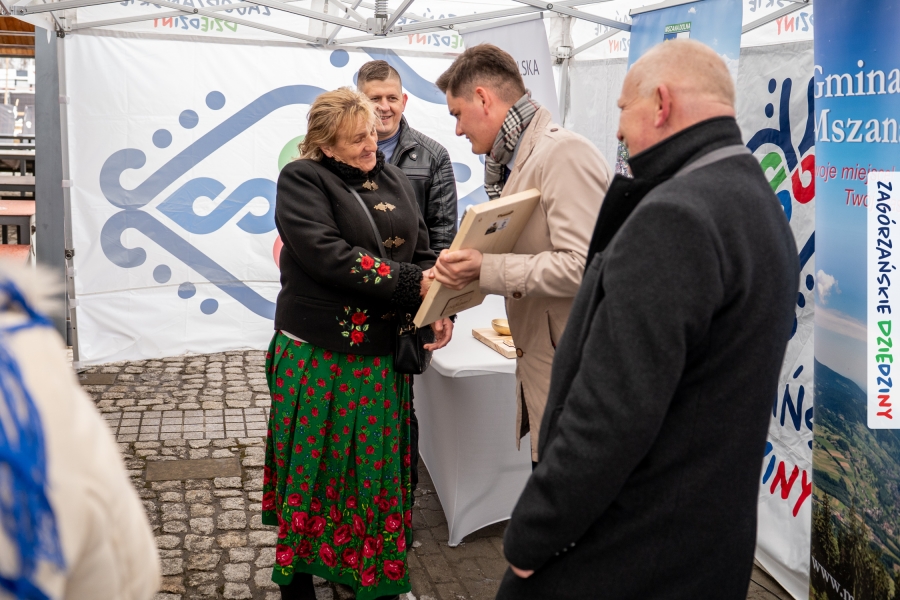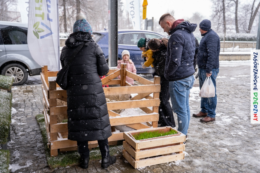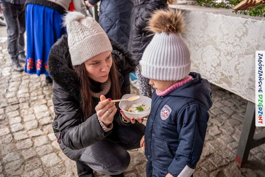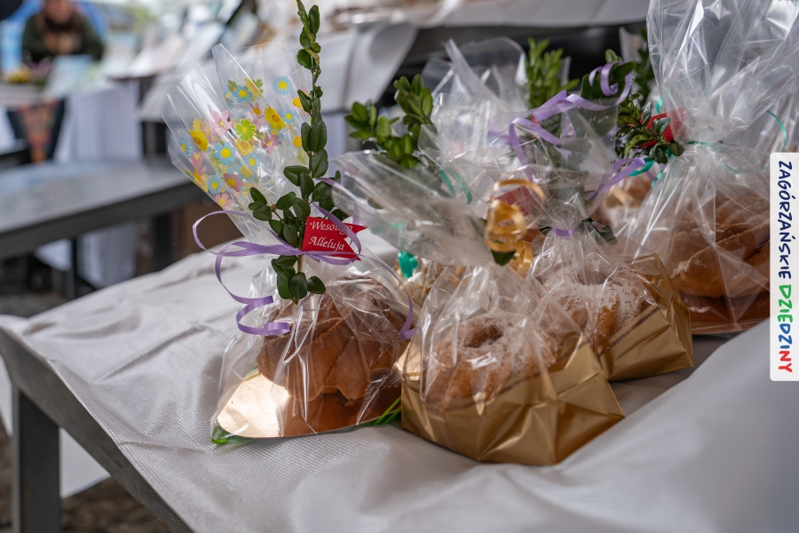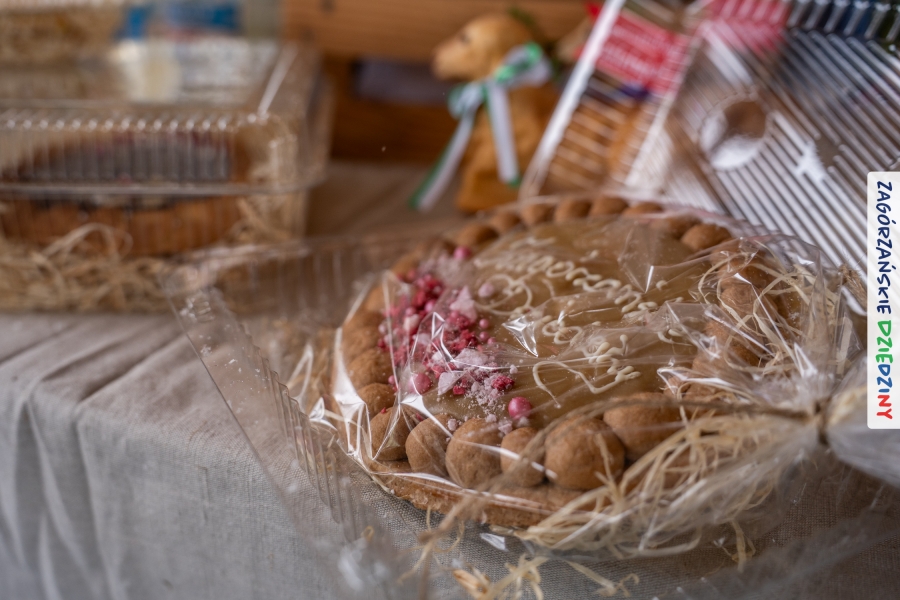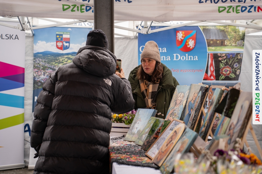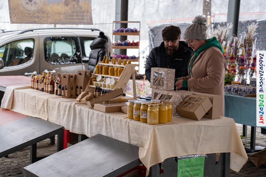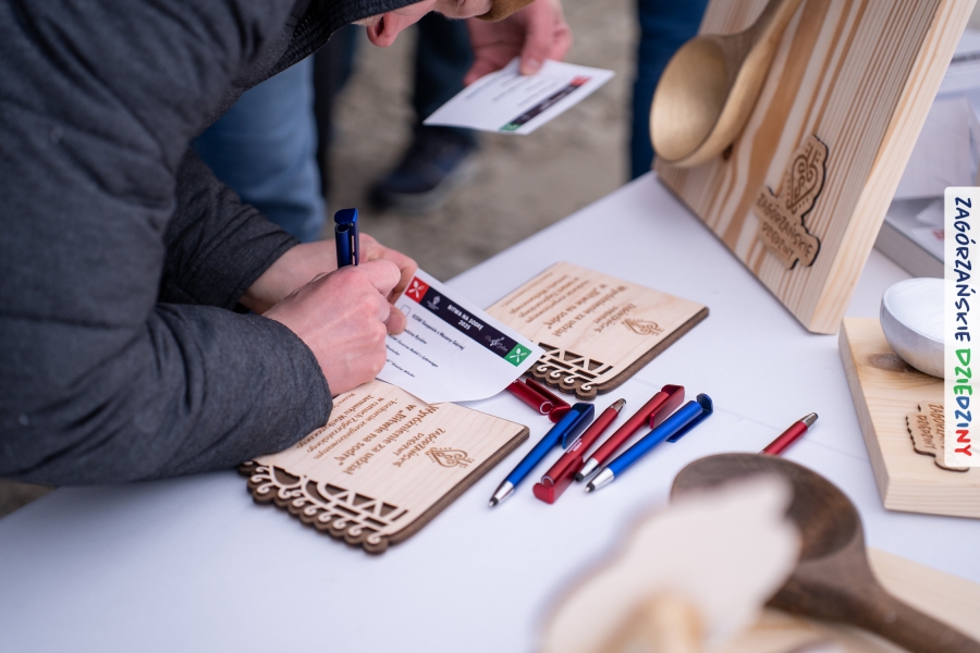 A to dopiero połowa listy! Posiadacze Znaku Promocyjnego Zagórzańskie Dziedziny stanowili mocny zespół, który w tym roku poszerzył się o kolejne nadania. Stoiskiem gastronomicznym z wielkanocnym żurkiem zarządzała rodzina Kościelniaków; to właśnie tam można było zakupić zarówno produkowany w mszańskiej octowni zagórzański żurek i ocet, ale także drożdżowe barany i kolorowe mazurki. Co więcej, nasza licencjonowana Baca w spódnicy, czyli Monika Kościelniak, przywiozła ze sobą swoje najmłodsze pociechy – młode baranki, wśród których serce skradł najmniejszy, Maniek. Wokół ich niewielkiej zagrody zrobiło się zielono i soczyście – to dzięki współpracy z firmą „Lux trawka” mieliśmy możliwość doświadczyć zielonego trawnika w ten śnieżny dzień. Miody od Moniki i Piotra Woźniaków dzięki wielu nagrodom mają swoich nabywców, a do tego sery od Moniki Kubik pasują jak ulał! Co więcej, na tym stoisku zawsze zaskoczy nas jakaś nowość! Tym razem były to serowe paluchy w różnych smakach. Widzieliście wielkanocne propozycje pierników od Gosi Suder? Aż żal będzie je zjeść, tak cieszą oko i zachwycają! Miodu u nas dostatek, wszak drugim, zagórzańskim, dostawcą tego produktu jest Józef Bierowiec, który również pojawił się na jarmarku dotrzymując towarzystwa naszej szydełkowej królowej, Zosi Piętoń. Ślinka ciekła jeszcze bardziej, gdy docieraliśmy na stoisko Moniki Kołodziej vel Cukiernia Babeczka. Ona miała świąteczną ofertę przeróżnych wypieków, wszystko w wielkanocnej aranżacji! Zawsze uśmiechnięta i radosna, Stanisława Blacharczyk, z równie sympatycznym mężem – Janem, na jarmark przywiozła barany – drożdżowe! i te „gołe” i te ubrane w biały, bezowy kożuszek, szybko znalazły nowych właścicieli. Nasze artystki - specjalistki od misternej i dokładnej pracy również mogły zaprezentować swój kunszt. Każdy Drzewniany łobrozek Józi Potaczek, to dopracowana w każdym detalu piękna, uduchowiona twórczość, a Sznurkowe Perełki - koszyczki do święcenia, czapeczki na jajka, okazjonalne dekoracje, pudełka czy zabawki – wszystko to szydełkowa robota. Nie mogło też zabraknąć palm wielkanocnych wykonanych przez Marię Bolisęgę, jak i produktów „Nie z Galerii” oraz dzieł Gabrysi vel Elondi. To właśnie one poszerzyły nasze „markowe grono”. Dziewczyny z Węglówki przywiozły ze sobą sporą ilość przeróżnego rękodzieła, ale nam wzrok uciekał w stronę fantastycznych, turystycznych poduszek. Cieszymy się ogromnie, że zawsze jest z nami Paulina Hanula z całym swoim asortymentem zawierającym się w rodzinnej nazwie firmy „Hafthan Konina”. Poza wszelką regionalną konfekcją i galanterią skórzaną polecamy ciepłe skarpety, które uratowały niejedne zimne nóżki w ten dzień. Na koniec zostawiamy sobie opis stoiska, które wyjątkowo nas urzekło, a należało do naszych przyjaciół, Karoliny i Filipa z „Pora na wycieczkę”. Okazuje się, że ta para ma talent nie tylko do turystycznych wypraw, ale całkiem nieźle radzą sobie w dekoracjach. Drewniana sklejka, naturalny materiał z pięknym świątecznym wzorem, zapakowany w pudełko, zachwycał swoją prostotą, a dodatkowo świecił i przepięknie wyglądał na drewnianej paterze z zielonym mchem chrobotkiem między dekoracją z wysianego owsa.