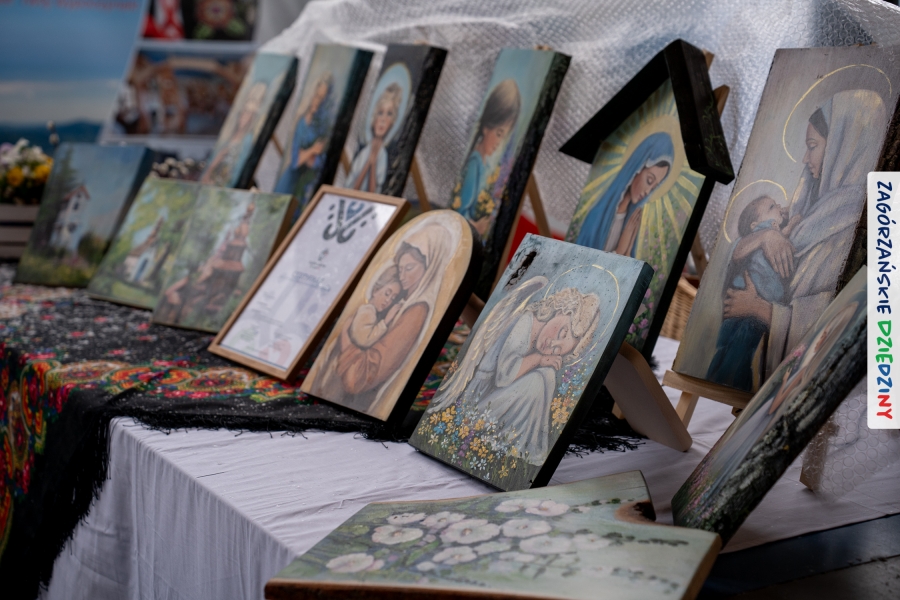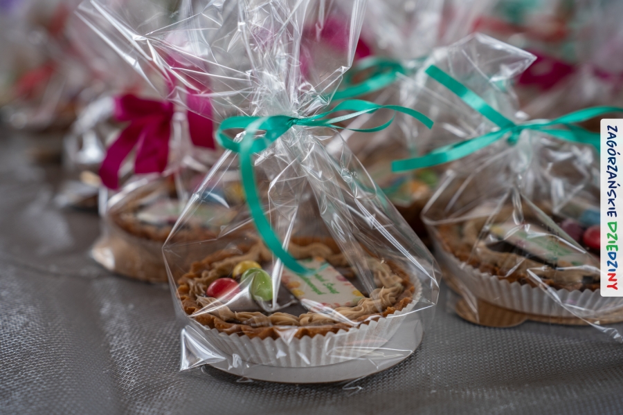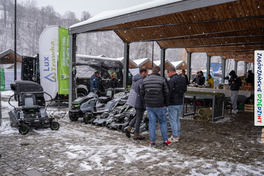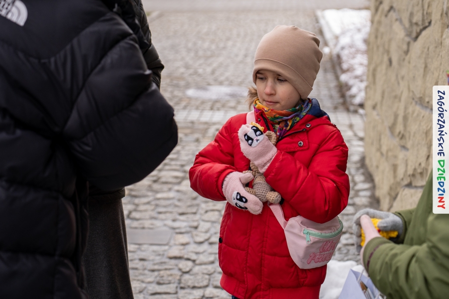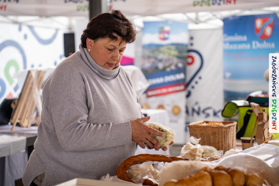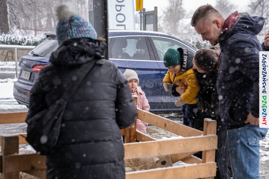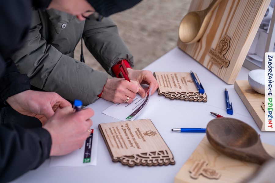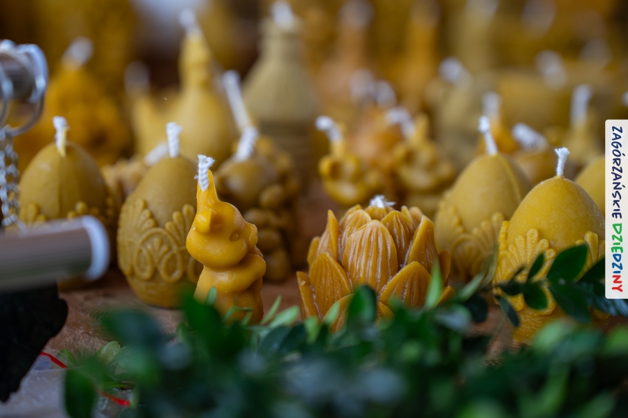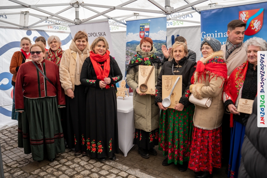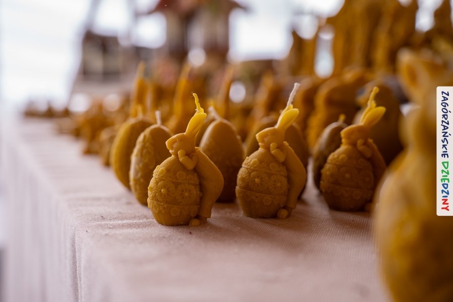 A to dopiero połowa listy! Posiadacze Znaku Promocyjnego Zagórzańskie Dziedziny stanowili mocny zespół, który w tym roku poszerzył się o kolejne nadania. Stoiskiem gastronomicznym z wielkanocnym żurkiem zarządzała rodzina Kościelniaków; to właśnie tam można było zakupić zarówno produkowany w mszańskiej octowni zagórzański żurek i ocet, ale także drożdżowe barany i kolorowe mazurki. Co więcej, nasza licencjonowana Baca w spódnicy, czyli Monika Kościelniak, przywiozła ze sobą swoje najmłodsze pociechy – młode baranki, wśród których serce skradł najmniejszy, Maniek. Wokół ich niewielkiej zagrody zrobiło się zielono i soczyście – to dzięki współpracy z firmą „Lux trawka” mieliśmy możliwość doświadczyć zielonego trawnika w ten śnieżny dzień. Miody od Moniki i Piotra Woźniaków dzięki wielu nagrodom mają swoich nabywców, a do tego sery od Moniki Kubik pasują jak ulał! Co więcej, na tym stoisku zawsze zaskoczy nas jakaś nowość! Tym razem były to serowe paluchy w różnych smakach. Widzieliście wielkanocne propozycje pierników od Gosi Suder? Aż żal będzie je zjeść, tak cieszą oko i zachwycają! Miodu u nas dostatek, wszak drugim, zagórzańskim, dostawcą tego produktu jest Józef Bierowiec, który również pojawił się na jarmarku dotrzymując towarzystwa naszej szydełkowej królowej, Zosi Piętoń. Ślinka ciekła jeszcze bardziej, gdy docieraliśmy na stoisko Moniki Kołodziej vel Cukiernia Babeczka. Ona miała świąteczną ofertę przeróżnych wypieków, wszystko w wielkanocnej aranżacji! Zawsze uśmiechnięta i radosna, Stanisława Blacharczyk, z równie sympatycznym mężem – Janem, na jarmark przywiozła barany – drożdżowe! i te „gołe” i te ubrane w biały, bezowy kożuszek, szybko znalazły nowych właścicieli. Nasze artystki - specjalistki od misternej i dokładnej pracy również mogły zaprezentować swój kunszt. Każdy Drzewniany łobrozek Józi Potaczek, to dopracowana w każdym detalu piękna, uduchowiona twórczość, a Sznurkowe Perełki - koszyczki do święcenia, czapeczki na jajka, okazjonalne dekoracje, pudełka czy zabawki – wszystko to szydełkowa robota. Nie mogło też zabraknąć palm wielkanocnych wykonanych przez Marię Bolisęgę, jak i produktów „Nie z Galerii” oraz dzieł Gabrysi vel Elondi. To właśnie one poszerzyły nasze „markowe grono”. Dziewczyny z Węglówki przywiozły ze sobą sporą ilość przeróżnego rękodzieła, ale nam wzrok uciekał w stronę fantastycznych, turystycznych poduszek. Cieszymy się ogromnie, że zawsze jest z nami Paulina Hanula z całym swoim asortymentem zawierającym się w rodzinnej nazwie firmy „Hafthan Konina”. Poza wszelką regionalną konfekcją i galanterią skórzaną polecamy ciepłe skarpety, które uratowały niejedne zimne nóżki w ten dzień. Na koniec zostawiamy sobie opis stoiska, które wyjątkowo nas urzekło, a należało do naszych przyjaciół, Karoliny i Filipa z „Pora na wycieczkę”. Okazuje się, że ta para ma talent nie tylko do turystycznych wypraw, ale całkiem nieźle radzą sobie w dekoracjach. Drewniana sklejka, naturalny materiał z pięknym świątecznym wzorem, zapakowany w pudełko, zachwycał swoją prostotą, a dodatkowo świecił i przepięknie wyglądał na drewnianej paterze z zielonym mchem chrobotkiem między dekoracją z wysianego owsa.