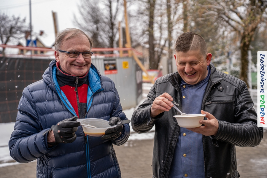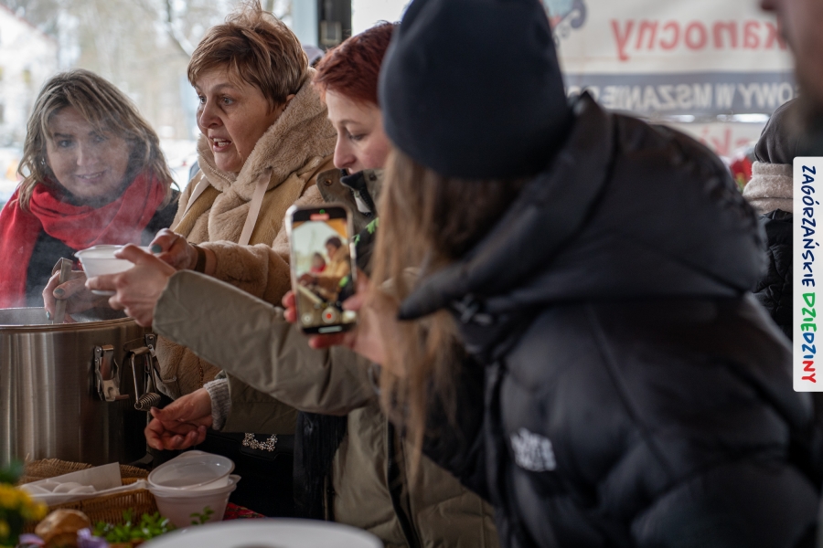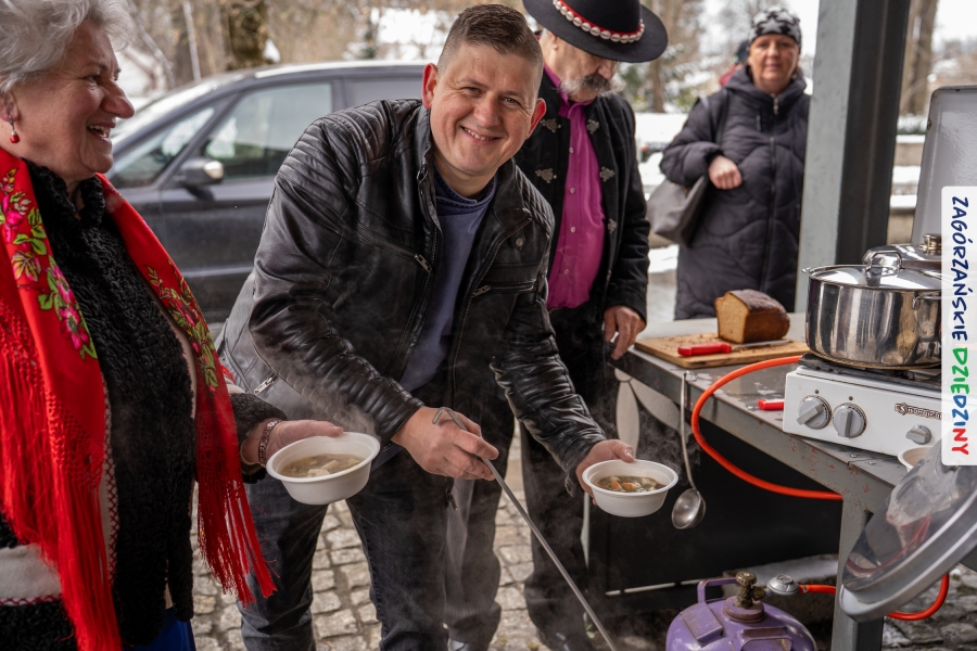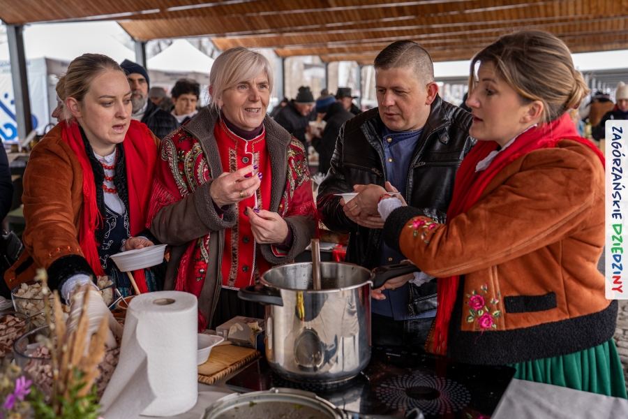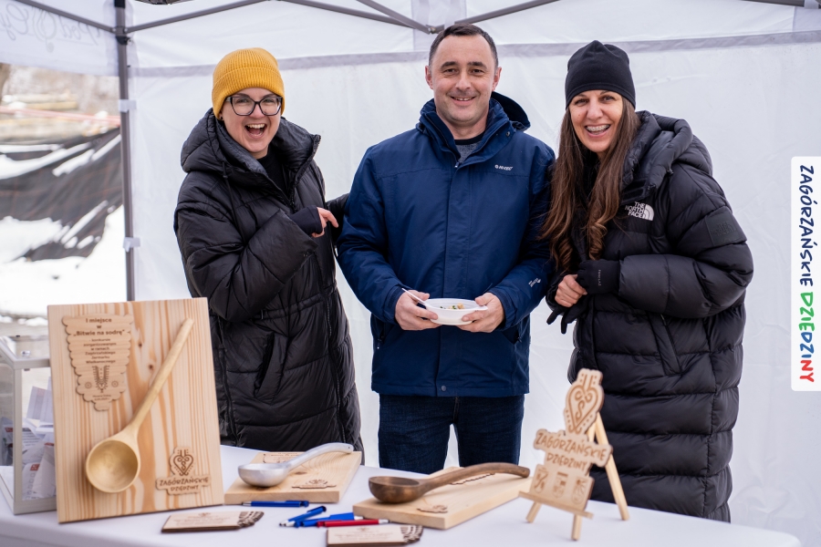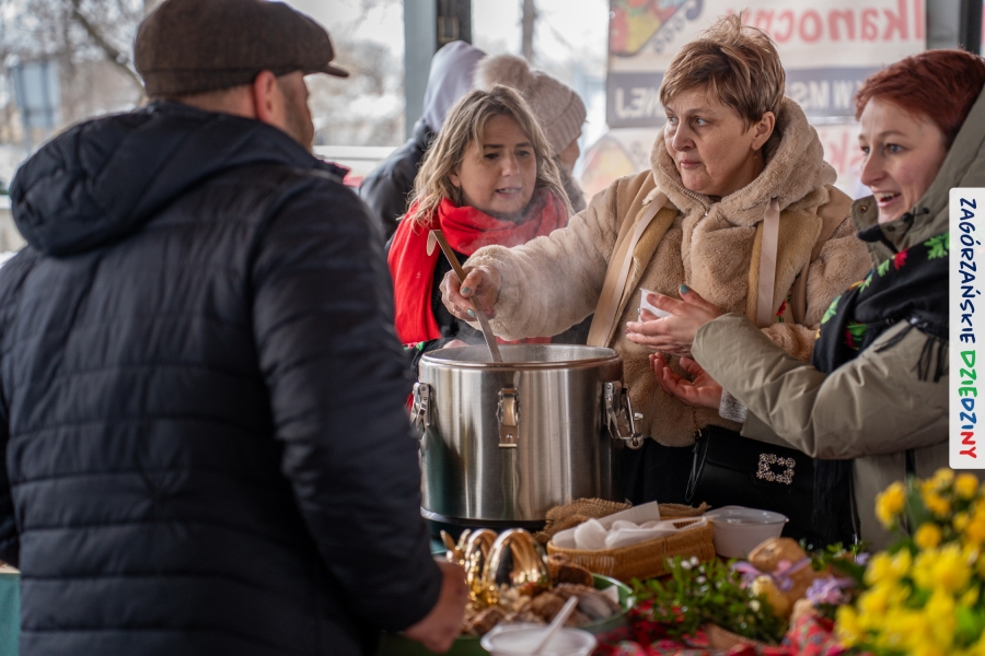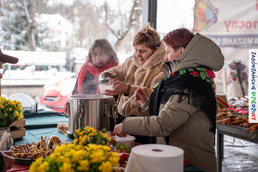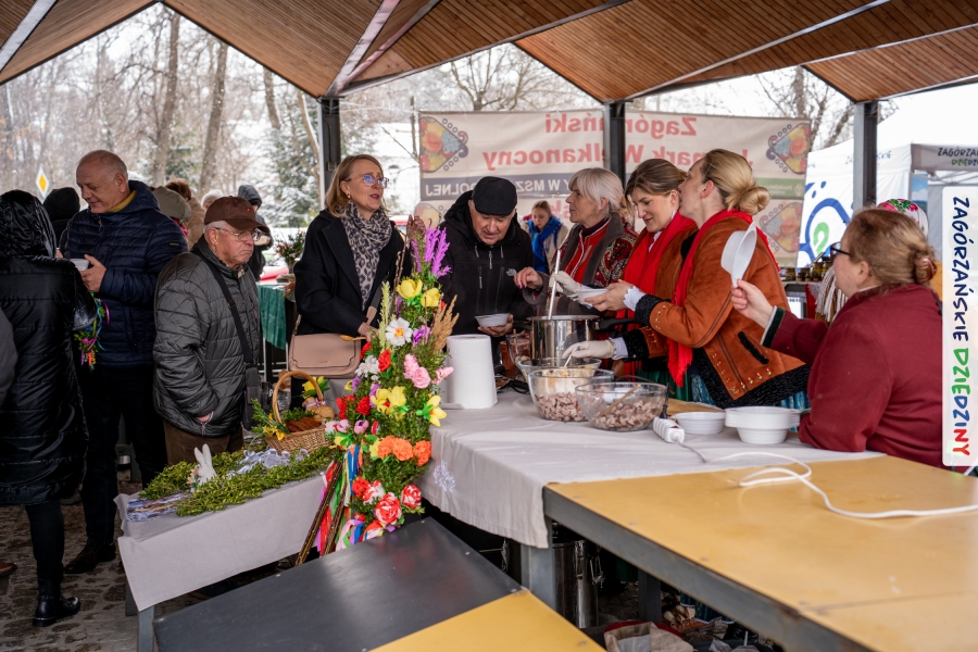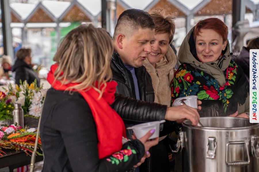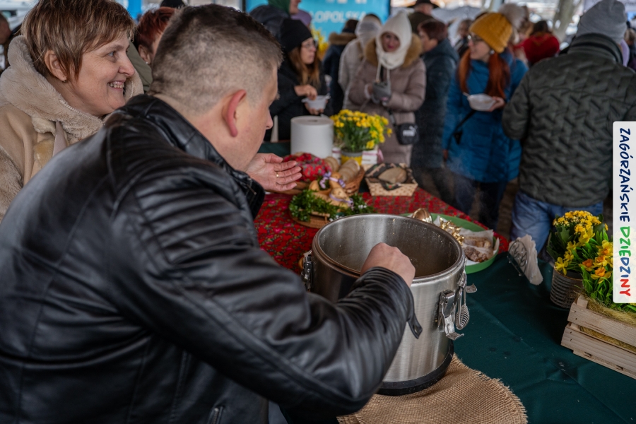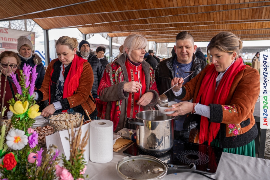Samo oglądanie tych cudowności mogło zmęczyć, nie mówiąc już o zakupach, bo otoczeni taką ilością pięknych rzeczy mieliśmy nie lada problem z podjęciem decyzji. Na placu targowym, jak na ratunek, zaczęły się pojawiać przedstawicielki kół gospodyń… Był to sygnał, że niebawem będzie można się posilić – rozpoczęły się przygotowania do „Bitwy na sodrę”. Na tą okoliczność specjalnie z Krakowa przyjechał Wojciech Winkel, przyjaciel i sympatyk zagórzańskiej marki lokalnej, a z Rabki – Zdroju - Rafał Wójtowicz, Prezes Oddziału PTTK. Obaj panowie mają wspólne turystyczne plany, o których niebawem napiszemy, jednak w pierwszej kolejności skupiliśmy się na tym, by zarówno naszych gości, jak i wszystkich zabranych poczęstować pięcioma propozycjami sodry. Sodra, czyli zupa ze święconki, to tradycyjna potrawa wielkanocna, nawet w naszej okolicy podawana na różne sposoby: na zimno, na ciepło, gotowana na rosole, z wszystkimi poświęconymi produktami z wielkanocnego koszyczka. Chrzan, jajko, kiełbasa, chleb, ser – to wkładka którą można interpretować kulinarnie na różne sposoby. Takich kulinarnych wariacji w tym daniu szukał Paweł Kołodziej – mistrz gastronomii i szef kuchni „Szapo ba”, który zagwarantował naszym gospodyniom warsztaty kulinarne. Nim doszło do ogłoszenia wyników w bitwie, to zgromadzona publiczność musiała ocenić, która sodra jest najlepsza. Ustawiły się więc długie kolejki do każdego ze zgłoszonych zespołów. Głos należał do degustatorów, a głosowanie, prawie tak ważne jak przy wyborach na Prezydenta, wyłoniło ostatecznie najlepszą zupę.