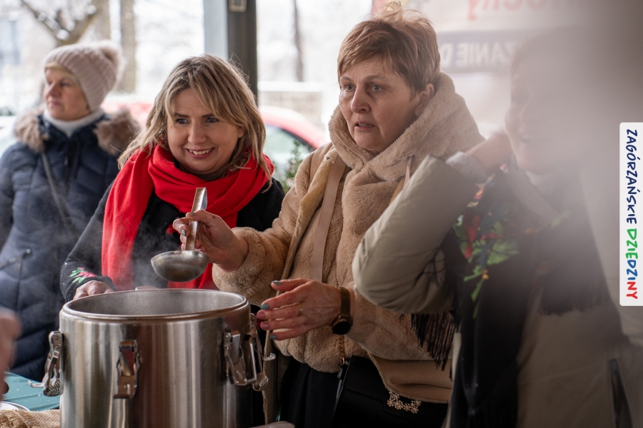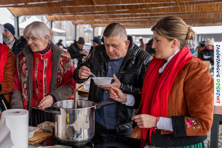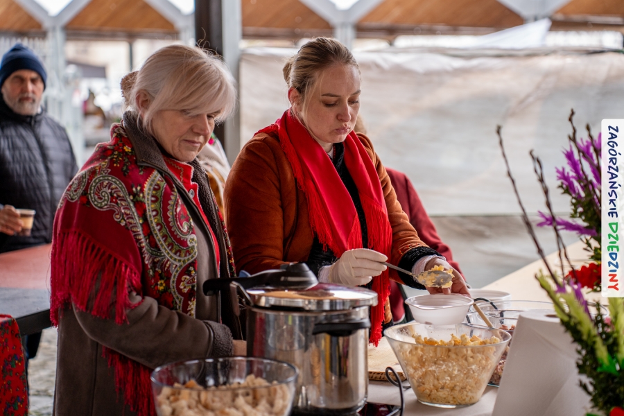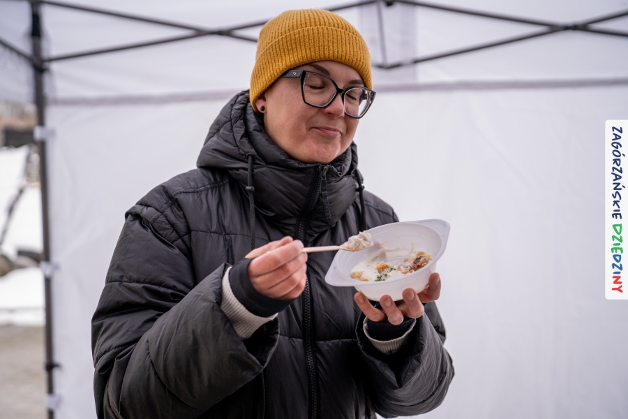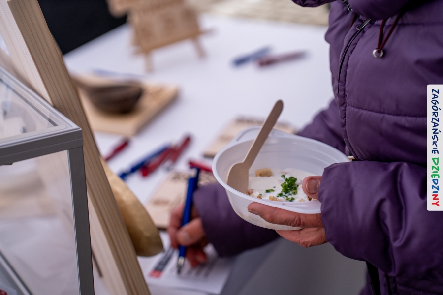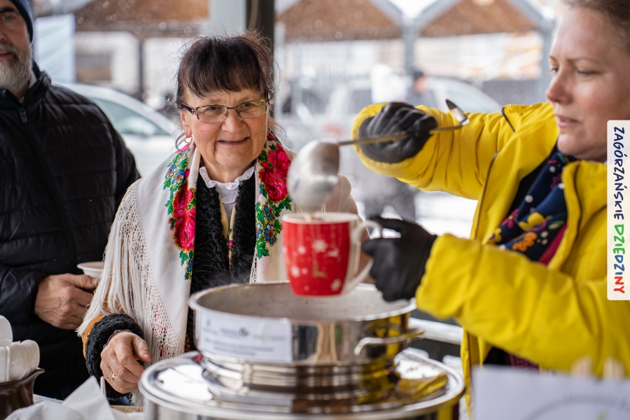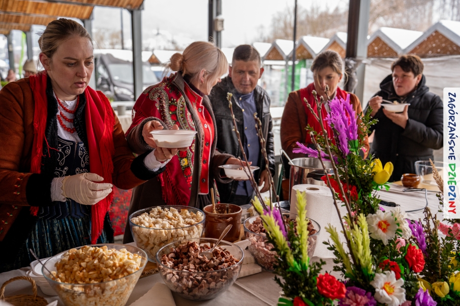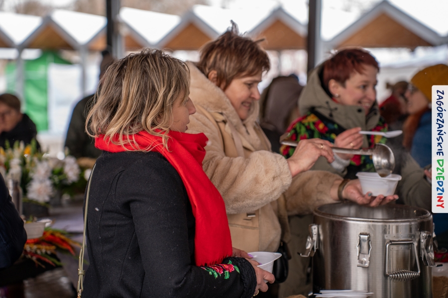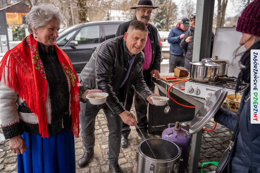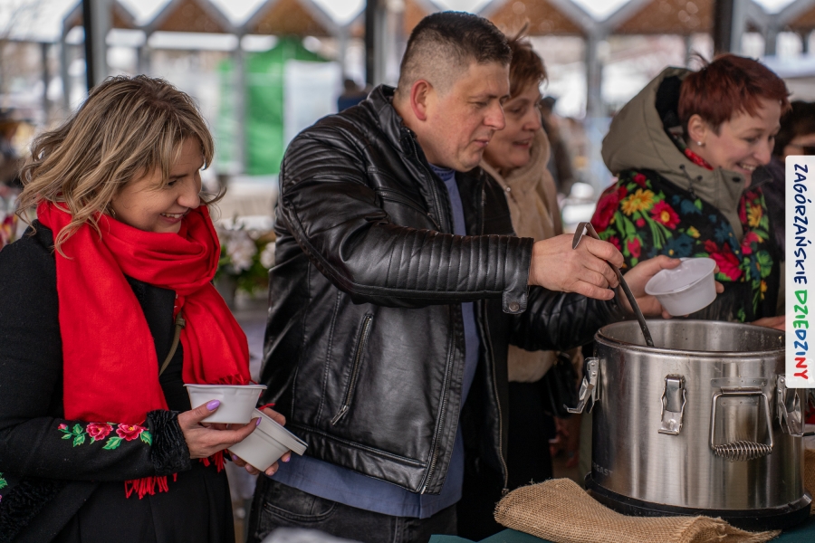 Samo oglądanie tych cudowności mogło zmęczyć, nie mówiąc już o zakupach, bo otoczeni taką ilością pięknych rzeczy mieliśmy nie lada problem z podjęciem decyzji. Na placu targowym, jak na ratunek, zaczęły się pojawiać przedstawicielki kół gospodyń… Był to sygnał, że niebawem będzie można się posilić – rozpoczęły się przygotowania do „Bitwy na sodrę”. Na tą okoliczność specjalnie z Krakowa przyjechał Wojciech Winkel, przyjaciel i sympatyk zagórzańskiej marki lokalnej, a z Rabki – Zdroju - Rafał Wójtowicz, Prezes Oddziału PTTK. Obaj panowie mają wspólne turystyczne plany, o których niebawem napiszemy, jednak w pierwszej kolejności skupiliśmy się na tym, by zarówno naszych gości, jak i wszystkich zabranych poczęstować pięcioma propozycjami sodry. Sodra, czyli zupa ze święconki, to tradycyjna potrawa wielkanocna, nawet w naszej okolicy podawana na różne sposoby: na zimno, na ciepło, gotowana na rosole, z wszystkimi poświęconymi produktami z wielkanocnego koszyczka. Chrzan, jajko, kiełbasa, chleb, ser – to wkładka którą można interpretować kulinarnie na różne sposoby. Takich kulinarnych wariacji w tym daniu szukał Paweł Kołodziej – mistrz gastronomii i szef kuchni „Szapo ba”, który zagwarantował naszym gospodyniom warsztaty kulinarne. Nim doszło do ogłoszenia wyników w bitwie, to zgromadzona publiczność musiała ocenić, która sodra jest najlepsza. Ustawiły się więc długie kolejki do każdego ze zgłoszonych zespołów. Głos należał do degustatorów, a głosowanie, prawie tak ważne jak przy wyborach na Prezydenta, wyłoniło ostatecznie najlepszą zupę.