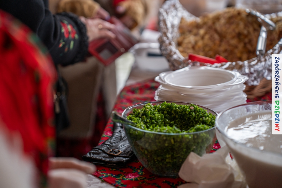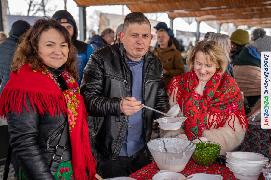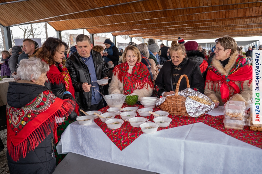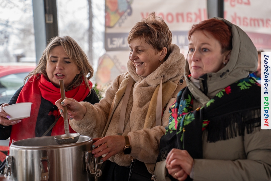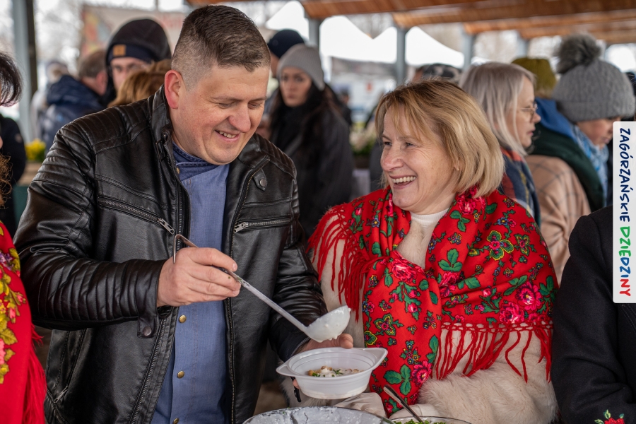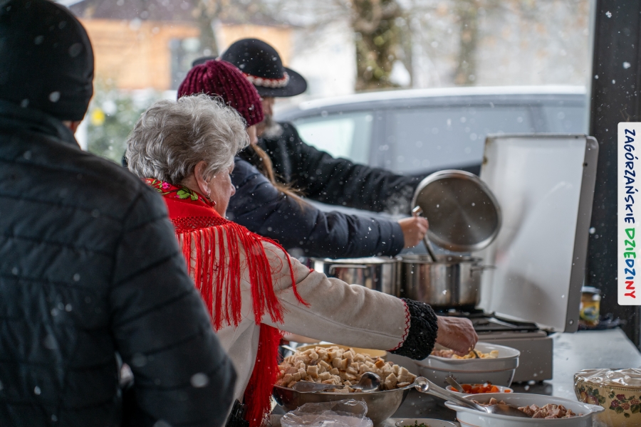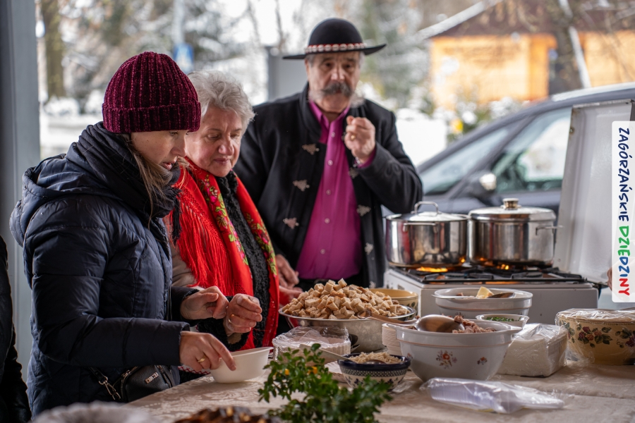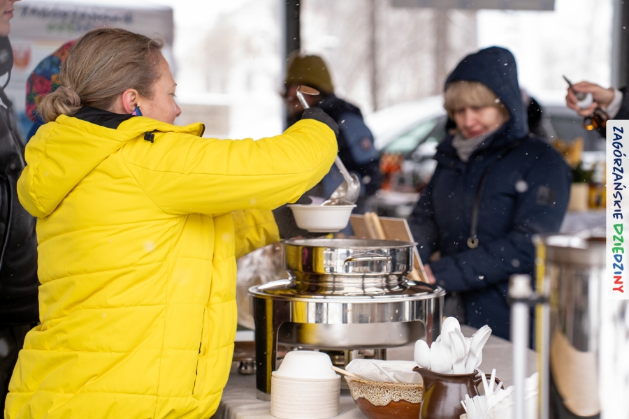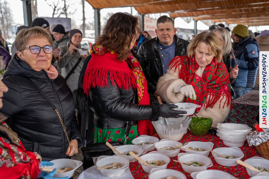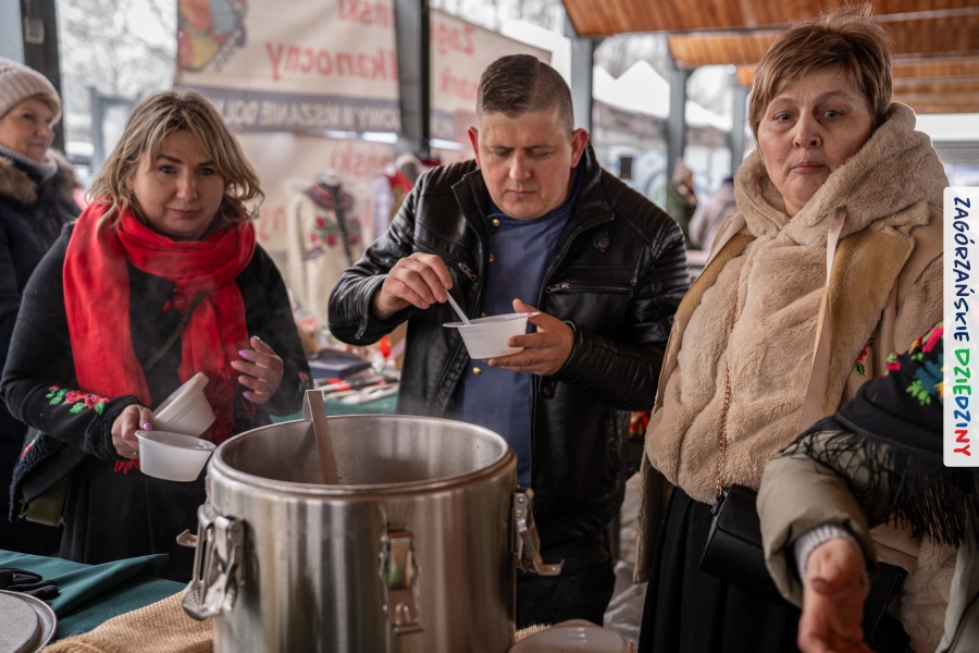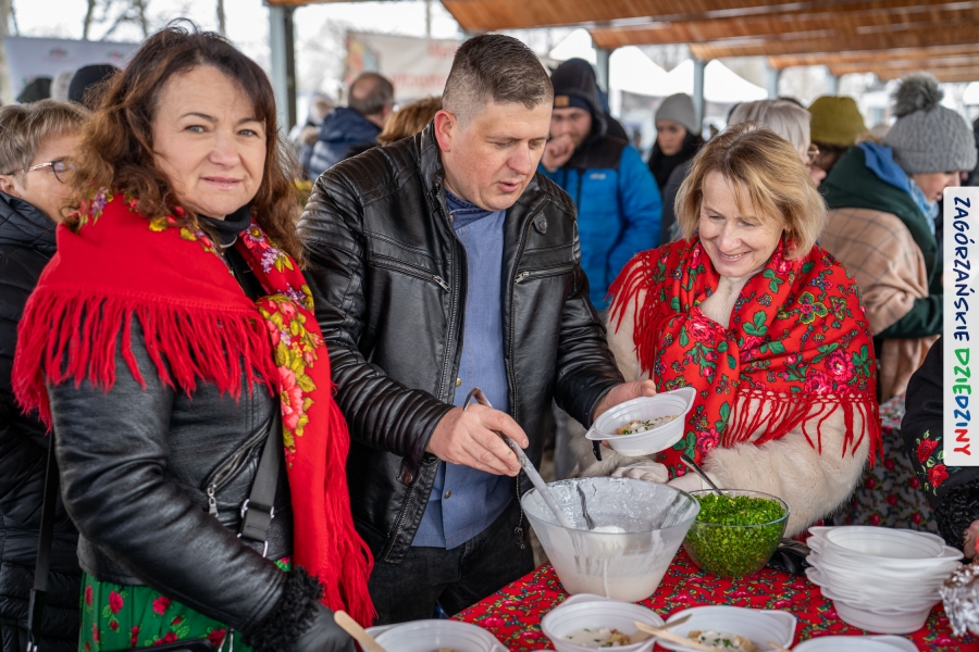 Samo oglądanie tych cudowności mogło zmęczyć, nie mówiąc już o zakupach, bo otoczeni taką ilością pięknych rzeczy mieliśmy nie lada problem z podjęciem decyzji. Na placu targowym, jak na ratunek, zaczęły się pojawiać przedstawicielki kół gospodyń… Był to sygnał, że niebawem będzie można się posilić – rozpoczęły się przygotowania do „Bitwy na sodrę”. Na tą okoliczność specjalnie z Krakowa przyjechał Wojciech Winkel, przyjaciel i sympatyk zagórzańskiej marki lokalnej, a z Rabki – Zdroju - Rafał Wójtowicz, Prezes Oddziału PTTK. Obaj panowie mają wspólne turystyczne plany, o których niebawem napiszemy, jednak w pierwszej kolejności skupiliśmy się na tym, by zarówno naszych gości, jak i wszystkich zabranych poczęstować pięcioma propozycjami sodry. Sodra, czyli zupa ze święconki, to tradycyjna potrawa wielkanocna, nawet w naszej okolicy podawana na różne sposoby: na zimno, na ciepło, gotowana na rosole, z wszystkimi poświęconymi produktami z wielkanocnego koszyczka. Chrzan, jajko, kiełbasa, chleb, ser – to wkładka którą można interpretować kulinarnie na różne sposoby. Takich kulinarnych wariacji w tym daniu szukał Paweł Kołodziej – mistrz gastronomii i szef kuchni „Szapo ba”, który zagwarantował naszym gospodyniom warsztaty kulinarne. Nim doszło do ogłoszenia wyników w bitwie, to zgromadzona publiczność musiała ocenić, która sodra jest najlepsza. Ustawiły się więc długie kolejki do każdego ze zgłoszonych zespołów. Głos należał do degustatorów, a głosowanie, prawie tak ważne jak przy wyborach na Prezydenta, wyłoniło ostatecznie najlepszą zupę.