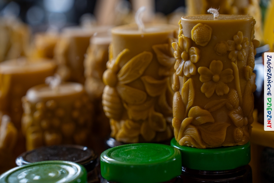 Od razu ruszyliśmy z aparatami, by dokładnie przyjrzeć się propozycjom każdego ze stoisk. Asortyment był naprawdę przebogaty! Niech żałują ci, którym zabrakło odwagi, by wyjść z domu. Pojawiło się kilka stoisk z piękną ceramiką – każda w innym stylu! Silną grupę wystawców „przywiało” z okolic Limanowej, a nawet Krynicy - Zdroju. Pojawiły się dwa stoiska z Bieńkówki z propozycją drewnianych aniołów, drewnianych i sznurkowych torebek, cieszyły oko czekoladowe słodkości, nawet z dubajskimi nowościami, a z Orawy – dokładniej z Lipnicy Małej - przyjechała domowa herbaciarnia. Piękne, woskowe świeczki, miody i zestawy prezentowe, to specjalność zarówno lokalnego Koła Pszczelarzy, jak i Pani Basi, która przyjeżdża do nas z Kamionki Małej. Stoiska zapełniły również stałe bywalczynie jarmarków z okolicy - czy to specjalistki od lawendowych dekoracji, drewnianych ptaszków, dekoracyjnej papeterii, szydełkowych robótek, naturalnych wianków i dekoracji, szydełkowych wyrobów czy palm wielkanocnych…