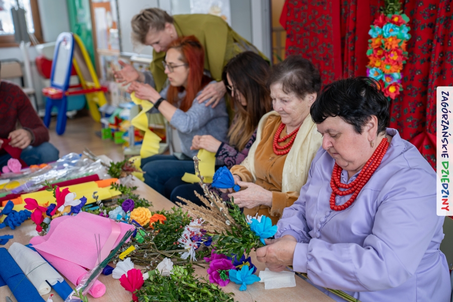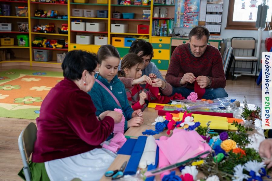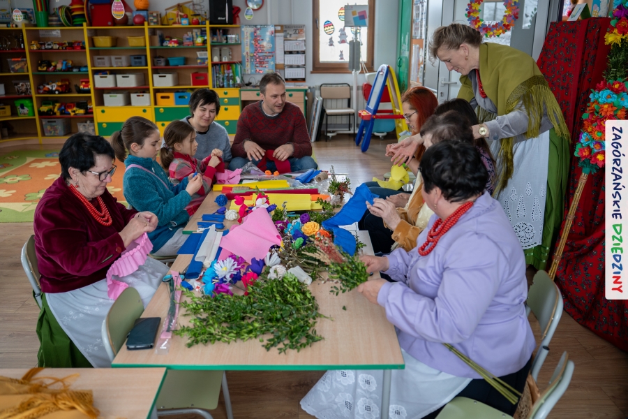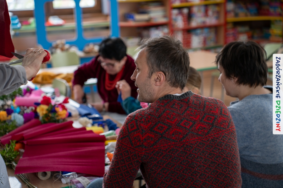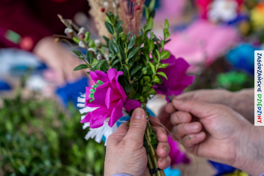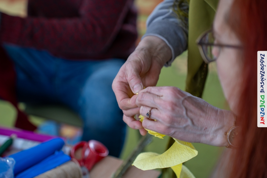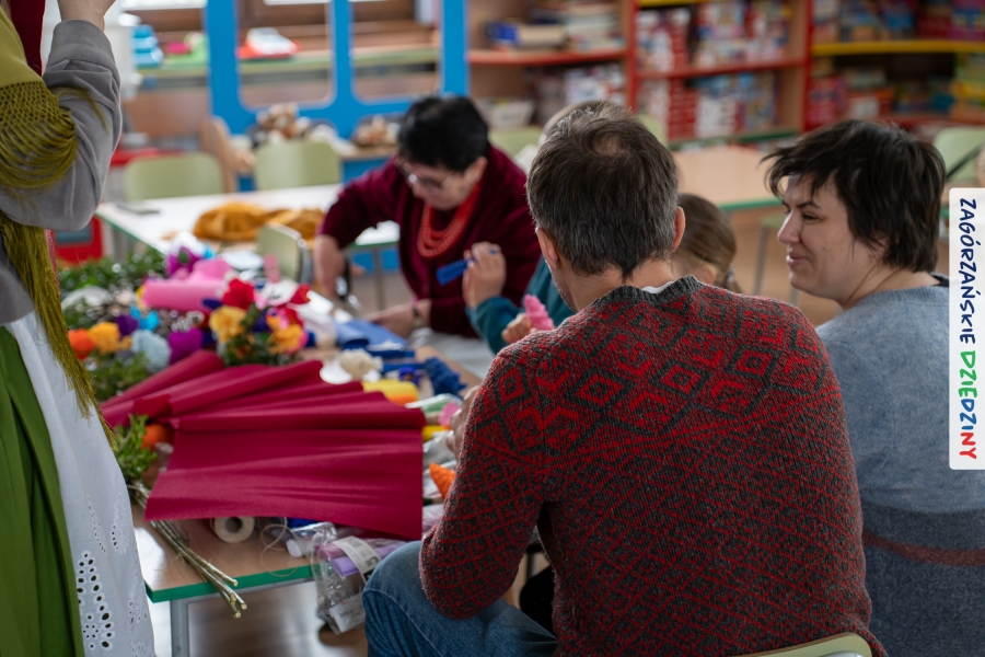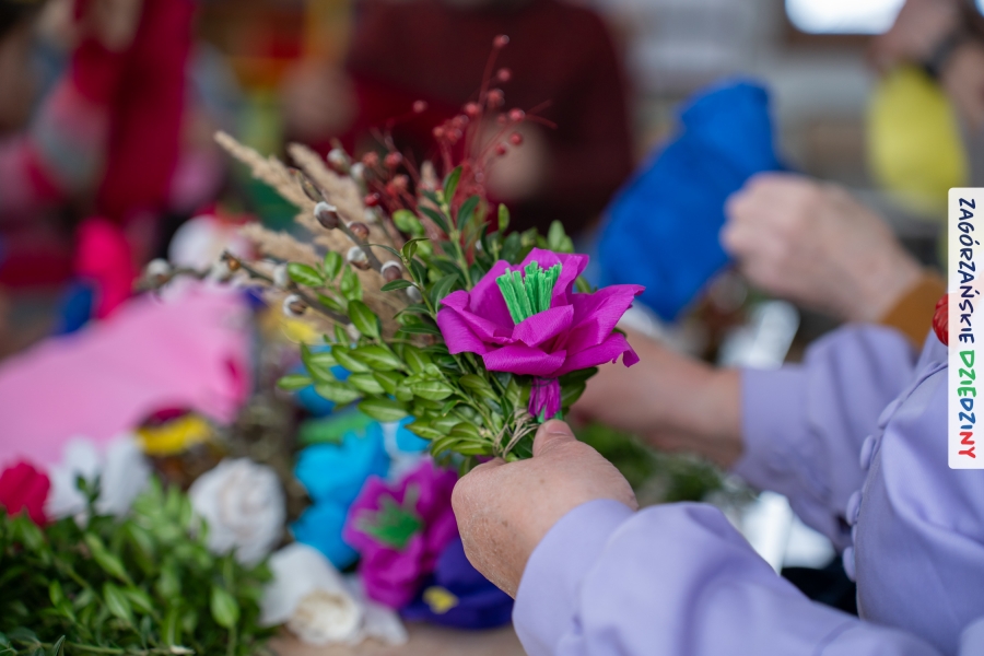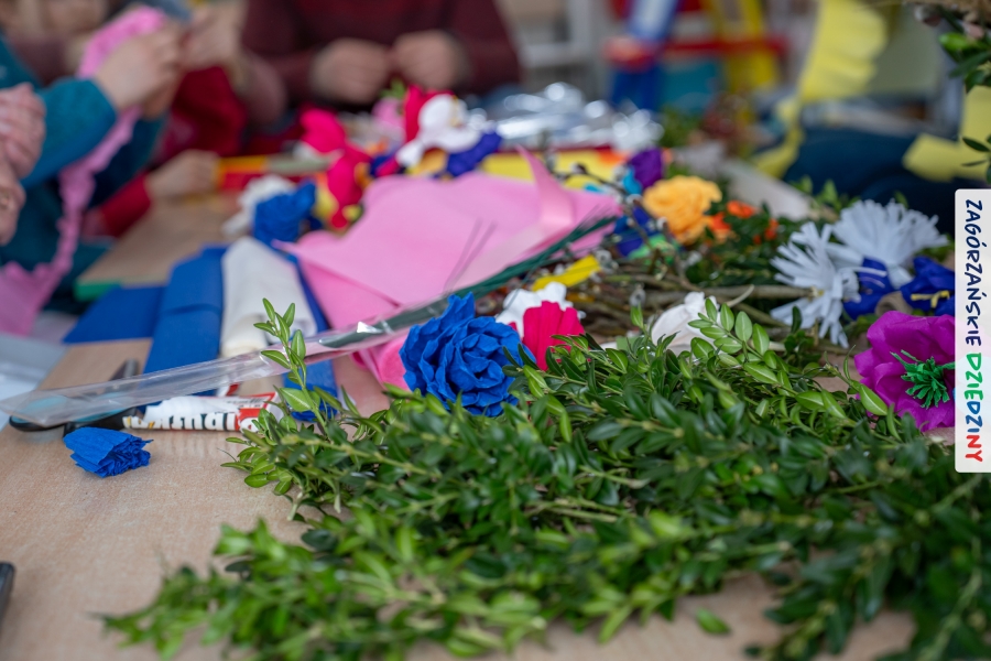 Nasz zimowy jarmark miał jeszcze jedną atrakcję – poza zakupami na stoiskach czy smakowaniem sodry można było wziąć udział w warsztatach robienia kwiatów z bibuły i krepiny oraz palm wielkanocnych. Po sąsiedzku, w Przedszkolu Miejskim nr 2 im. Janiny Porazińskiej, gaździny z KGW Olszówka uczyły robić różne rodzaje kwiatów do palmy – tym sposobem pozyskana wiedza, gotowe kwiatki i bagniyci przydadzą się na Niedzielę Palmową.