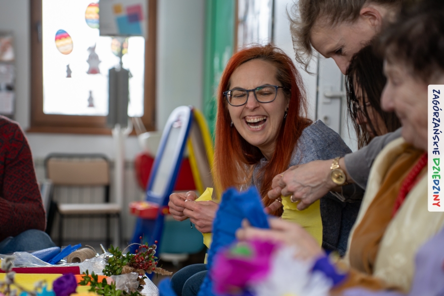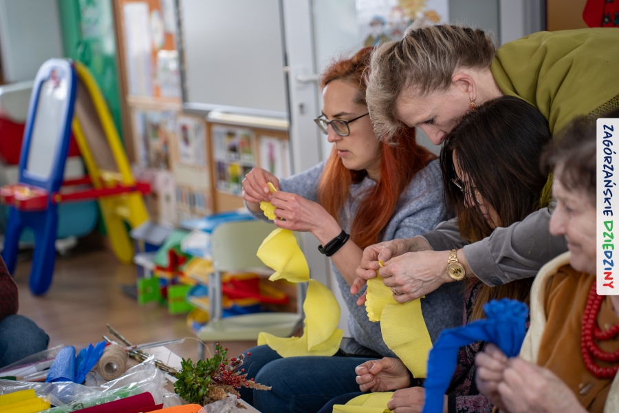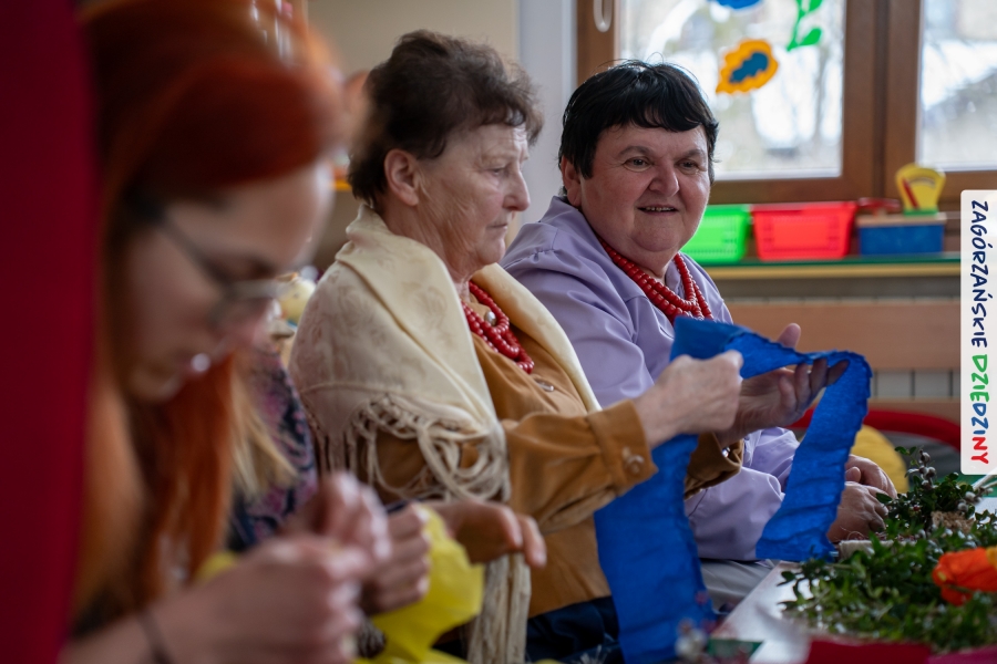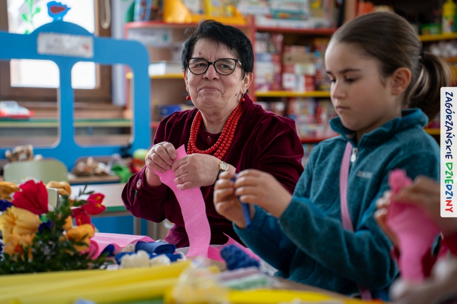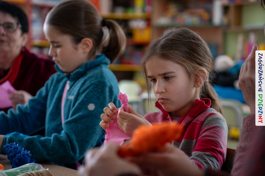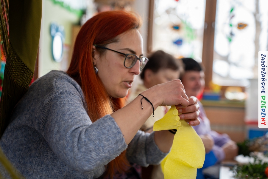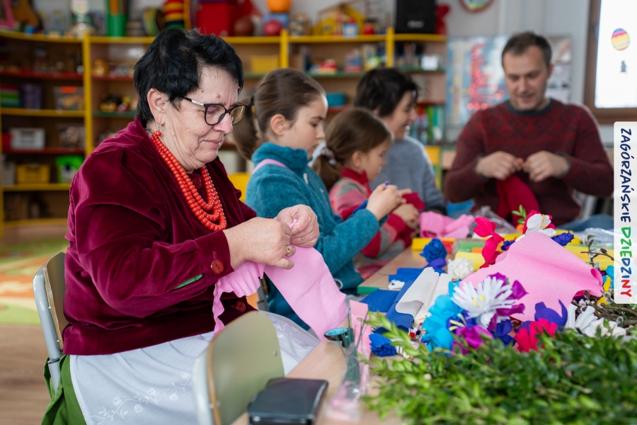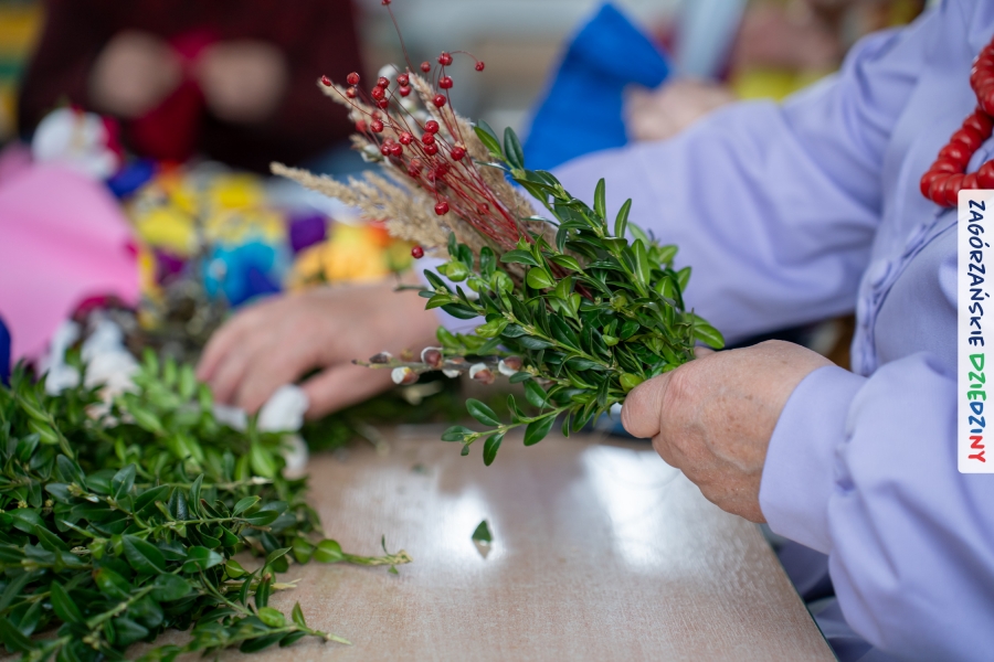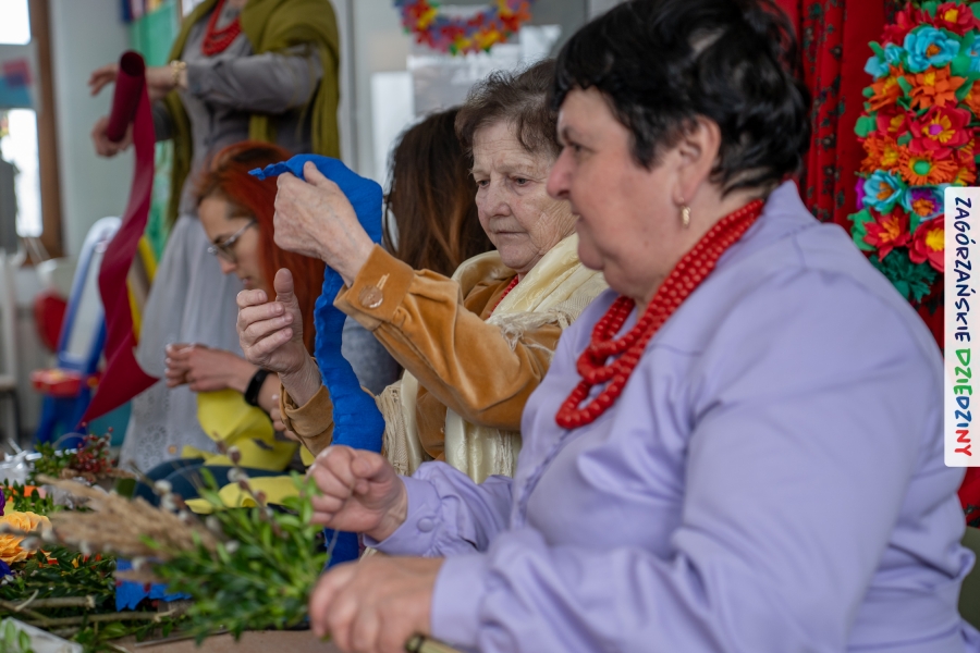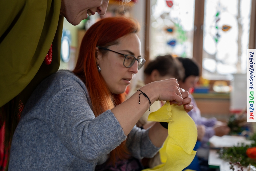 Nasz zimowy jarmark miał jeszcze jedną atrakcję – poza zakupami na stoiskach czy smakowaniem sodry można było wziąć udział w warsztatach robienia kwiatów z bibuły i krepiny oraz palm wielkanocnych. Po sąsiedzku, w Przedszkolu Miejskim nr 2 im. Janiny Porazińskiej, gaździny z KGW Olszówka uczyły robić różne rodzaje kwiatów do palmy – tym sposobem pozyskana wiedza, gotowe kwiatki i bagniyci przydadzą się na Niedzielę Palmową.