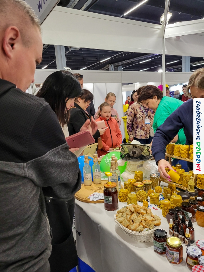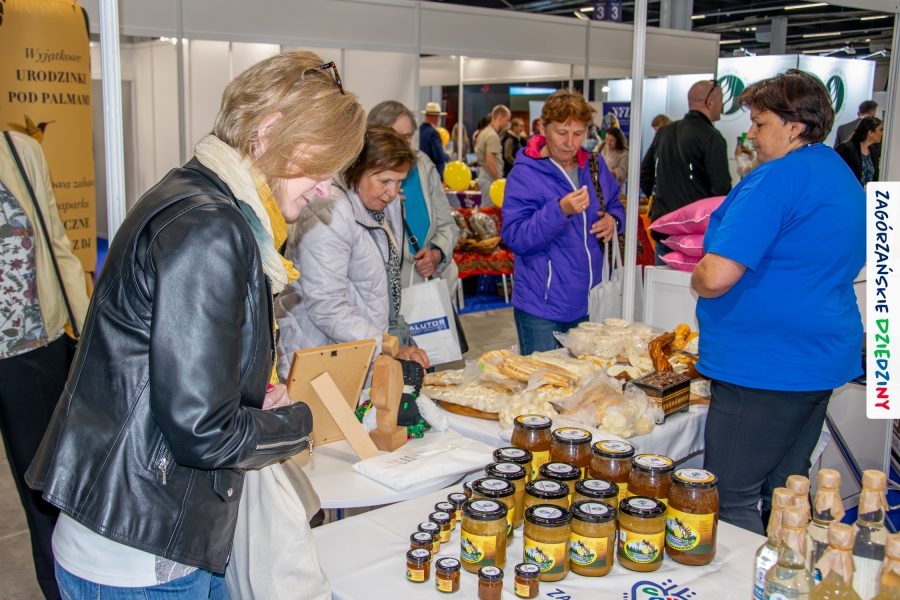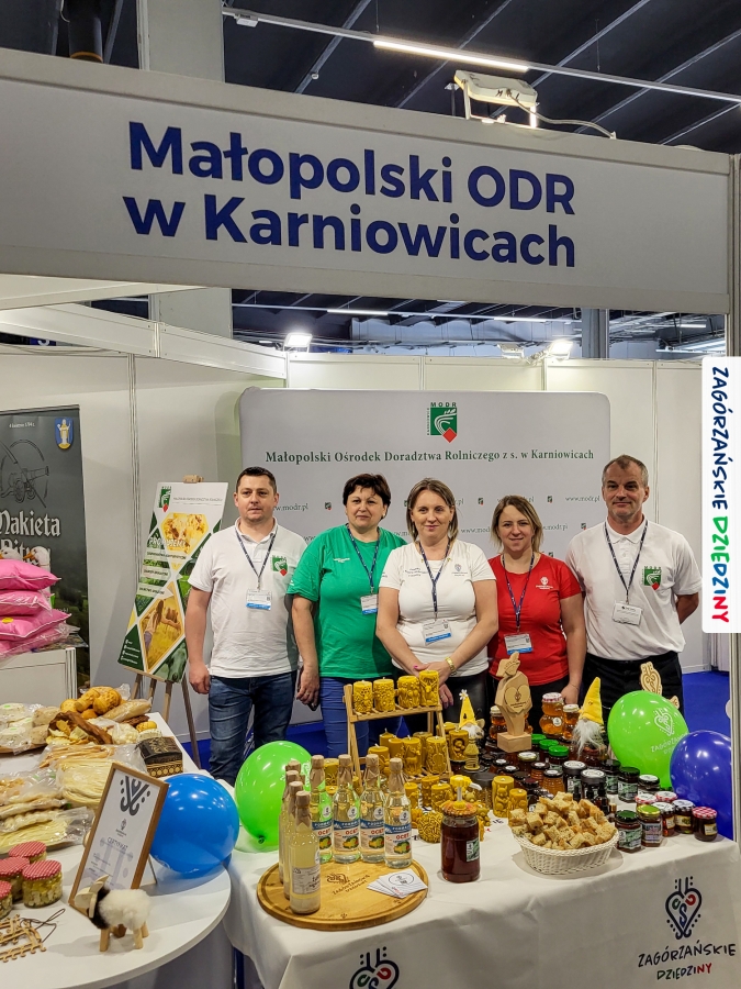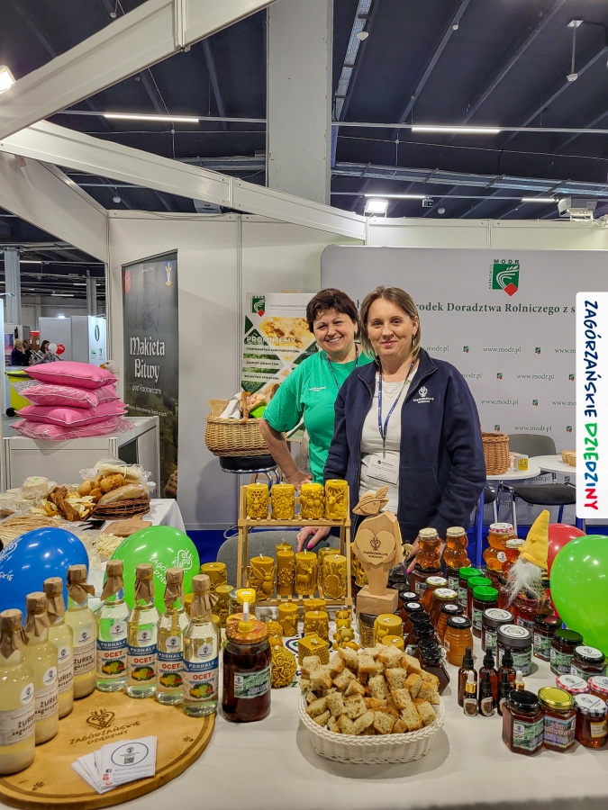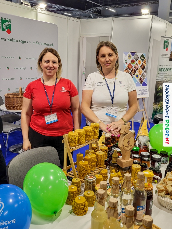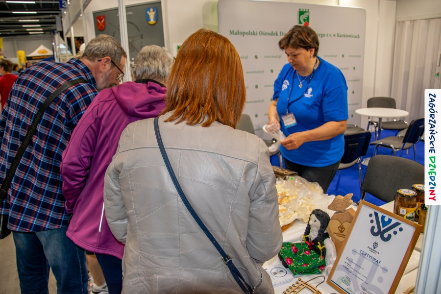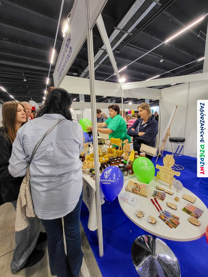 Dobrze było się spotkać ze znajomymi: stoisko współdzieliliśmy z Agnieszką Król z Zagrody Edukacyjnej Pszczółki z Niezwojowic; przez ścianę sąsiadowaliśmy ze stoiskiem Świętokrzyskiego Ośrodka Doradztwa Rolniczego – a tam działały osoby dobrze nam znane z wizyt studyjnych w Zagórzańskich Dziedzinach! Naprzeciwko alejki dostrzegliśmy znak innej marki lokalnej i nasze koleżanki z Miodnego Szlaku.