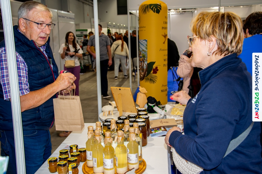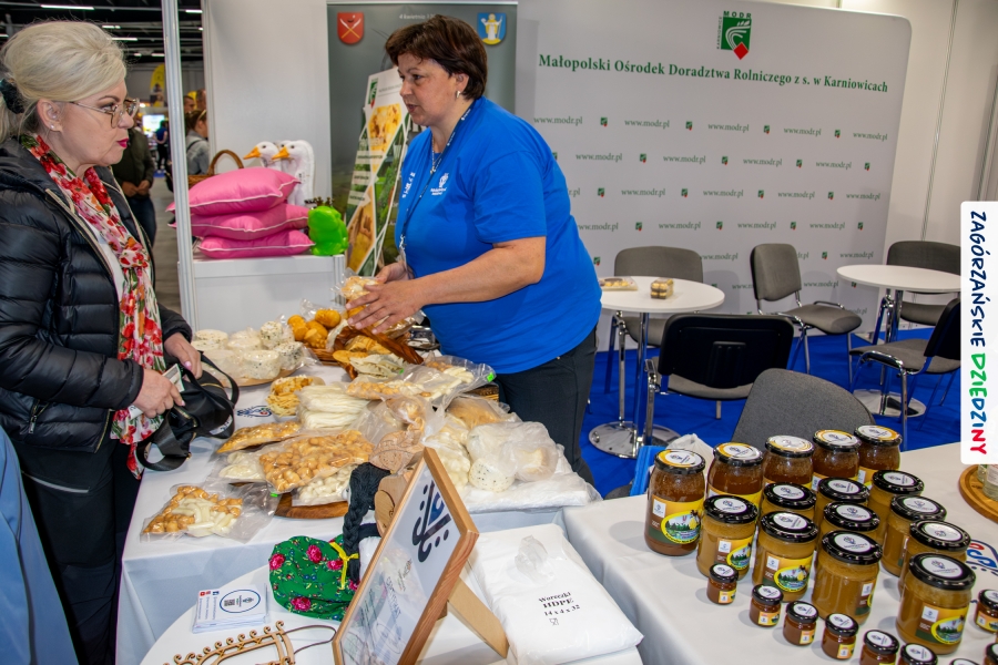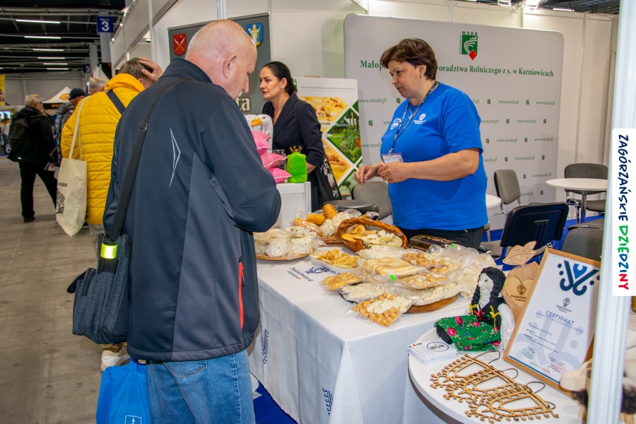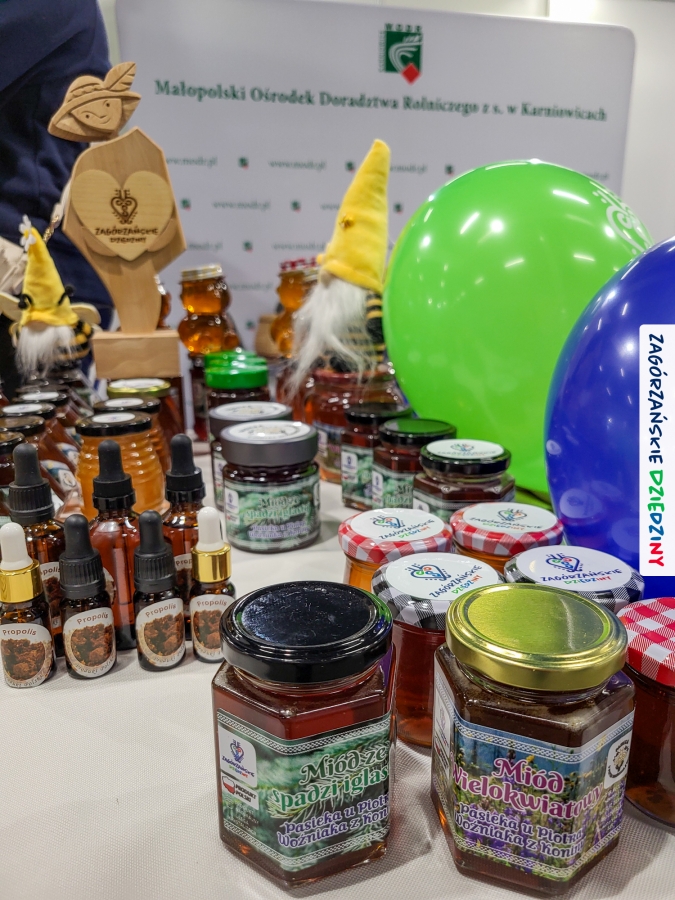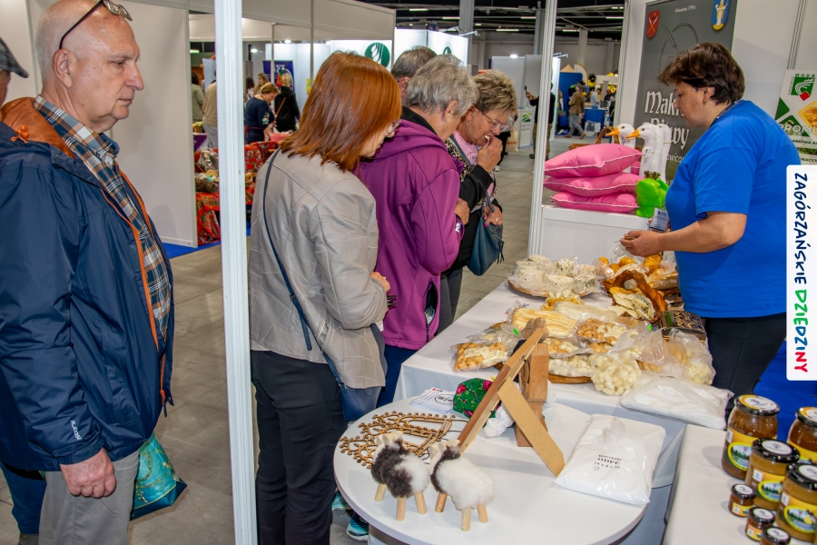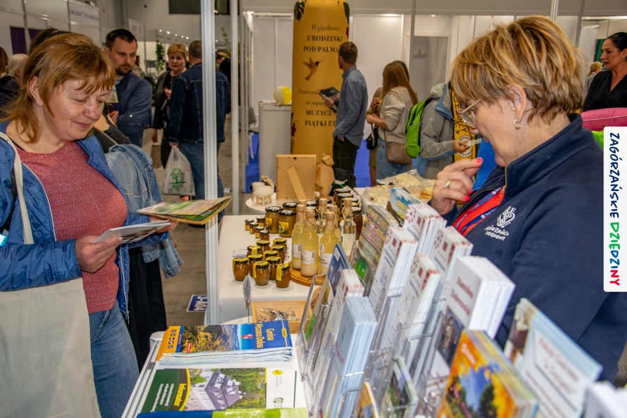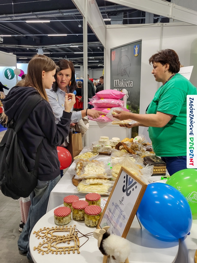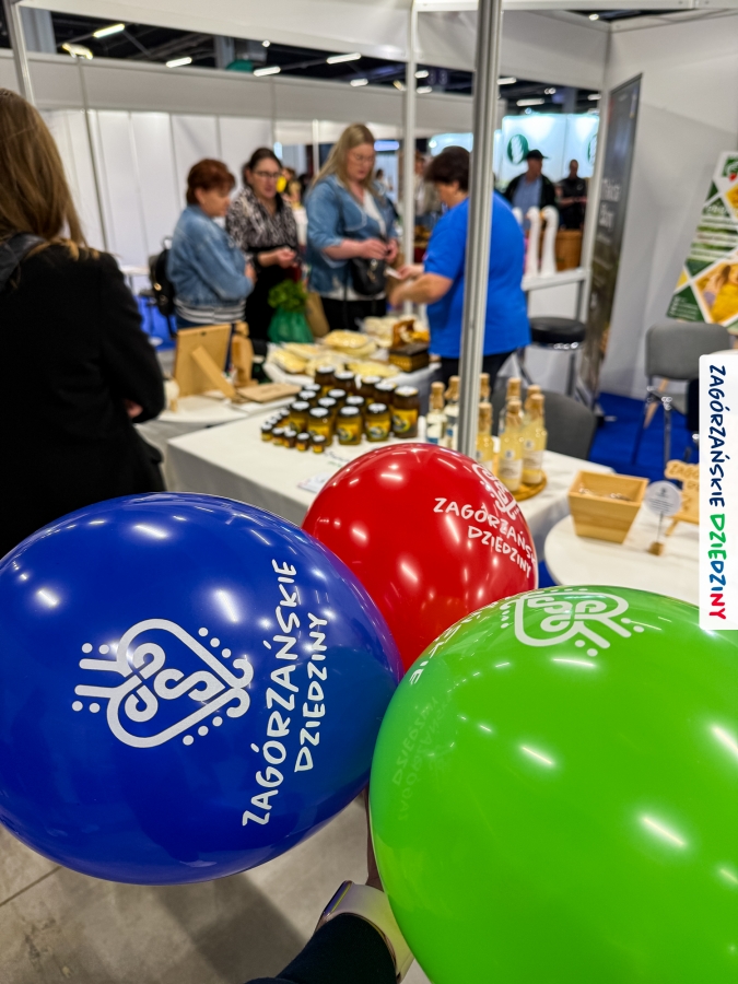 Dobrze było się spotkać ze znajomymi: stoisko współdzieliliśmy z Agnieszką Król z Zagrody Edukacyjnej Pszczółki z Niezwojowic; przez ścianę sąsiadowaliśmy ze stoiskiem Świętokrzyskiego Ośrodka Doradztwa Rolniczego – a tam działały osoby dobrze nam znane z wizyt studyjnych w Zagórzańskich Dziedzinach! Naprzeciwko alejki dostrzegliśmy znak innej marki lokalnej i nasze koleżanki z Miodnego Szlaku.