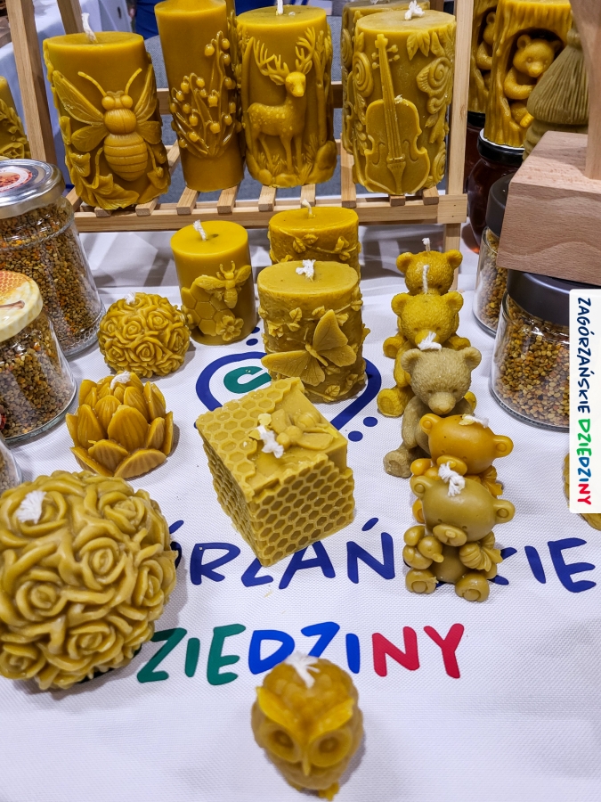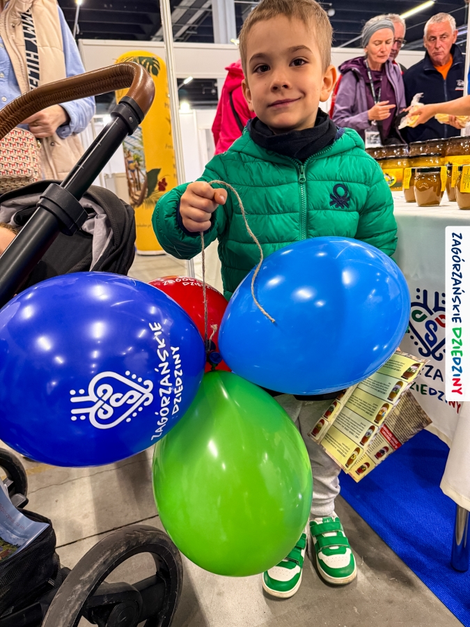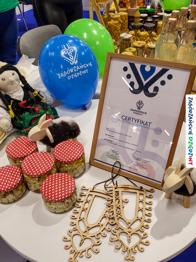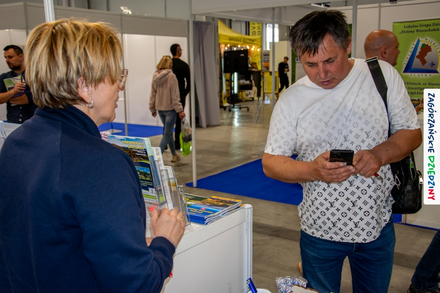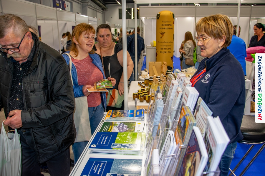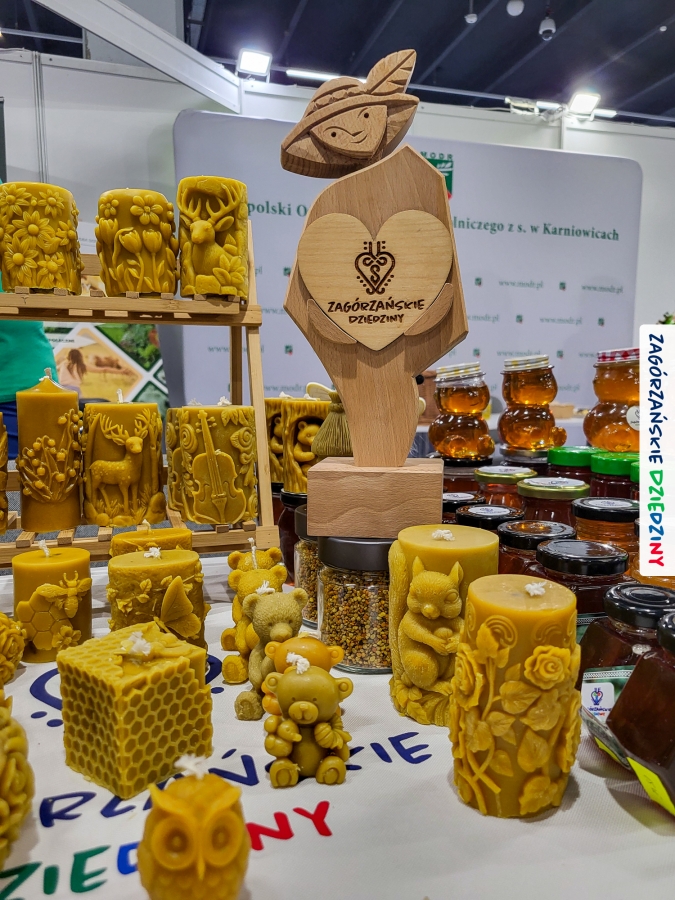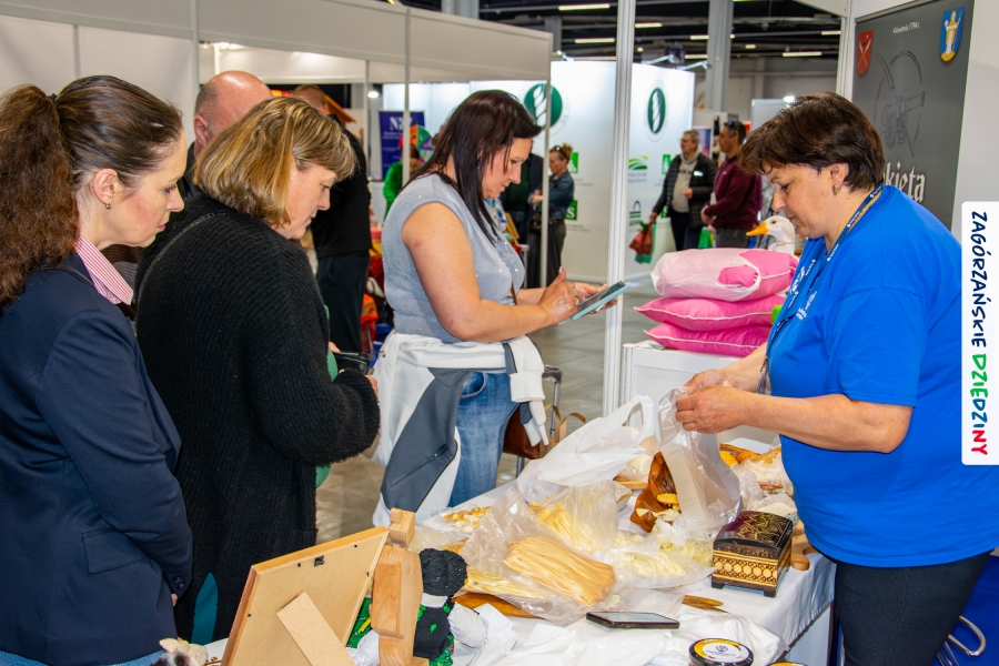 Dobrze było się spotkać ze znajomymi: stoisko współdzieliliśmy z Agnieszką Król z Zagrody Edukacyjnej Pszczółki z Niezwojowic; przez ścianę sąsiadowaliśmy ze stoiskiem Świętokrzyskiego Ośrodka Doradztwa Rolniczego – a tam działały osoby dobrze nam znane z wizyt studyjnych w Zagórzańskich Dziedzinach! Naprzeciwko alejki dostrzegliśmy znak innej marki lokalnej i nasze koleżanki z Miodnego Szlaku.