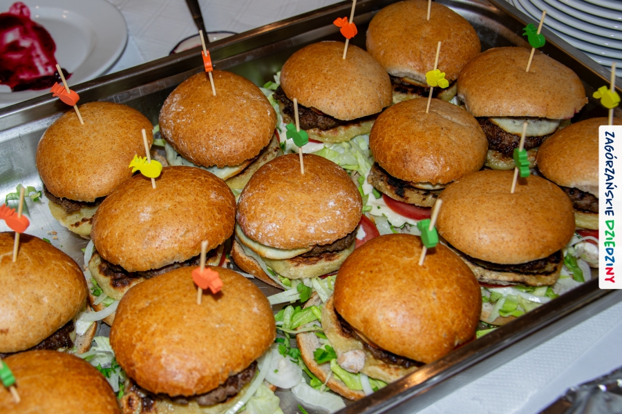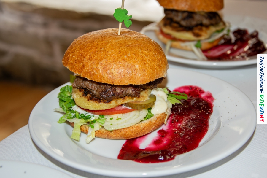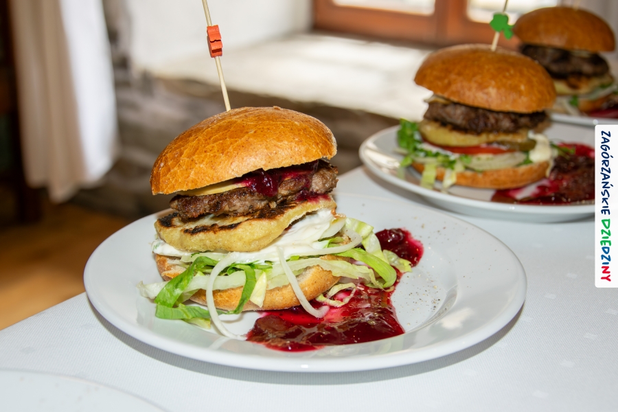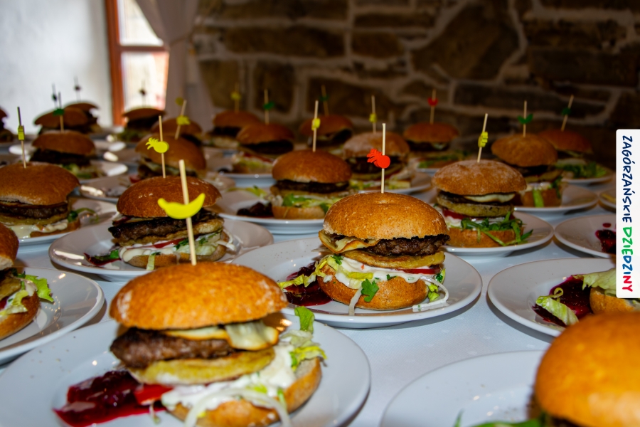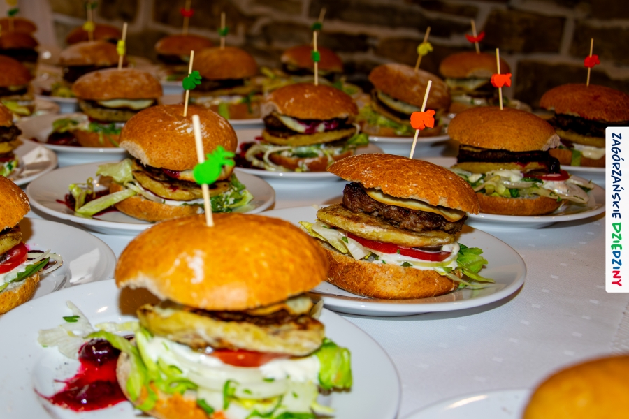 To klimatyczne miejsce, z przepiękną historią, otworzyło swoje gościnne progi na zagórzańskich gości. I choć to duża przestrzeń, z każdego niemal kąta nęcił zapach, który zapraszał na nasze wydarzenie. Zgodnie z zapowiedzią, kulinarne eksperymenty z lokalną kuchnią przedstawił nam Paweł Kołodziej – właściciel pizzerii Szapo ba oraz Restauracjai Dziki Smardz z Kasinki Małej. To finalny efekt warsztatów, które u szefa kuchni wygrali uczestnicy kwietniowej „Bitwy na sodrę” zorganizowanej podczas Zagórzańskiego Jarmarku Wielkanocnego. Tym razem był to „zagóburger” – podany jako przystawka do rozpoczynającej się gali. Program skrojony był na bogato, więc warto było się nim poczęstować, tym bardziej, że skład imponująco regionalny: buła (pieczona przez samego szefa kuchni!) z grillowanym serkiem od Moniki Kubik vel Zagórzańska Tradycja - Sery Podpuszczkowe (również z zagórzańskim znakiem jakości i pochodzenie), burger z mięsa baraniego (to dostarczyła nasza baca w spódnicy, Monika Kościelniak ze Stowarzyszenie Miłośników Kultury Góralskiej "Pod Cyrlom"), wkładka z moskola (dzieło Pawła) oraz w standardzie chrupiąca cebulka i sałata - wszystko przyozdobione dla smaku i ku uciesze naszych zmysłów sosem żurawinowym… Przy bufecie kawowym ustawili się również zwolennicy słodkości. Smakowali oni i z aprobatą „lizali palce” po poczęstunku przygotowanym przez markową już Cukiernię Babeczka z Łętowego. Taki „wstępniak” gwarantował podtrzymanie energii aż do kolejnego przystanku kulinarnego, czyli obiadu. A jak to wszystko i wizualnie i aromatycznie nęciło…! Nie było osoby, której by nie skusił ten zapach… Stół pełen burgerów szybko został wyprzątany, a i słodkości rozeszły się w okamgnieniu…