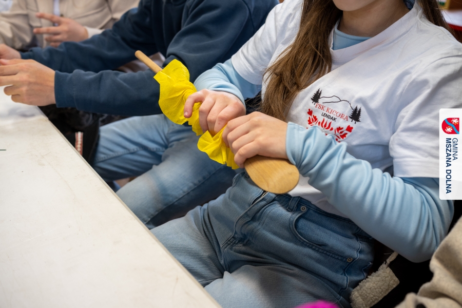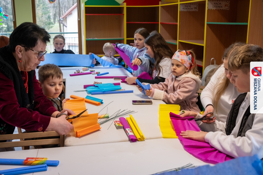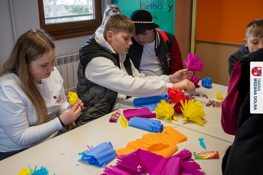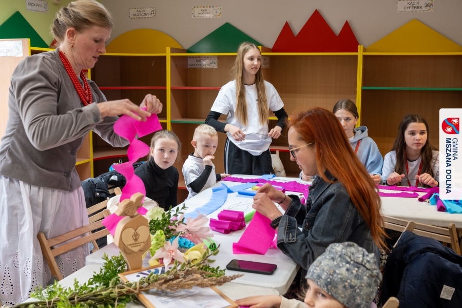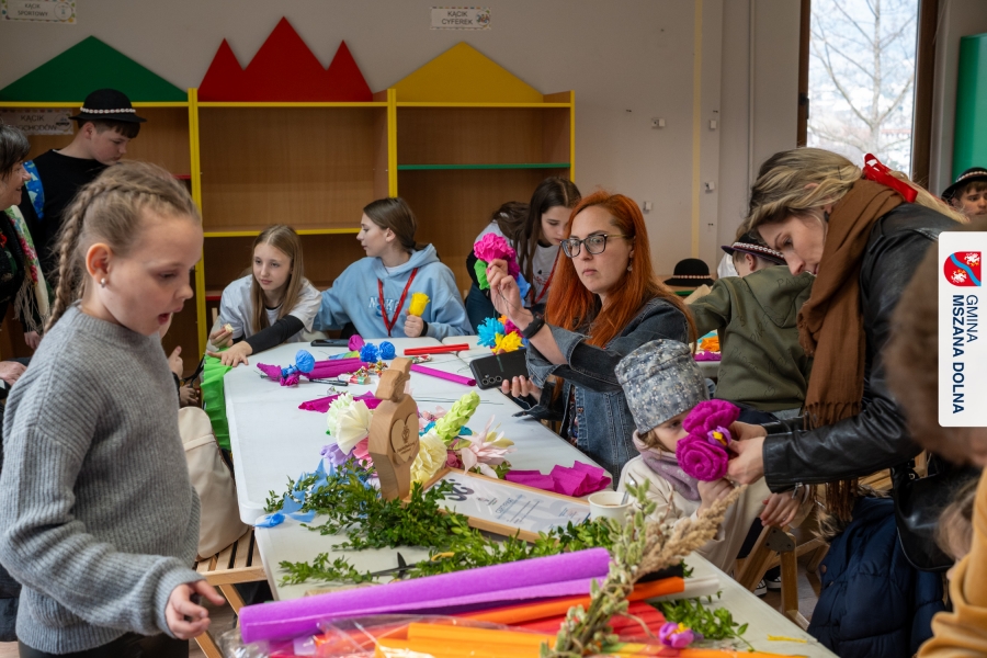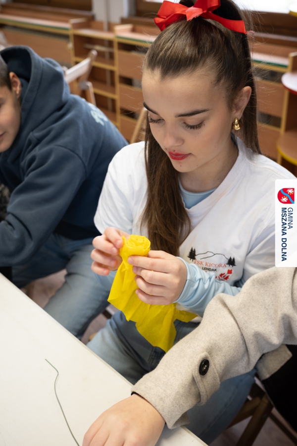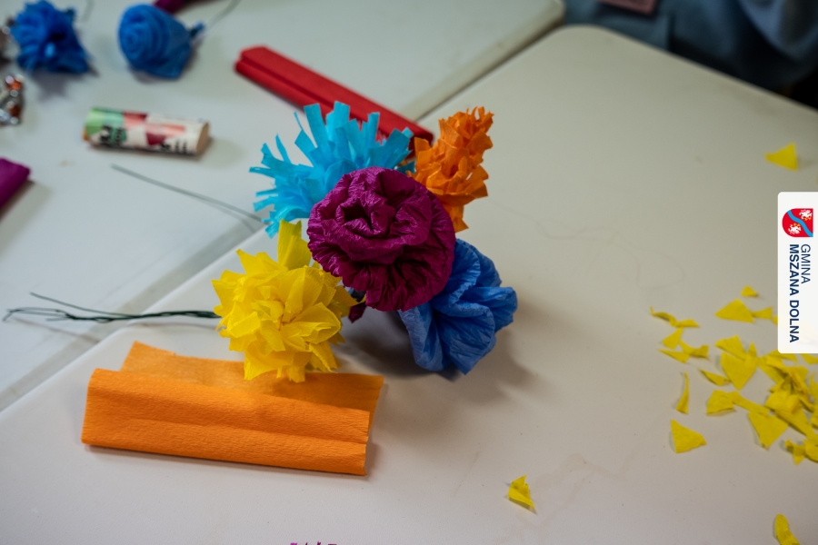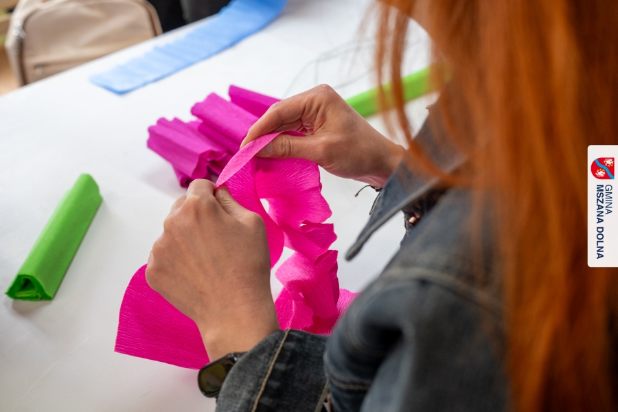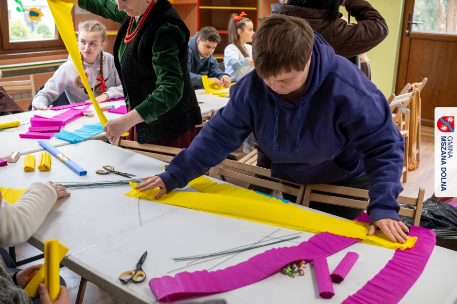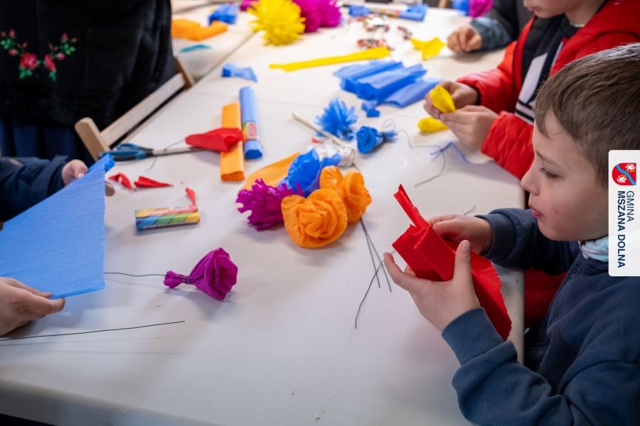 Drugiego dnia, 22 marca 2026 r., w Mszanie Dolnej odbyły się warsztaty plastyki obrzędowej pt. „Zagórzańskie cejco”, prowadzone przez członkinie KGW Olszówka. Podczas zajęć wszystko było pokazywane od absolutnych podstaw, od przygotowania bibuły, przez skręcanie płatków, aż po tworzenie całych kompozycji kwiatowych.