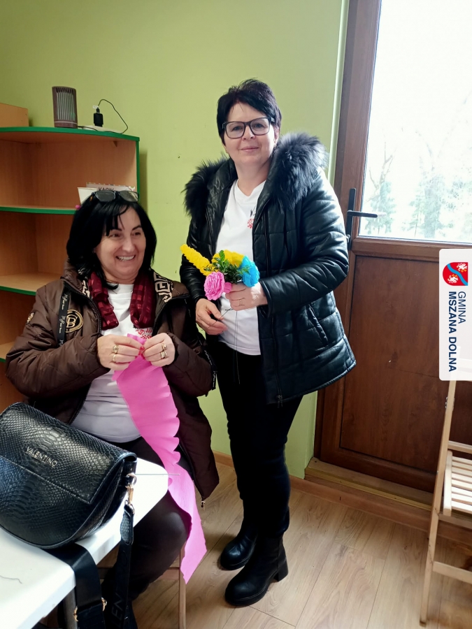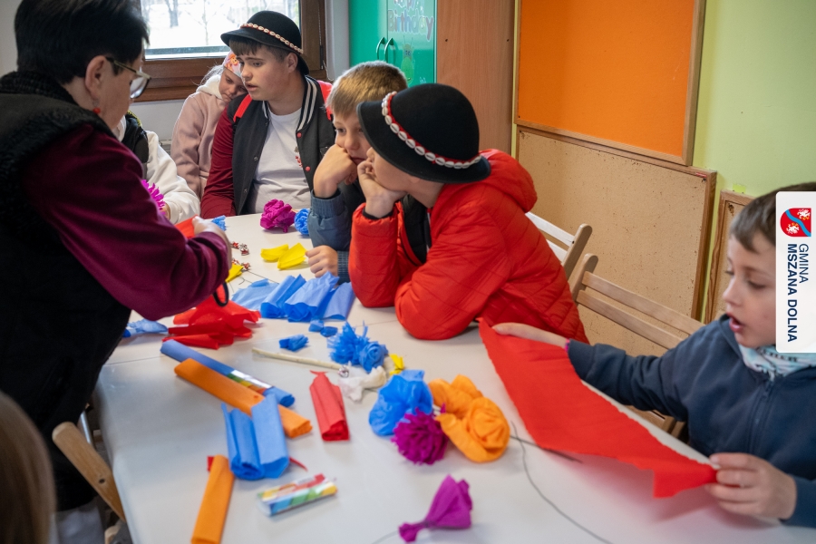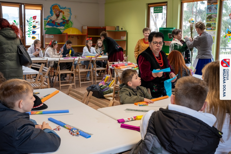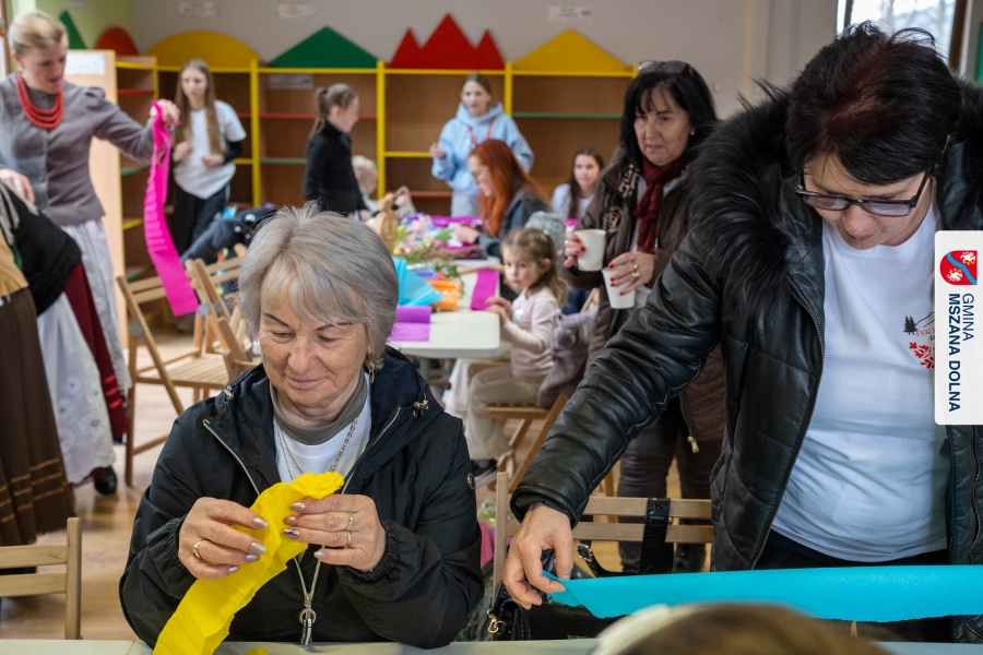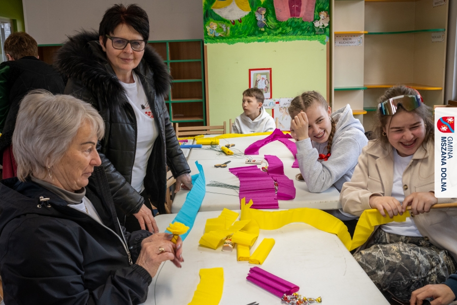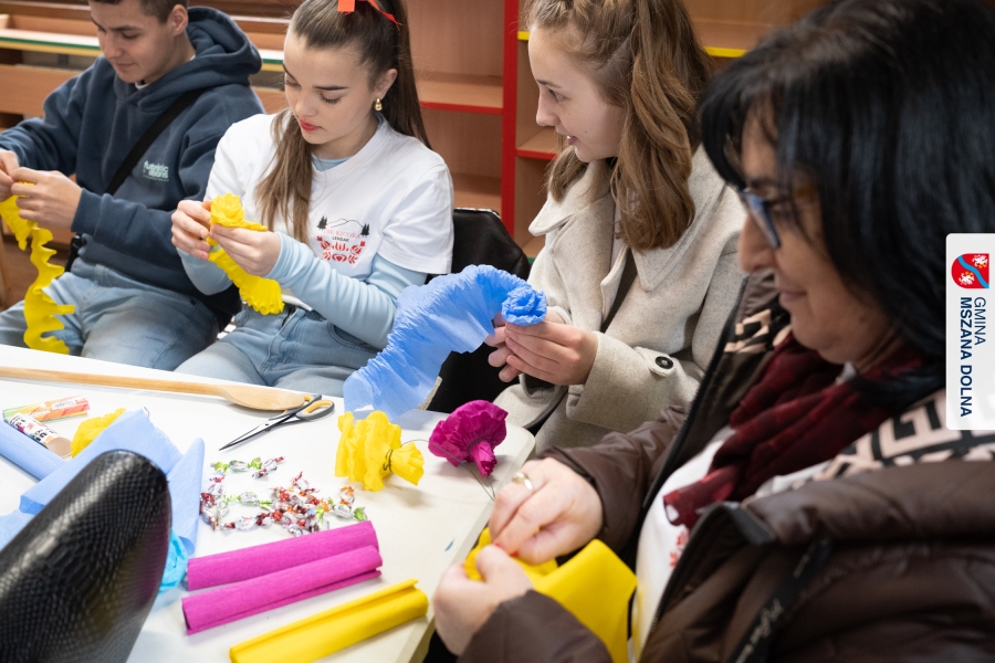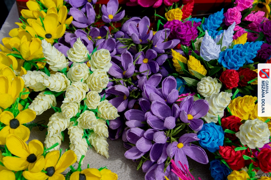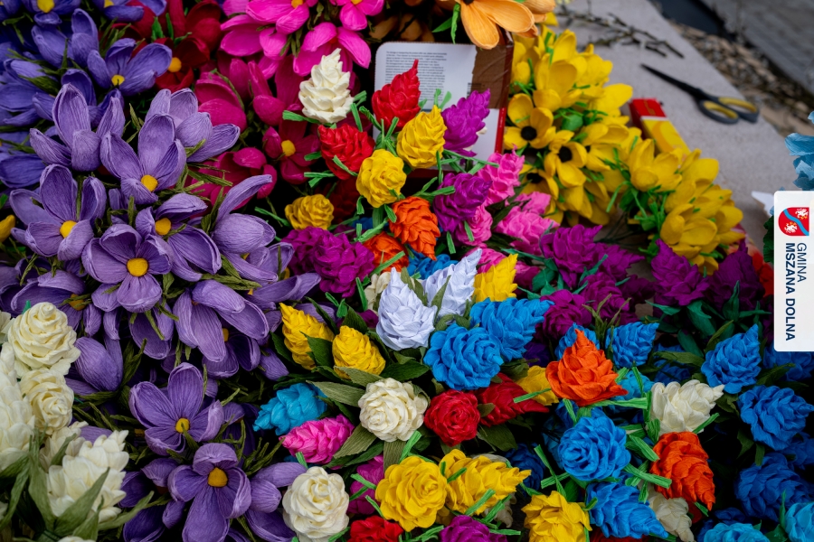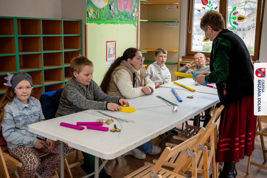Drugiego dnia, 22 marca 2026 r., w Mszanie Dolnej odbyły się warsztaty plastyki obrzędowej pt. „Zagórzańskie cejco”, prowadzone przez członkinie KGW Olszówka. Podczas zajęć wszystko było pokazywane od absolutnych podstaw, od przygotowania bibuły, przez skręcanie płatków, aż po tworzenie całych kompozycji kwiatowych.