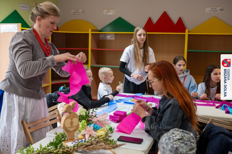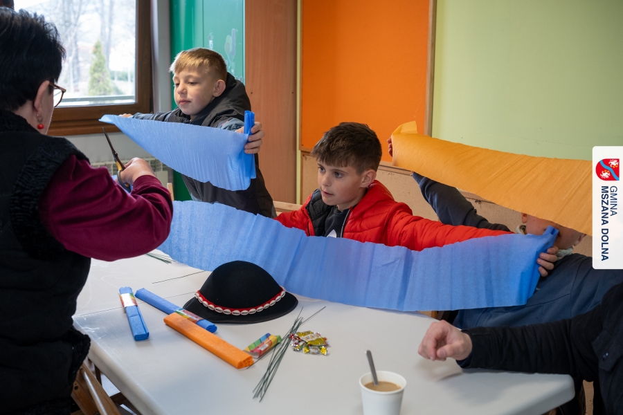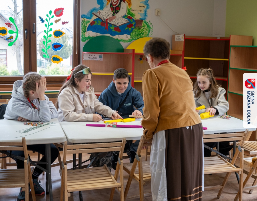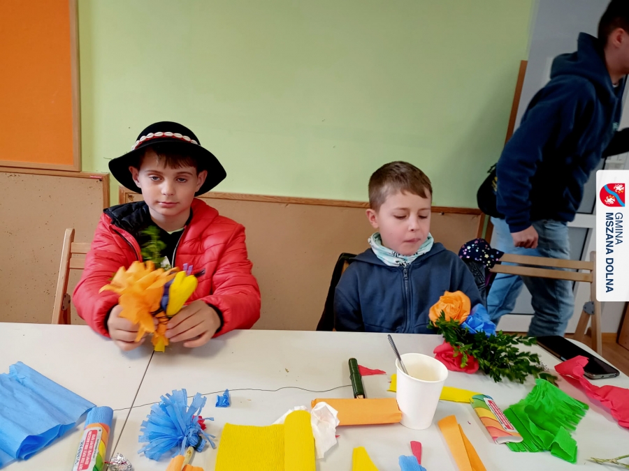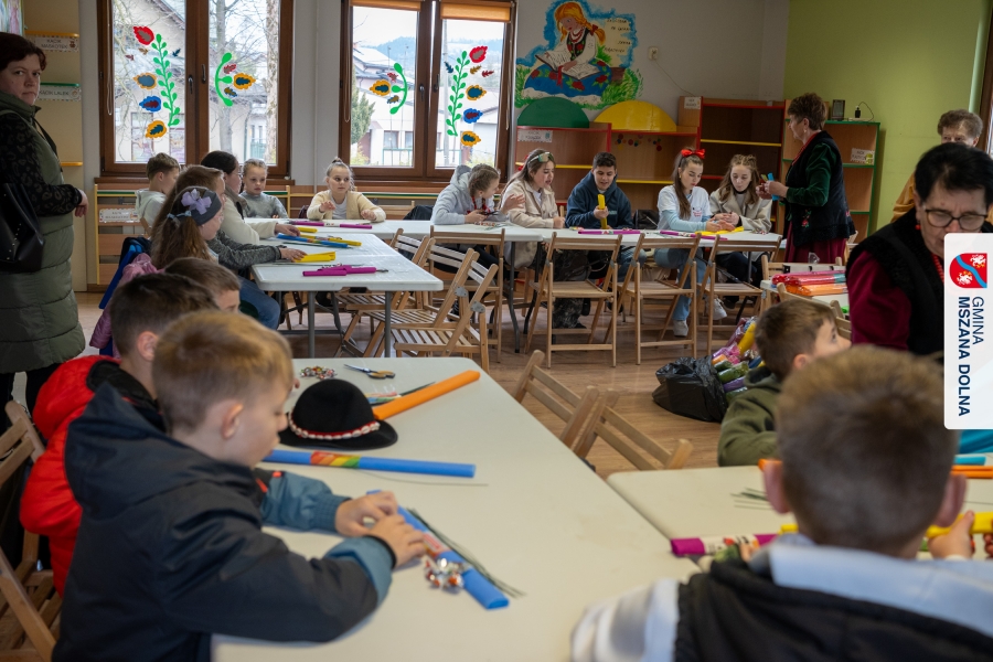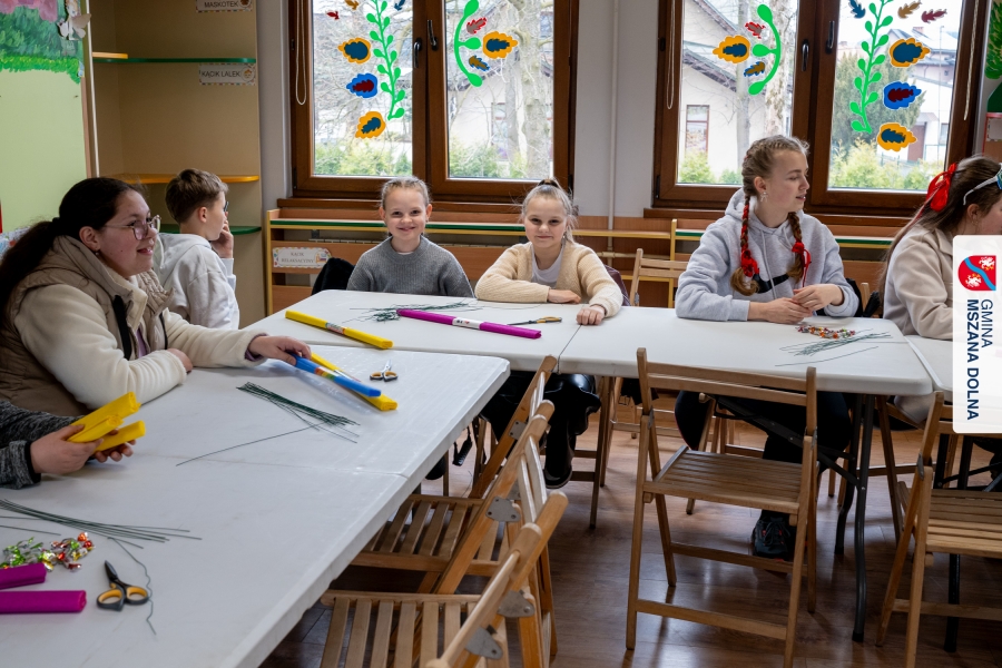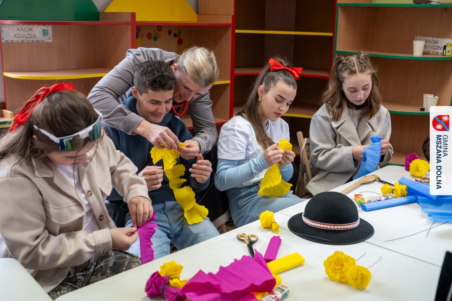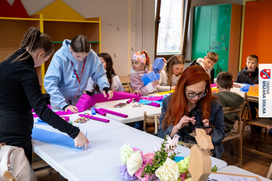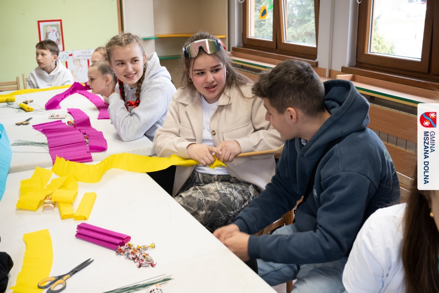 Drugiego dnia, 22 marca 2026 r., w Mszanie Dolnej odbyły się warsztaty plastyki obrzędowej pt. „Zagórzańskie cejco”, prowadzone przez członkinie KGW Olszówka. Podczas zajęć wszystko było pokazywane od absolutnych podstaw, od przygotowania bibuły, przez skręcanie płatków, aż po tworzenie całych kompozycji kwiatowych.