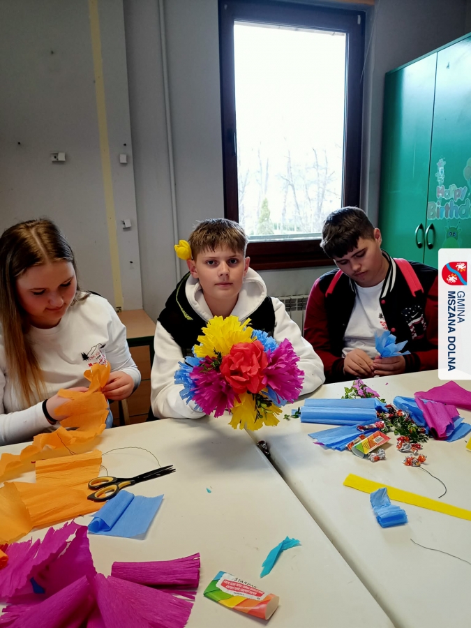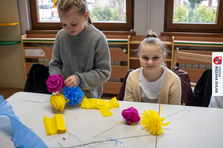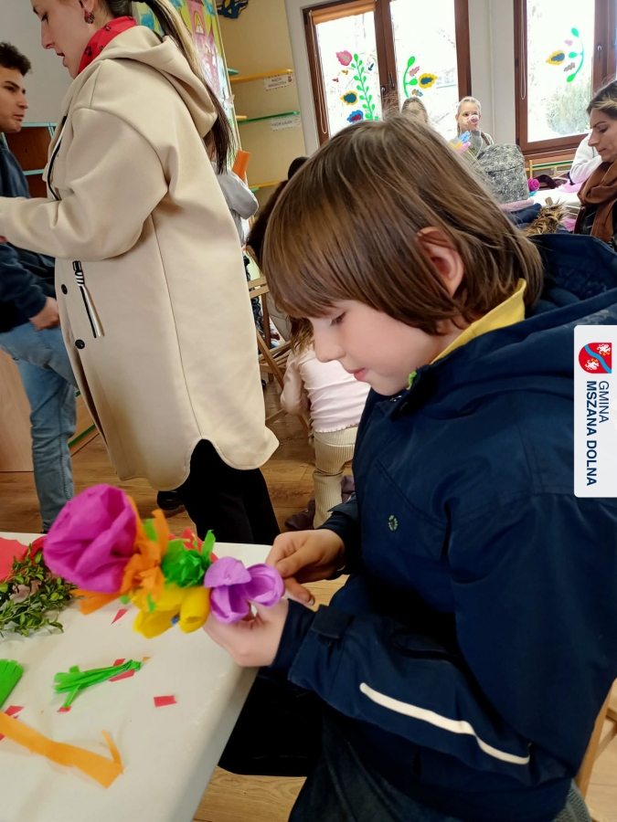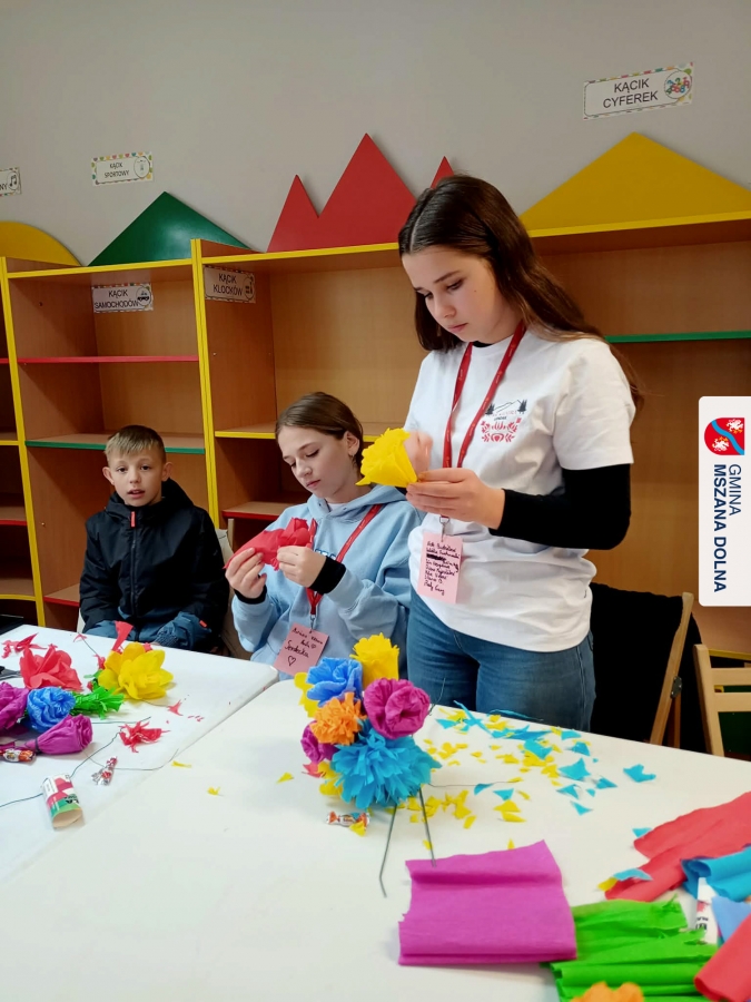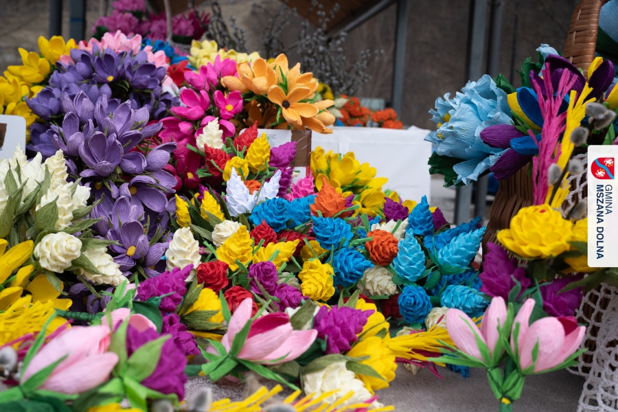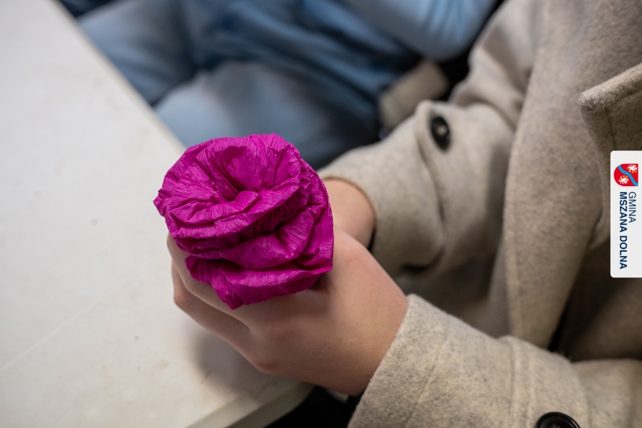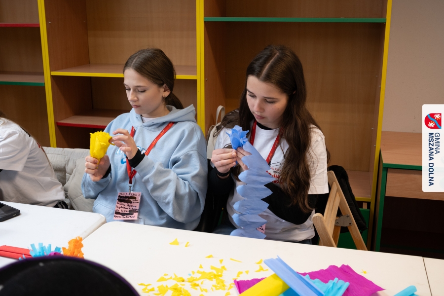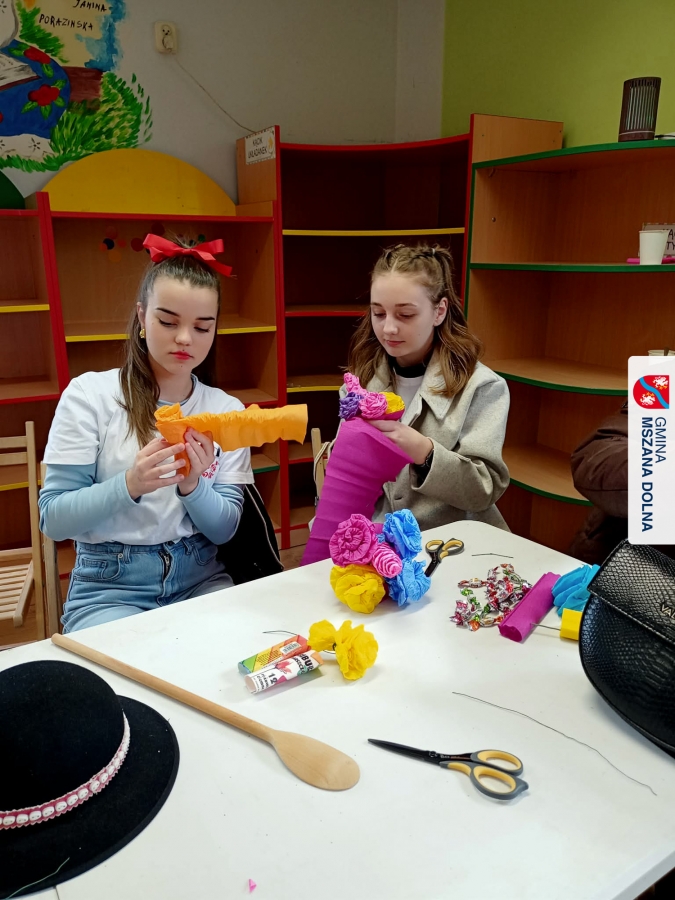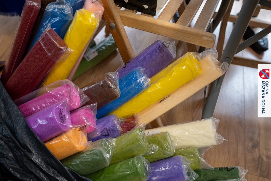 Drugiego dnia, 22 marca 2026 r., w Mszanie Dolnej odbyły się warsztaty plastyki obrzędowej pt. „Zagórzańskie cejco”, prowadzone przez członkinie KGW Olszówka. Podczas zajęć wszystko było pokazywane od absolutnych podstaw, od przygotowania bibuły, przez skręcanie płatków, aż po tworzenie całych kompozycji kwiatowych.