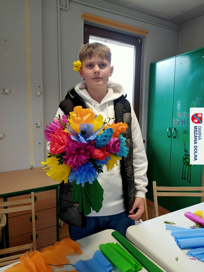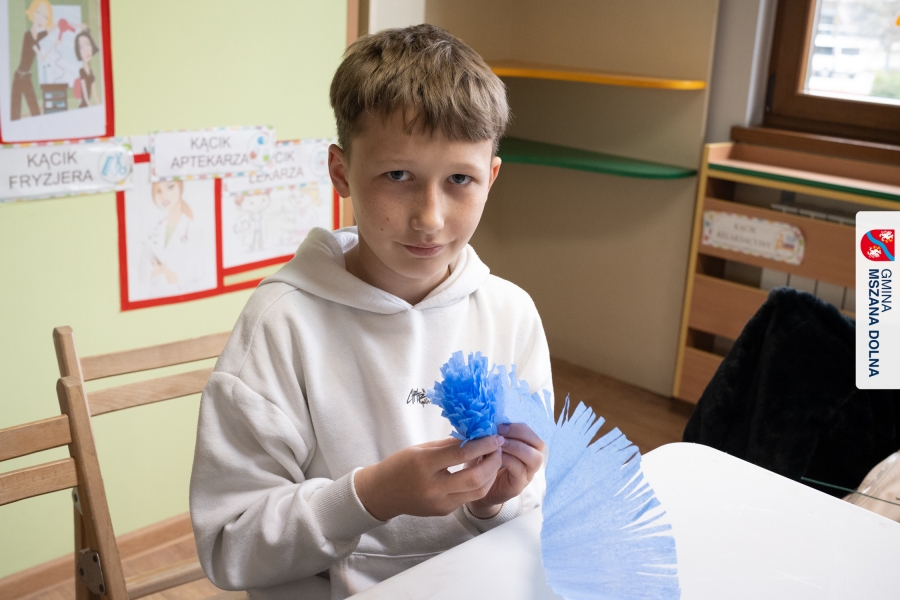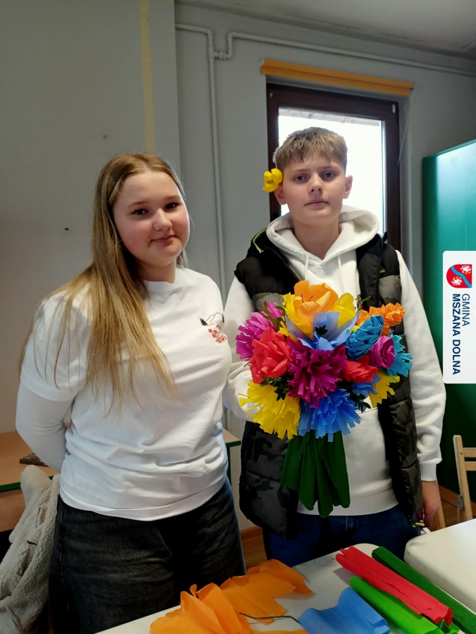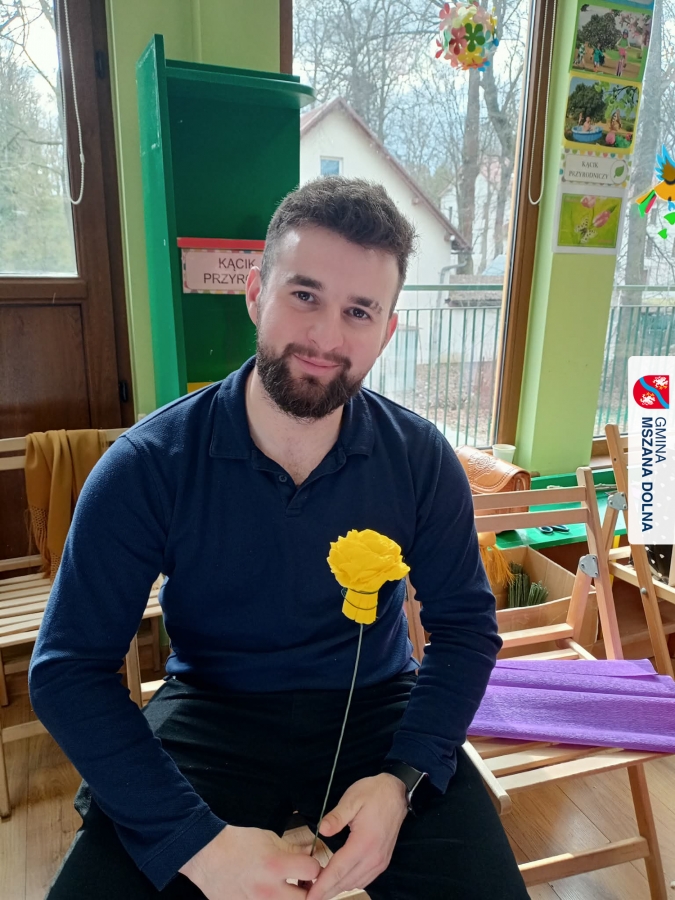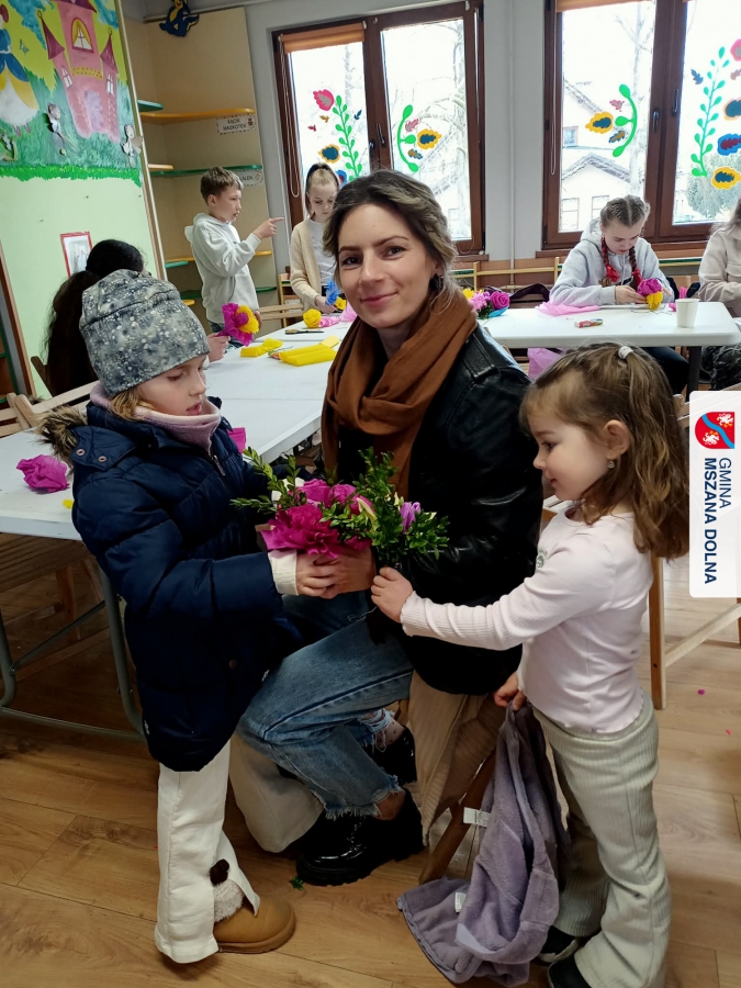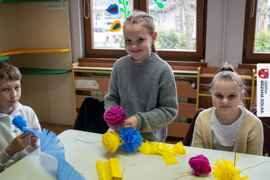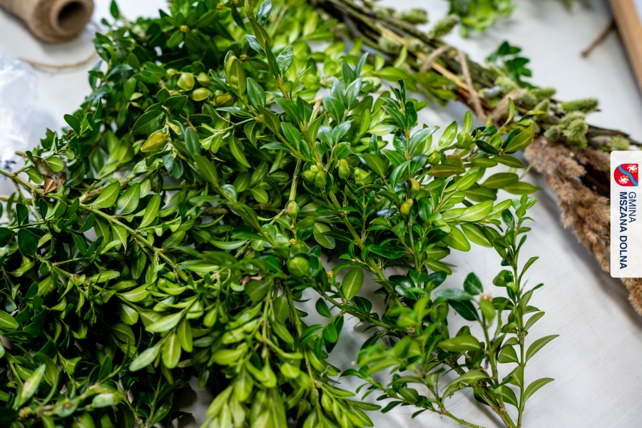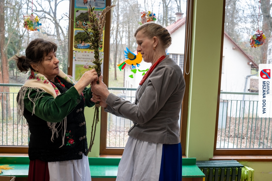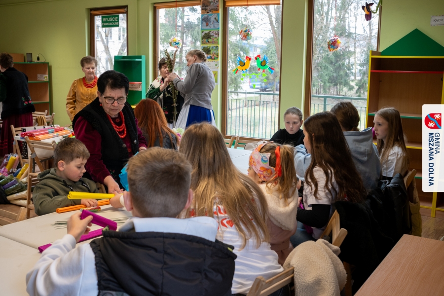 Drugiego dnia, 22 marca 2026 r., w Mszanie Dolnej odbyły się warsztaty plastyki obrzędowej pt. „Zagórzańskie cejco”, prowadzone przez członkinie KGW Olszówka. Podczas zajęć wszystko było pokazywane od absolutnych podstaw, od przygotowania bibuły, przez skręcanie płatków, aż po tworzenie całych kompozycji kwiatowych.