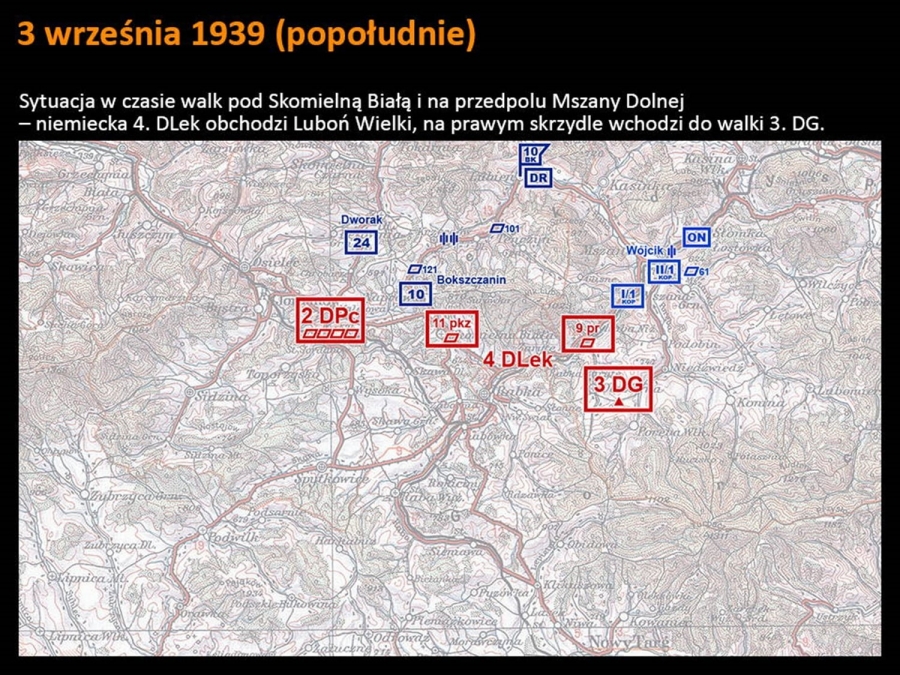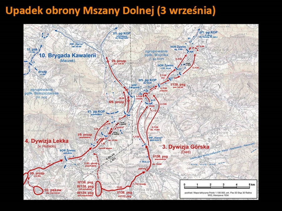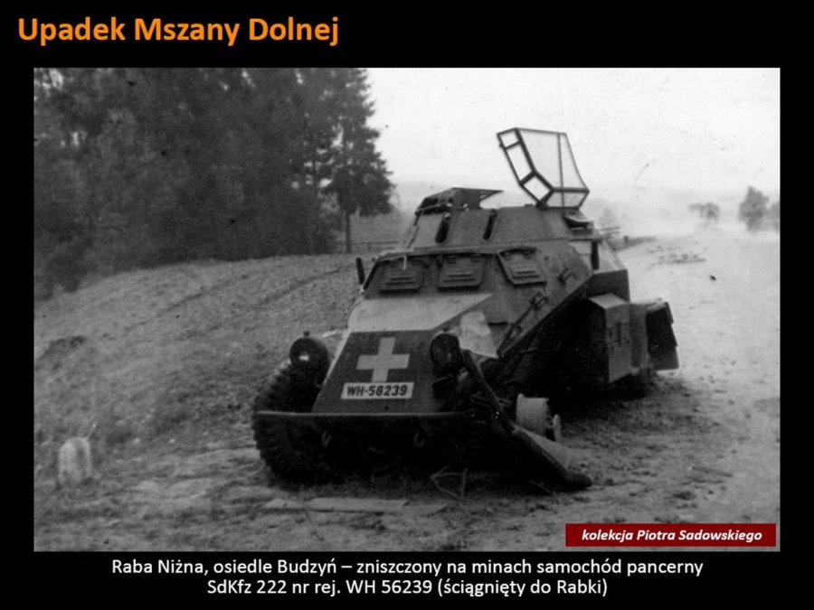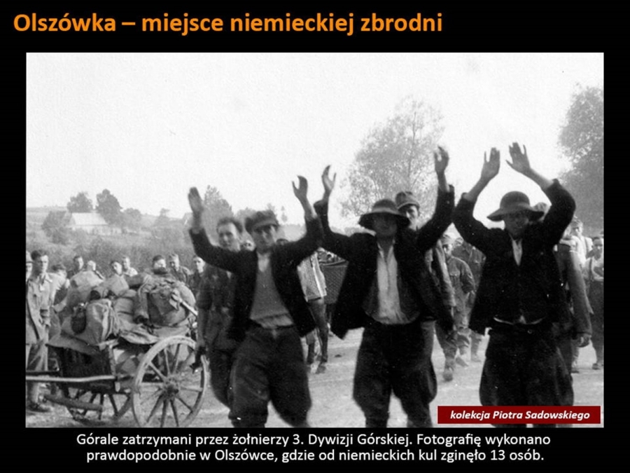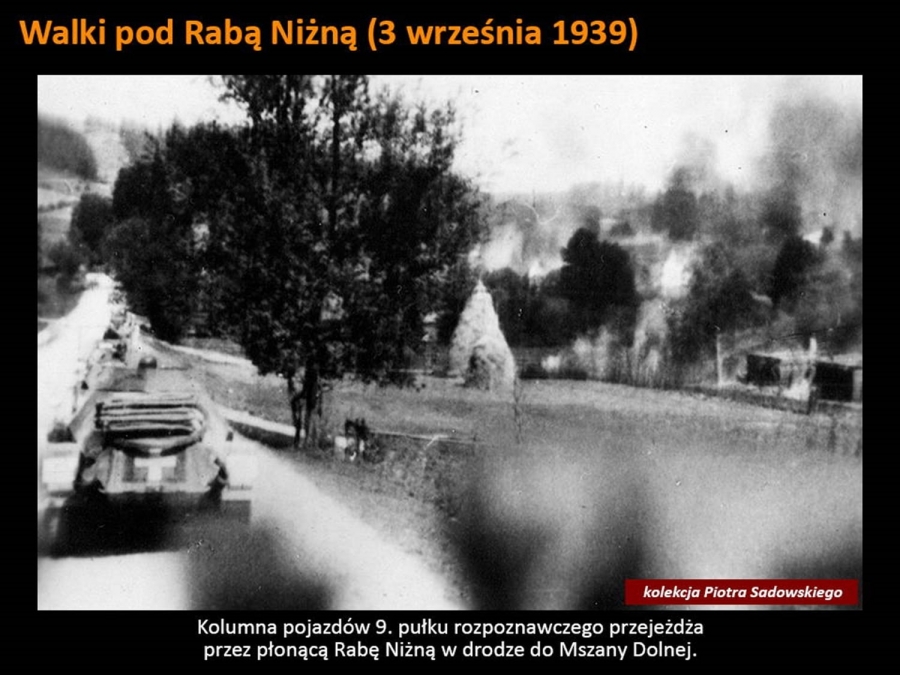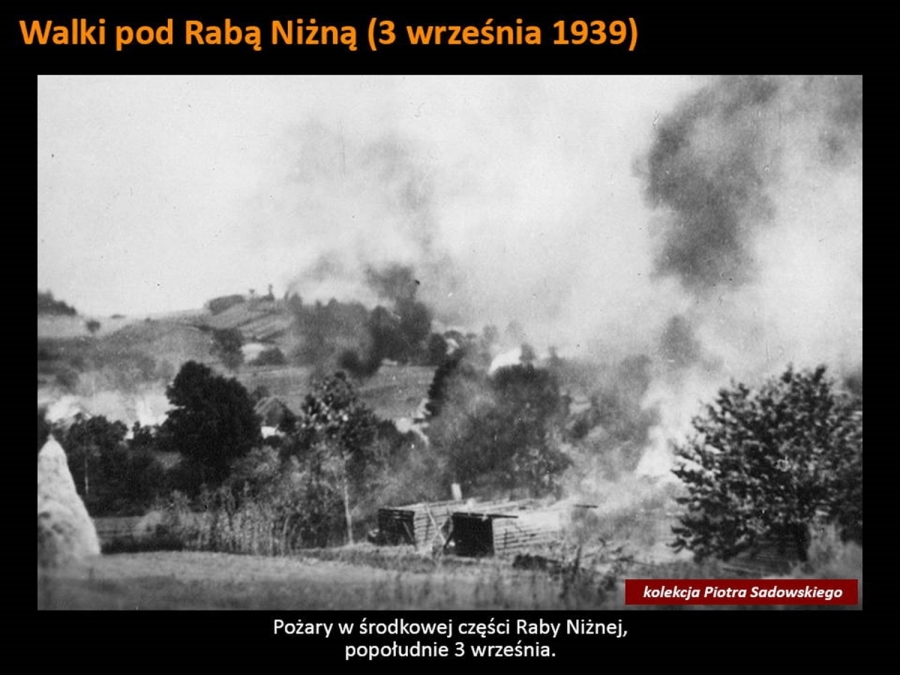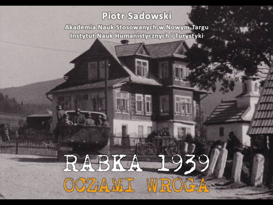 Odpowiedział on na zaproszenie Burmistrza Rabki – Zdroju i w tamtejszej Willi pod Aniołem zabrał zgromadzonych w arcyciekawą podróż. Mogliśmy oglądać swoją okolicę na zdjęciach zrobionych przez Niemców w czasie działań wojennych. I choć tytuł wykładu „ Rabka 1939 - oczami wroga” wskazywałby, że prelegent skupi się tylko na tym uzdrowiskowym miasteczku, to w jego barwnej i ciekawej opowieści nie zabrakło historii pobliskiej Raby Niżnej czy Olszówki, wspominając pacyfikację tej wsi, a także Kasiny Wielkiej i potyczek stoczonych pod Mogiłą.  Pokazał też zdjęcia miejscowych górali, których ochoczo fotografowali przedstawiciele wrogiej armii. Sam pomysł prelekcji też jest godny pochwały – mogliśmy prześledzić dokładnie (osadzone godzinowo w konkretnym miejscu na mapie) działania wojenne w Rabce oraz jej bliższej i dalszej okolicy. Z otwartymi ustami słuchaliśmy historii o niezwykłej fotografii z pierwszych dni okupacji, na której widać niemieckich żołnierzy pozujących ze zrabowanym godłem Zarządu Gminnego w Rabce. Symboliczny obraz pokazuje moment przejęcia władzy w mieście. Jak wyjaśnił prelegent, sama tablica z godłem została wywieziona przez Niemców jako trofeum wojenne i obecnie znajduje się w zbiorach Heeresgeschichtliches Museum w Wiedniu. Cóż za historia! Abyście doświadczyli chociaż namiastki tej niezwykłej podróży w czasie, jaką zafundował nam dr Sadowski, za jego zgodą prezentujemy kilka slajdów, które my mieliśmy szczęście oglądać z właściwym komentarzem.