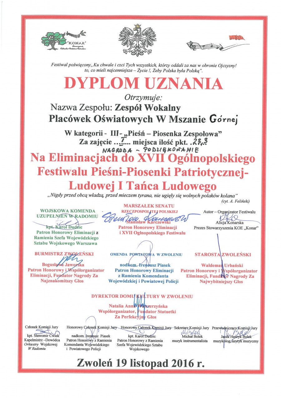 Zespół wokalny z Gimnazjum w Mszanie Górnej finalistą Ogólnopolskiego Festiwalu Piosenki Patriotycznej