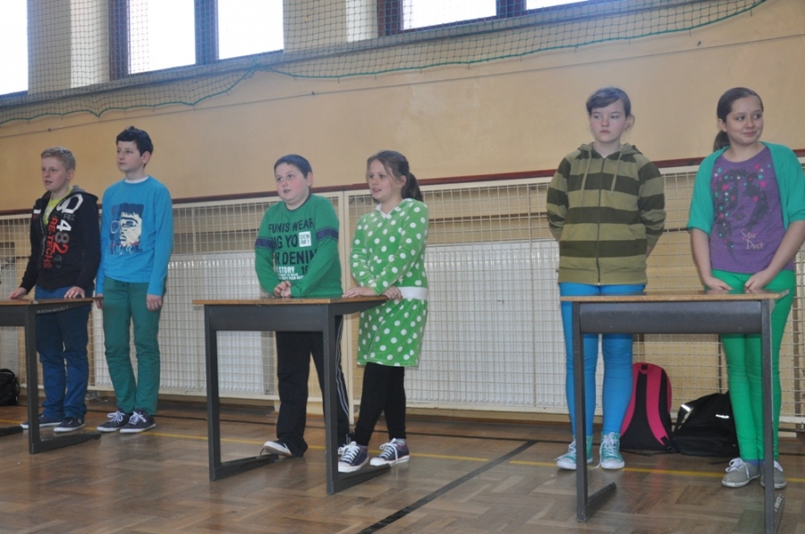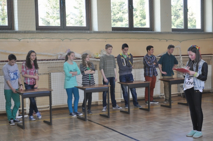 Jednakże to nie był koniec wiosennych zmagań naszych uczniów. Po konkursie kulinarnym rozpoczął się sprawdzian wiedzy przyrodniczo-geograficznej w teleturnieju klas „Jeden z siedmiu”. Teleturniej składał się z dwóch etapów. Pierwszym etapem były eliminacje do finału. Każda dwuosobowa drużyna miała możliwość dwóch błędów, trzeci błąd eliminował drużynę z finału. Drugim etapem był finał do którego kwalifikowały się tylko trzy drużyny. W finale obowiązywały identyczne reguły, co w etapie pierwszym. Walka o najlepsze miejsce była zacięta, niestety pierwszy mógł być tylko jeden zespół klasowy. Wygrała drużyna z klasy IIIA gimnazjum. Być może wynik nikogo nie dziwi, gdyż jest to najstarsza klasa w szkole, ale nie było łatwo. Ogromna wiedzą wykazała się również drużyna z klasy 5a szkoły podstawowej, która zdobyła wysokie miejsce drugie.Trzecie miejsce natomiast wywalczyła klasa II A. Serdecznie gratulujemy!!!