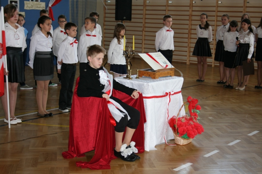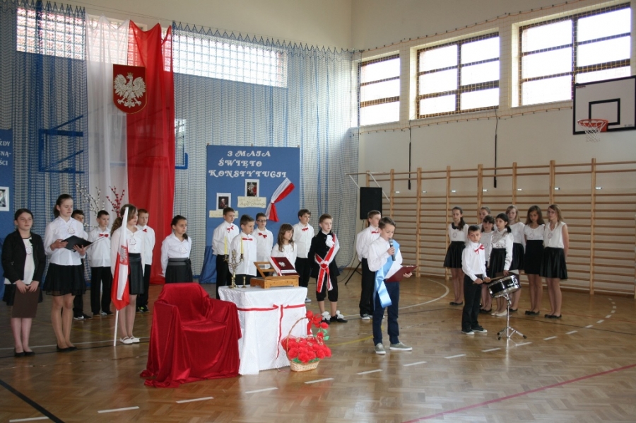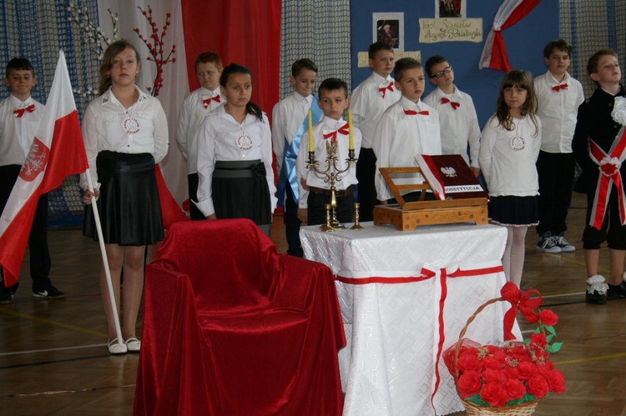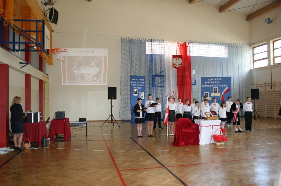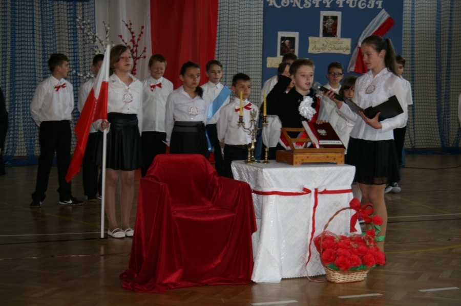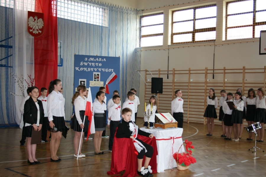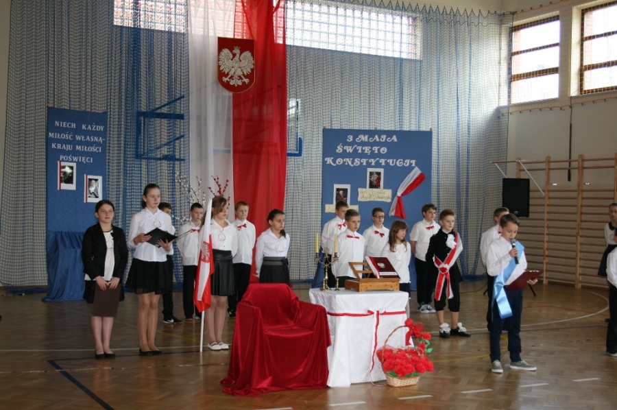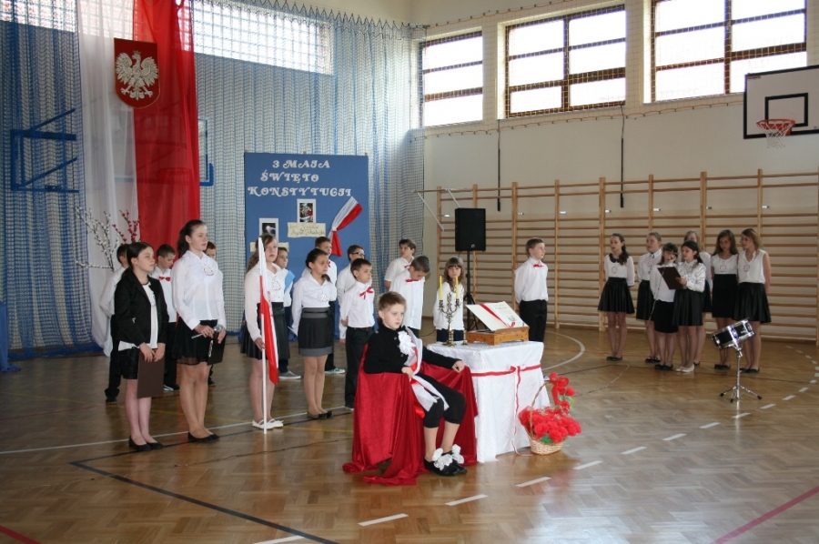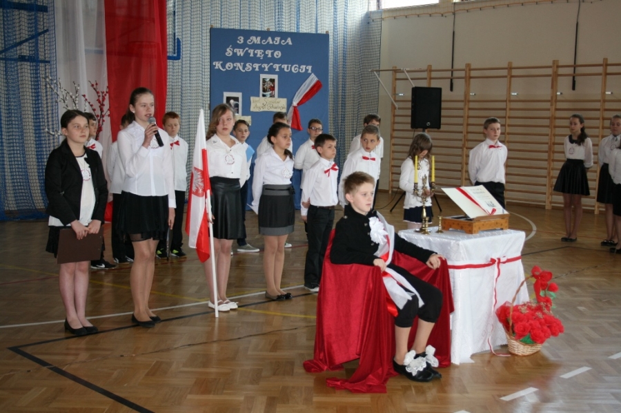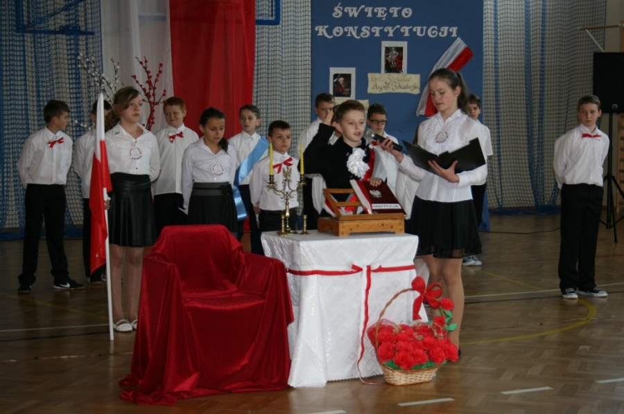 Tradycyjnie, na rozpoczęcie uroczystości, został odśpiewany hymn państwowy. Następnie uczniowie klasy 4 pięknie recytowali wiersze, mogliśmy również wysłuchać pieśni patriotycznych w wykonaniu uczennic klasy 6. W rolę króla Stanisława Augusta Poniatowskiego wcielił się Piotr Wąchała, a w Stanisława Małachowskiego – Dominik Kołodziej. O wspaniałą historyczną dekorację zadbały Panie Mariola Mamala