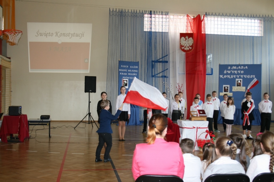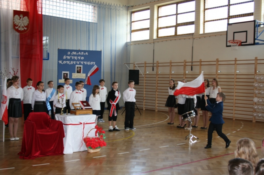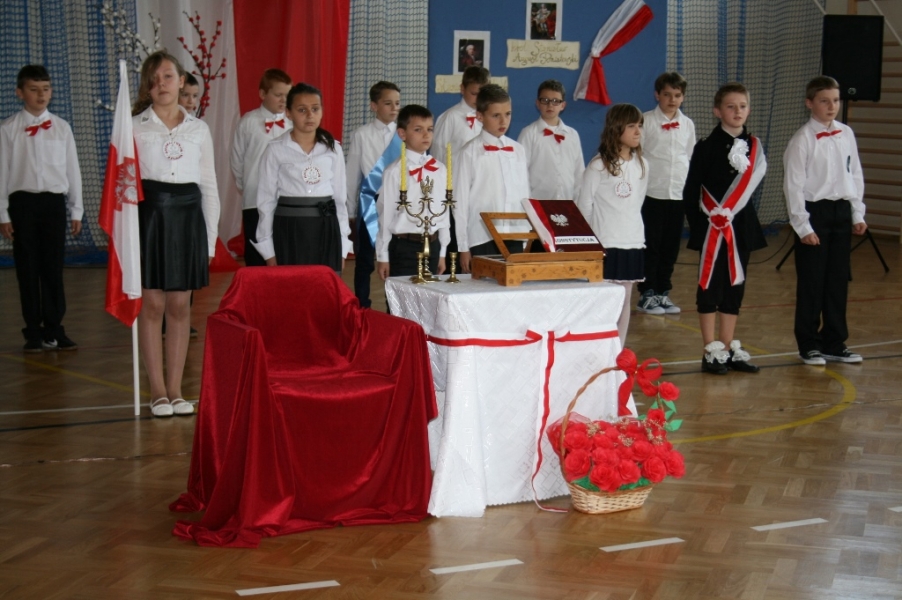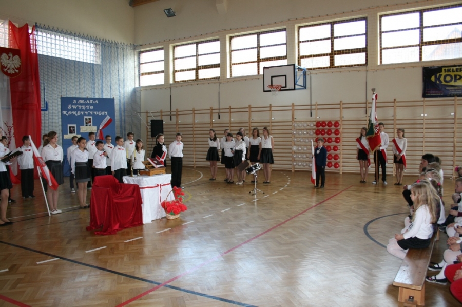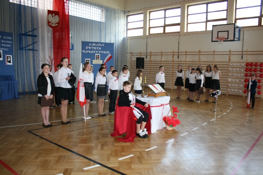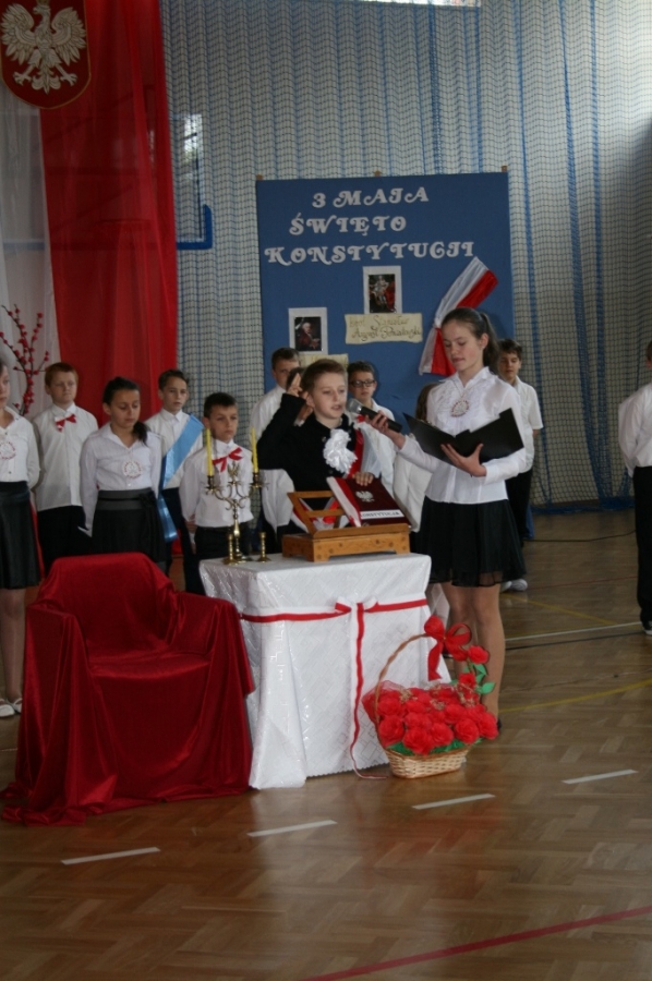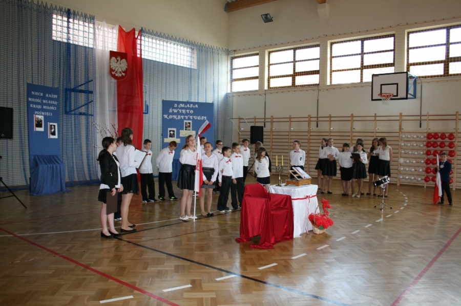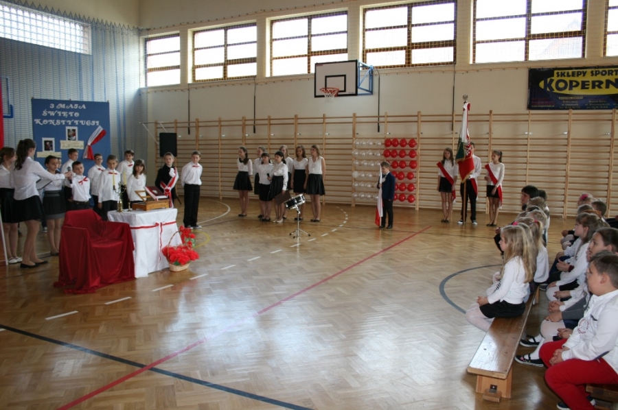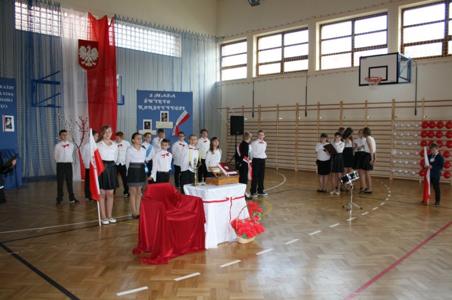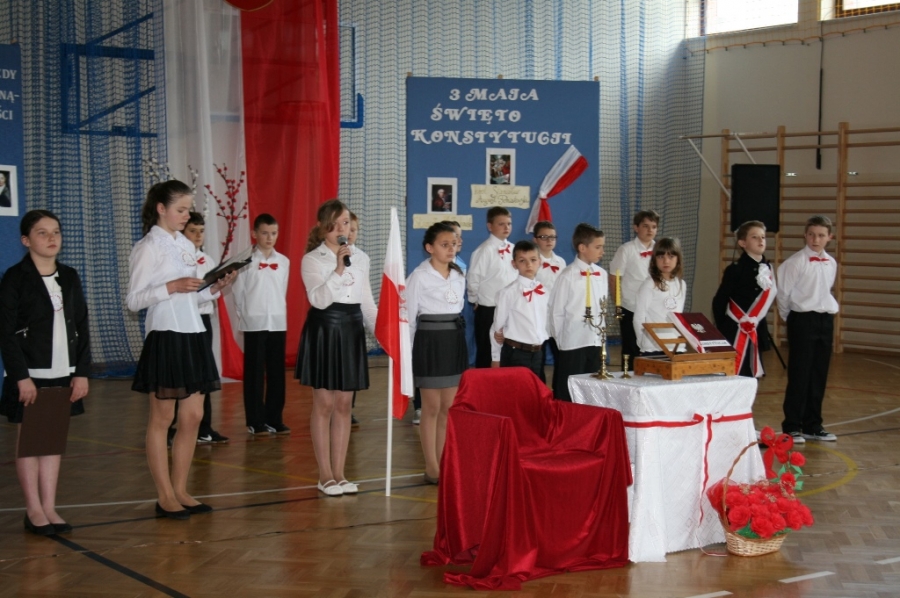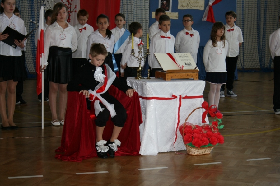 Tradycyjnie, na rozpoczęcie uroczystości, został odśpiewany hymn państwowy. Następnie uczniowie klasy 4 pięknie recytowali wiersze, mogliśmy również wysłuchać pieśni patriotycznych w wykonaniu uczennic klasy 6. W rolę króla Stanisława Augusta Poniatowskiego wcielił się Piotr Wąchała, a w Stanisława Małachowskiego – Dominik Kołodziej. O wspaniałą historyczną dekorację zadbały Panie Mariola Mamala