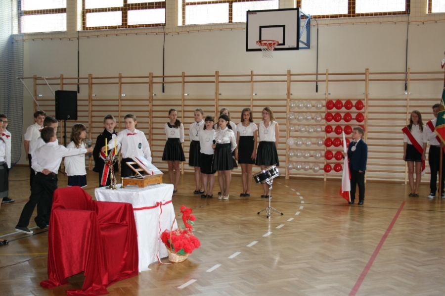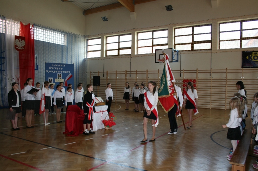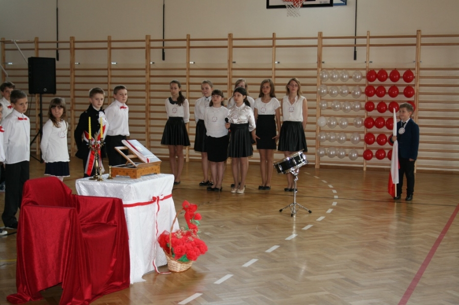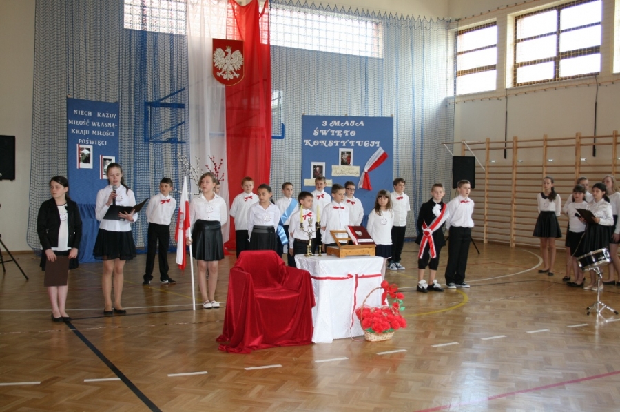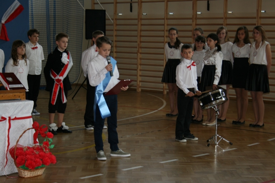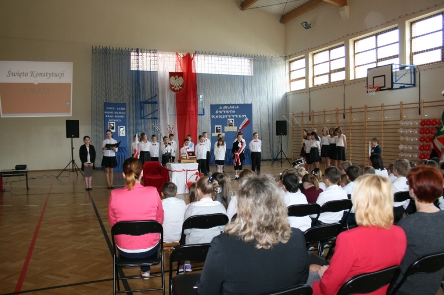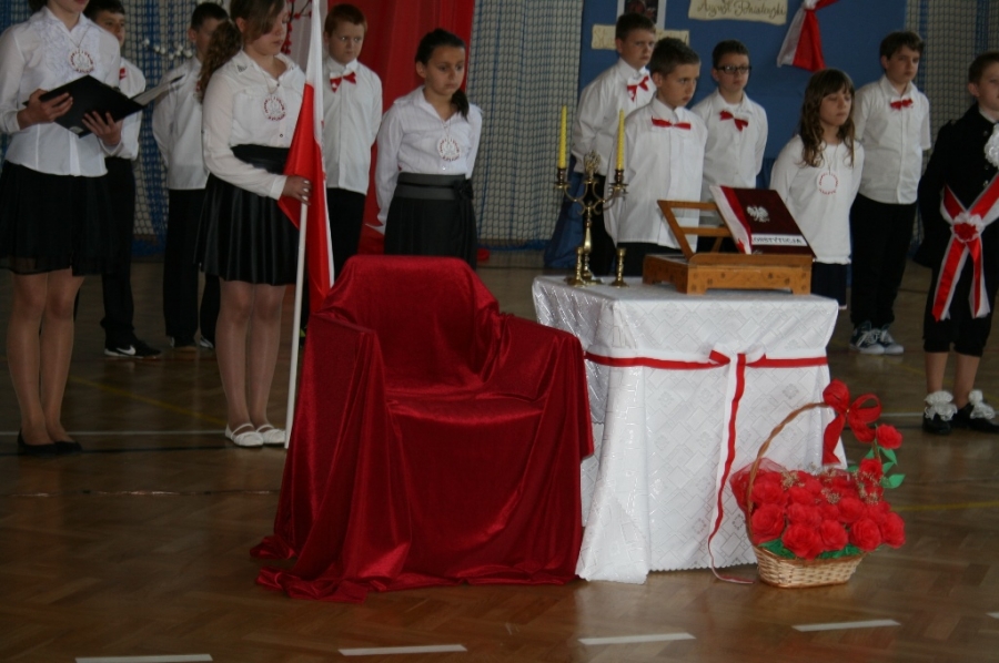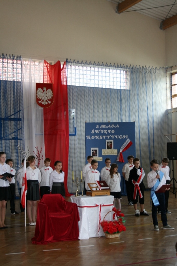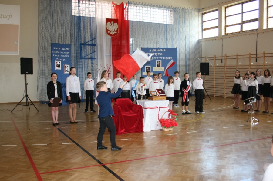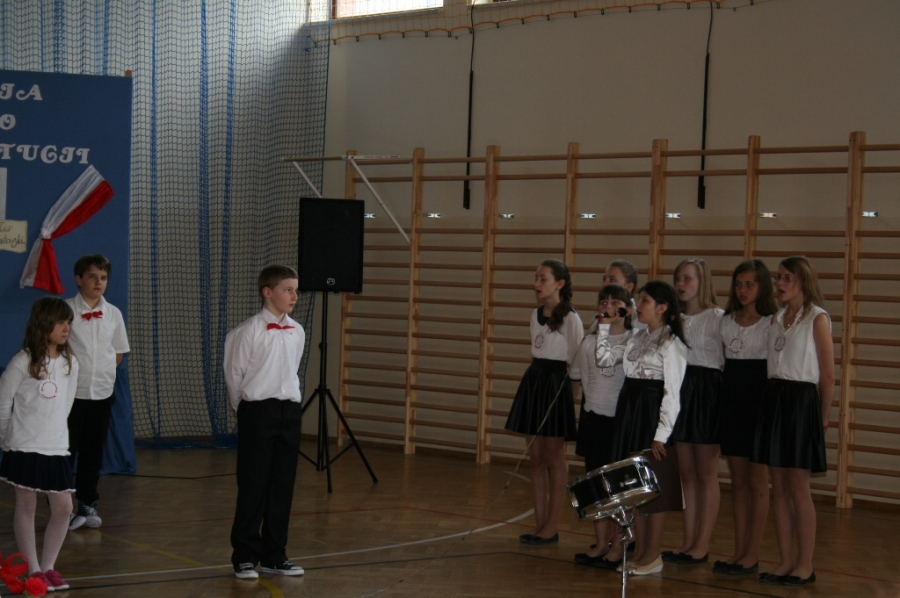 Tradycyjnie, na rozpoczęcie uroczystości, został odśpiewany hymn państwowy. Następnie uczniowie klasy 4 pięknie recytowali wiersze, mogliśmy również wysłuchać pieśni patriotycznych w wykonaniu uczennic klasy 6. W rolę króla Stanisława Augusta Poniatowskiego wcielił się Piotr Wąchała, a w Stanisława Małachowskiego – Dominik Kołodziej. O wspaniałą historyczną dekorację zadbały Panie Mariola Mamala