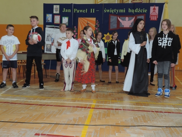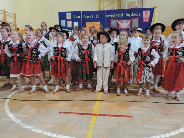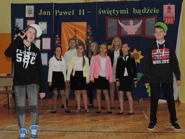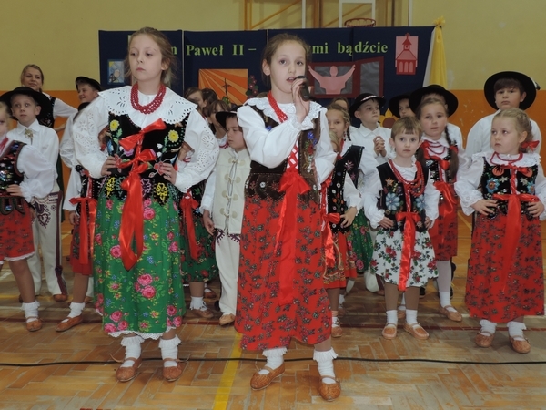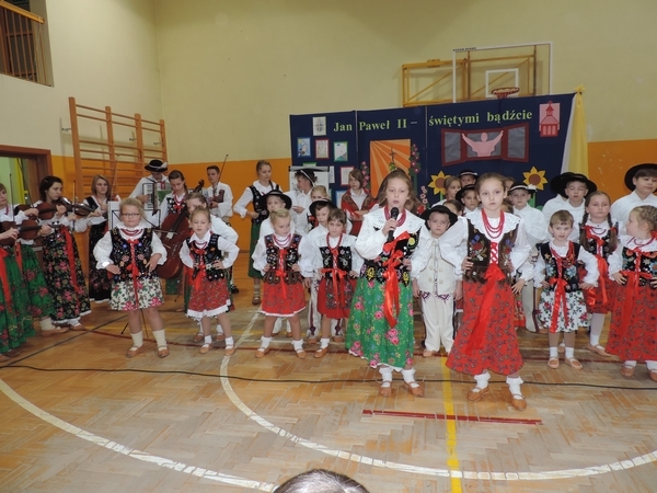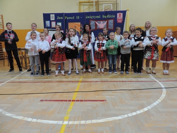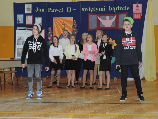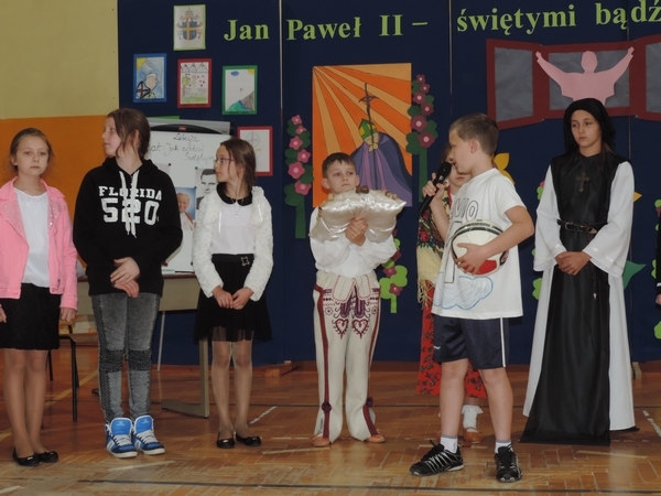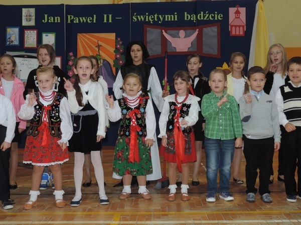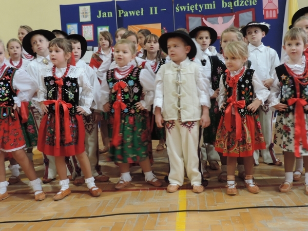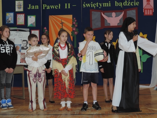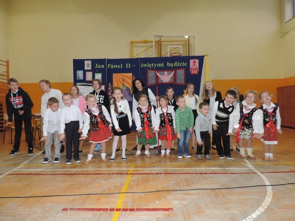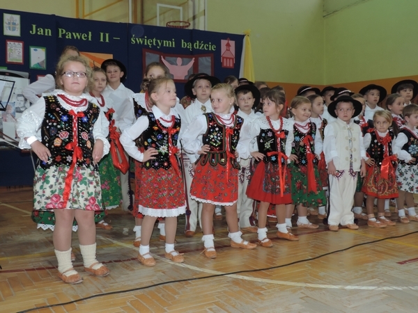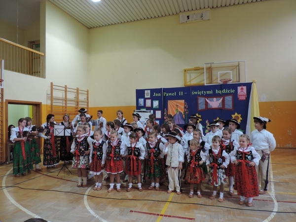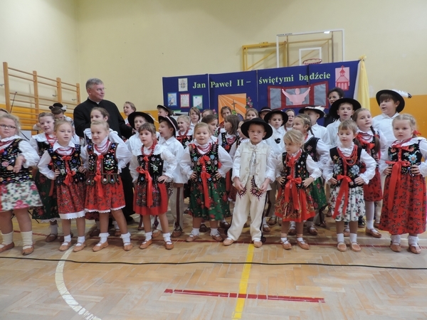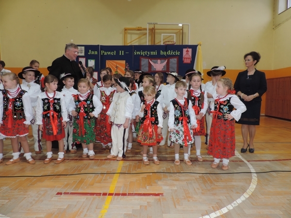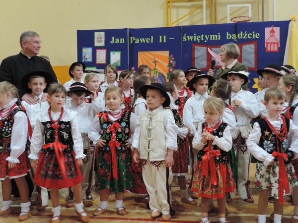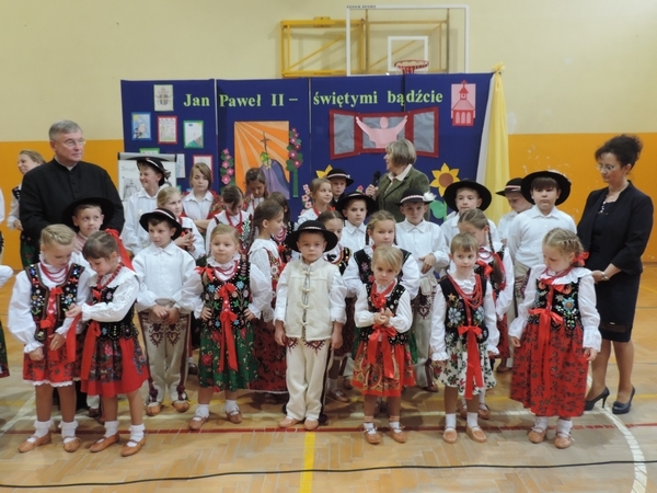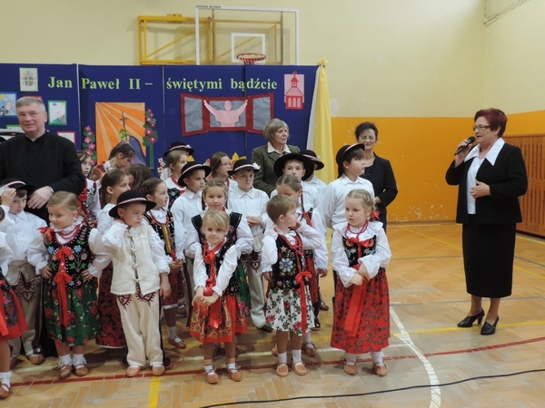Nie zabrakło też tych najmłodszych – przedszkolaków. Po uroczystej Mszy Świętej odprawionej przez Księdza Proboszcza – Jerzego Raźnego oraz naszego katechetę - księdza Tomasza udaliśmy się na autorski program słowno-muzyczny, przygotowany przez naszych uczniów pod kierunkiem pani katechetki Doroty – przebieg uroczystości relacjonują organizatorzy. Starsi uczniowie przybliżyli nam postać Św. Jana Pawła II, który swoim życiem dawał świadectwo wielkiej miłości do Boga i ludzi, a pomagając innym, wskazywał drogę do świętości. Przypomnieli, że świętymi zostały również dzieci w ich wieku, a nawet młodsze. Odwiedzili nas: Tereska od Dzieciątka Jezus, Franciszek i Hiacynta oraz Dominik Savio. Święci dali kilka dobrych rad. Żeby zostać świętymi musimy w zwykłe czynności wkładać bardzo dużo starań i miłości. Nie możemy zapomnieć też o modlitwie i talentach, które dostaliśmy. Uczniowie wykazali się nie tylko talentem aktorskim, ale też zdolnościami muzycznymi. Do teraz w naszych uszach dźwięczy refren jednej z piosenek: „Nie ma lepszego od Jana Pawła II,  nie ma lepszego od Patrona naszego.” Nasi pierwszacy przypomnieli nam, jak to Pan Jezus trudził się przy pracy, gdy był mały. Nie zabrakło też występu kapeli i zespołu „Mali Łostowianie”, którzy swoim śpiewem umilili uroczystość. Najmłodsza wokalistka ma zaledwie 3 latka. Po występach wszyscy zostali zaproszeni na uroczysty obiad.
