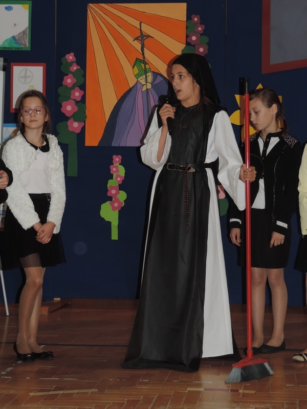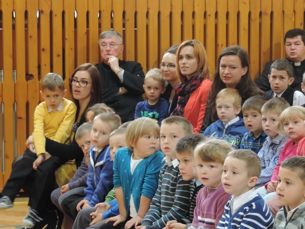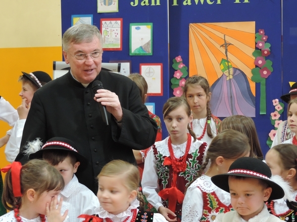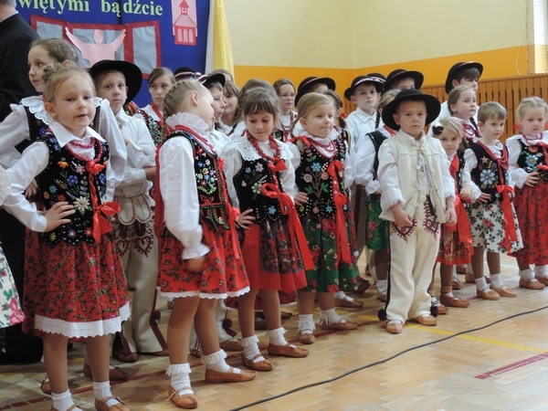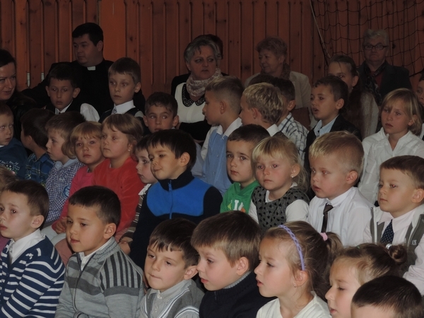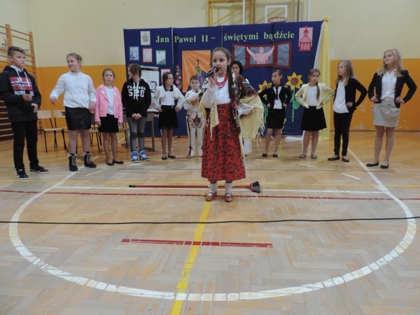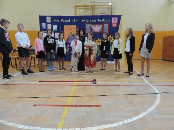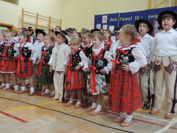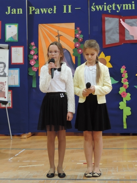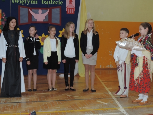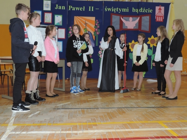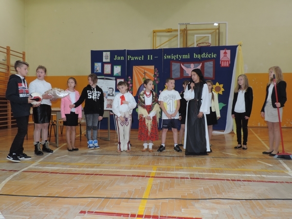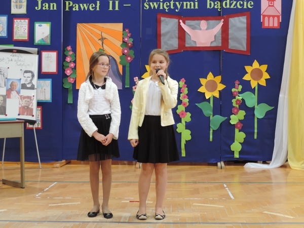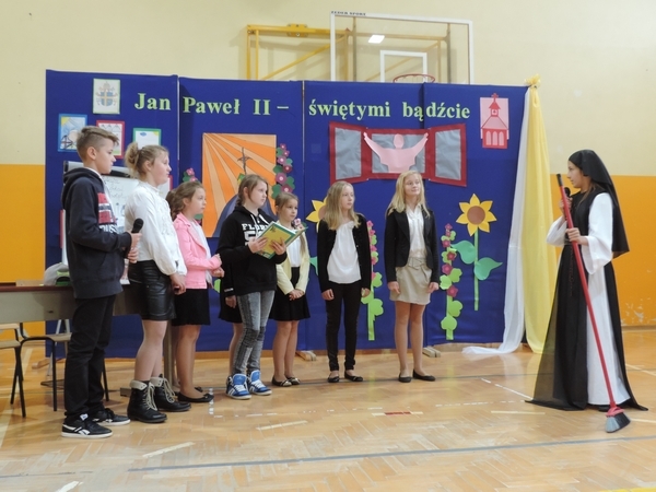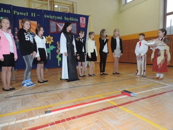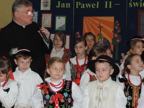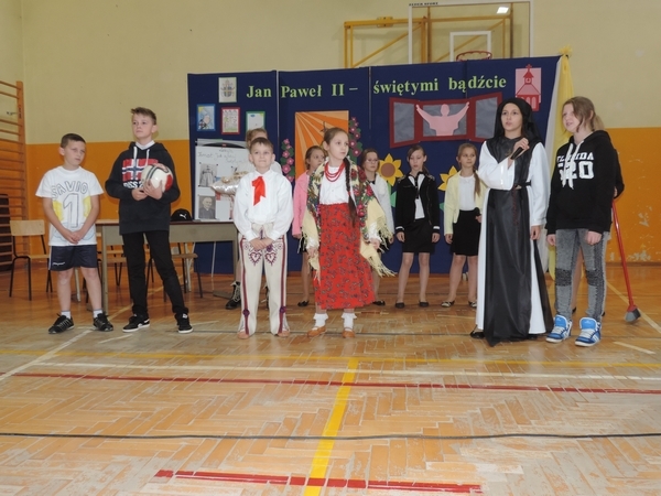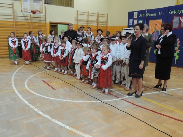 Nie zabrakło też tych najmłodszych – przedszkolaków. Po uroczystej Mszy Świętej odprawionej przez Księdza Proboszcza – Jerzego Raźnego oraz naszego katechetę - księdza Tomasza udaliśmy się na autorski program słowno-muzyczny, przygotowany przez naszych uczniów pod kierunkiem pani katechetki Doroty – przebieg uroczystości relacjonują organizatorzy. Starsi uczniowie przybliżyli nam postać Św. Jana Pawła II, który swoim życiem dawał świadectwo wielkiej miłości do Boga i ludzi, a pomagając innym, wskazywał drogę do świętości. Przypomnieli, że świętymi zostały również dzieci w ich wieku, a nawet młodsze. Odwiedzili nas: Tereska od Dzieciątka Jezus, Franciszek i Hiacynta oraz Dominik Savio. Święci dali kilka dobrych rad. Żeby zostać świętymi musimy w zwykłe czynności wkładać bardzo dużo starań i miłości. Nie możemy zapomnieć też o modlitwie i talentach, które dostaliśmy. Uczniowie wykazali się nie tylko talentem aktorskim, ale też zdolnościami muzycznymi. Do teraz w naszych uszach dźwięczy refren jednej z piosenek: „Nie ma lepszego od Jana Pawła II,  nie ma lepszego od Patrona naszego.” Nasi pierwszacy przypomnieli nam, jak to Pan Jezus trudził się przy pracy, gdy był mały. Nie zabrakło też występu kapeli i zespołu „Mali Łostowianie”, którzy swoim śpiewem umilili uroczystość. Najmłodsza wokalistka ma zaledwie 3 latka. Po występach wszyscy zostali zaproszeni na uroczysty obiad.
