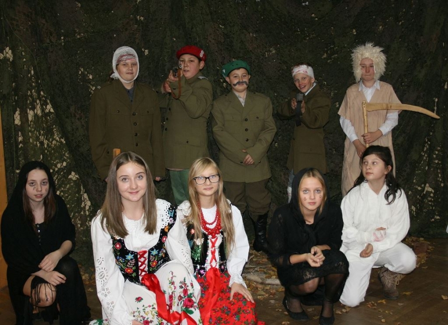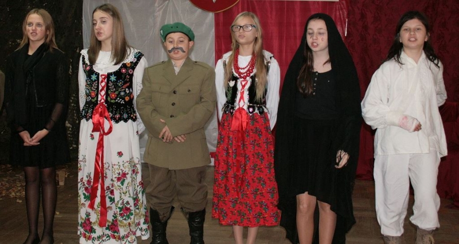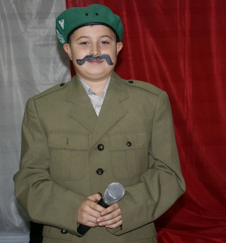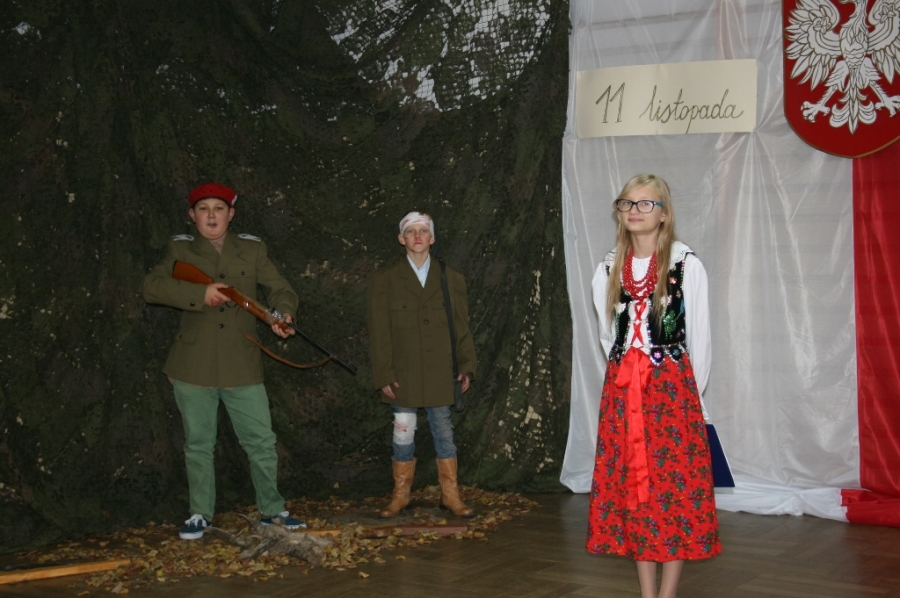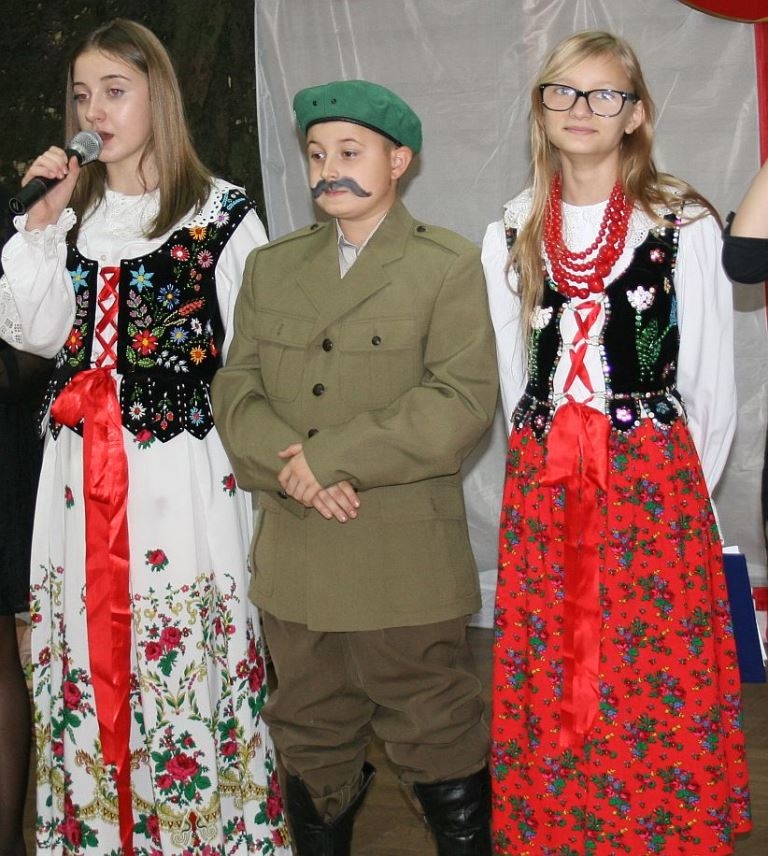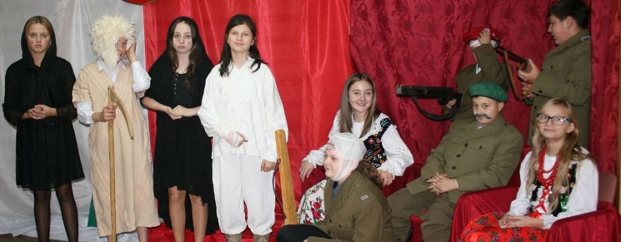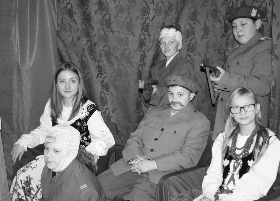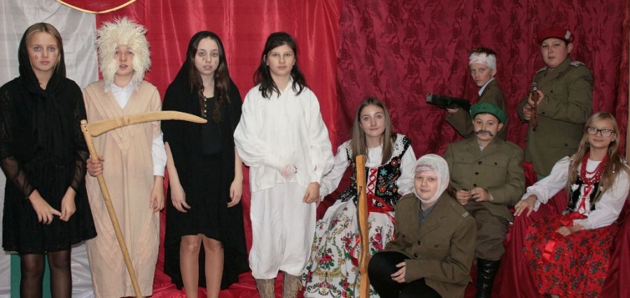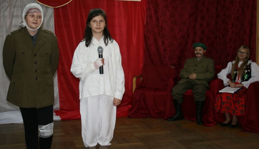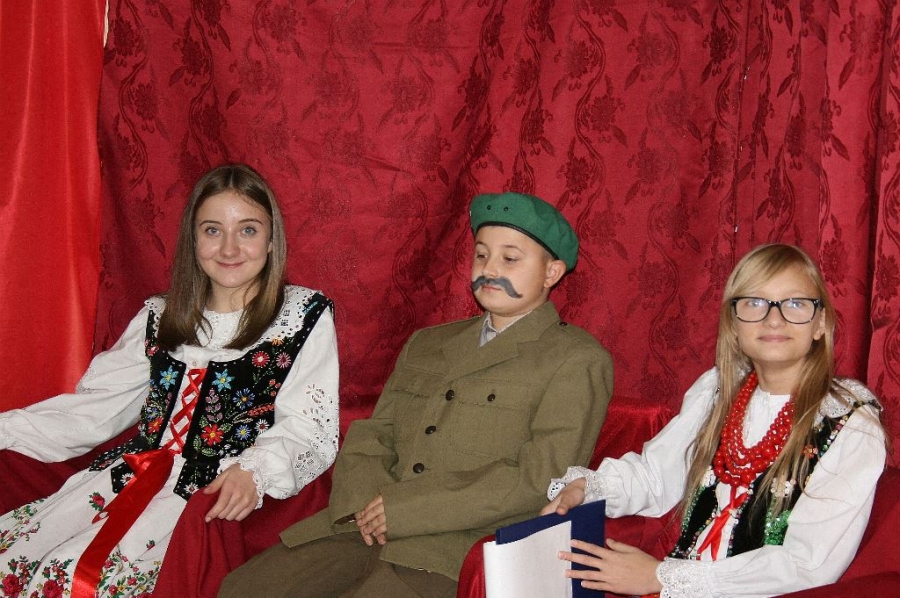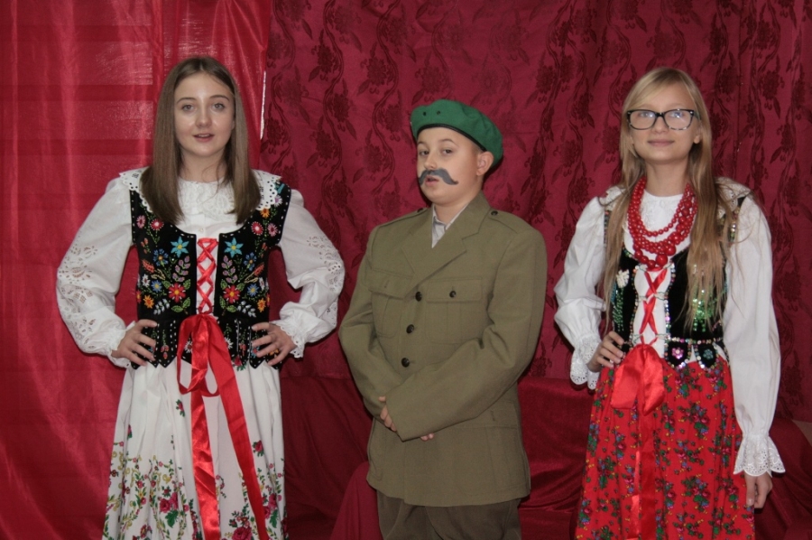 Bo jak wiemy w naszej historii było także wiele smutnych zdarzeń. Nie mogło również zabraknąć akcentu rodzimej kultury i dlatego też pojawiły się dziewczęta w strojach regionalnych. W naszą historię na trwale wpisały się pieśni patriotyczne, które zostały przypomniane przez uczniów. Jak tradycja nakazuje wspólne obchody rozpoczęliśmy od hymnu, a zakończyliśmy „Piechotą”. Były też nieco weselsze utwory takie jak: „Przybyli ułani” czy „Kadrówka”… Wejście Kosyniera zapowiedział utwór „Krakowiak Kościuszki”, a postać Piłsudskiego z odezwą do żołnierzy przywołał utwór „Hej Komendancie”… Nasi uczniowie kolejny już raz pokazali, że potrafią aktywnie uczestniczyć w życiu szkoły i są wrażliwi na odbiór jak i również przekaz treści historycznych. A klasa VI za swój występ otrzymała od kolegów i koleżanek gromkie brawa!