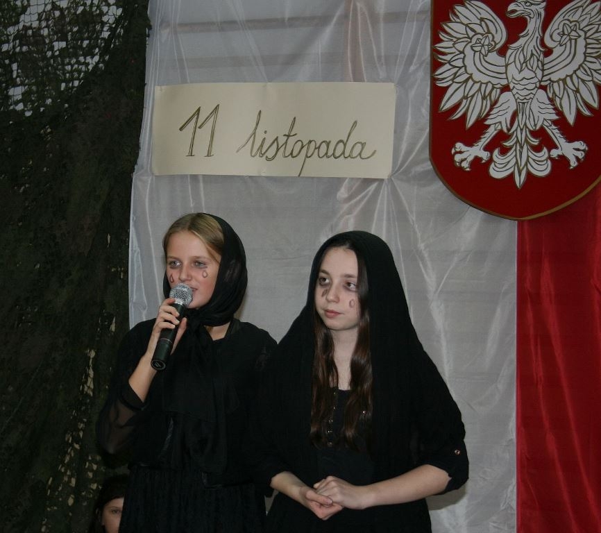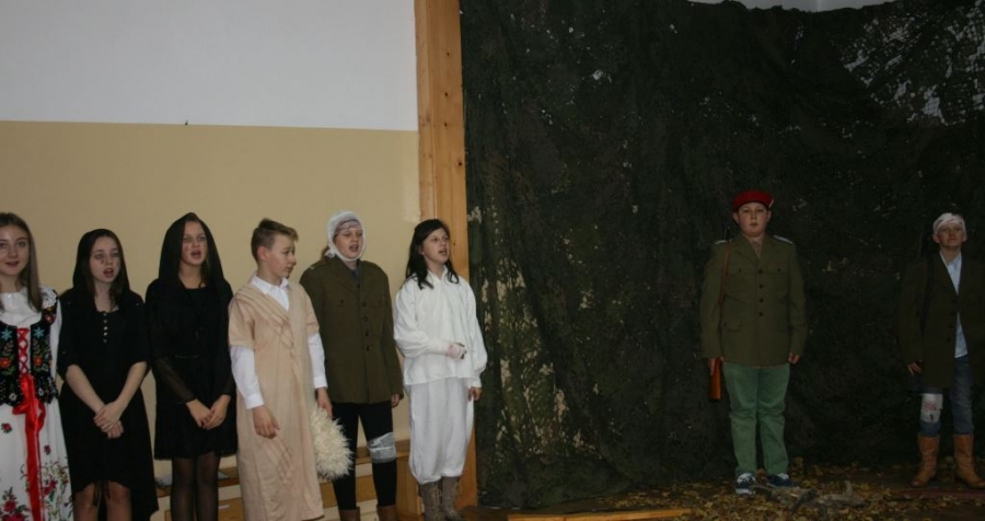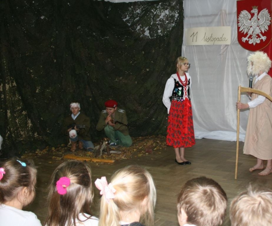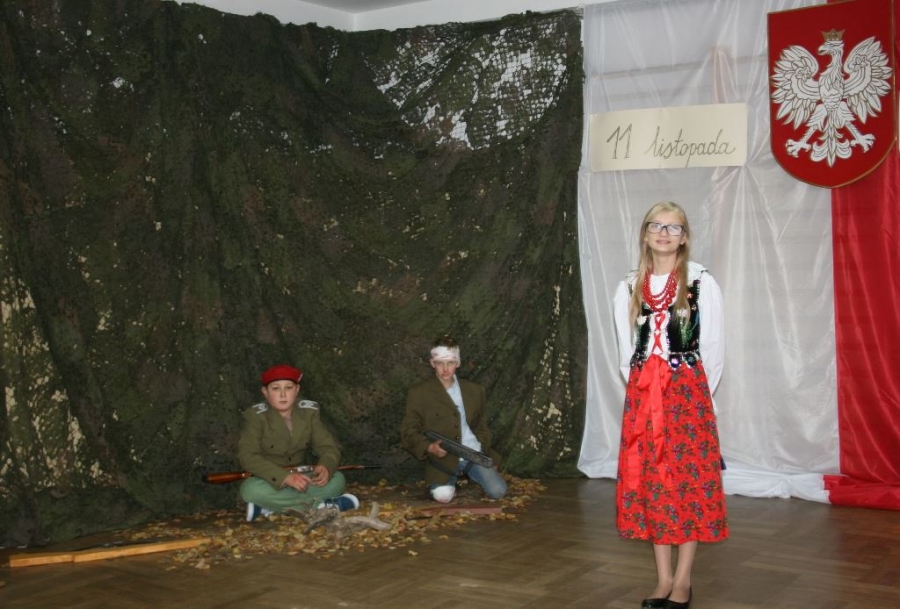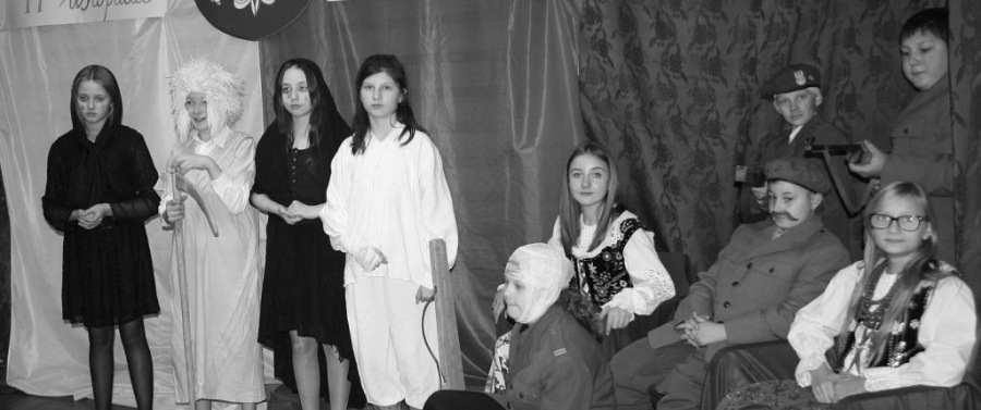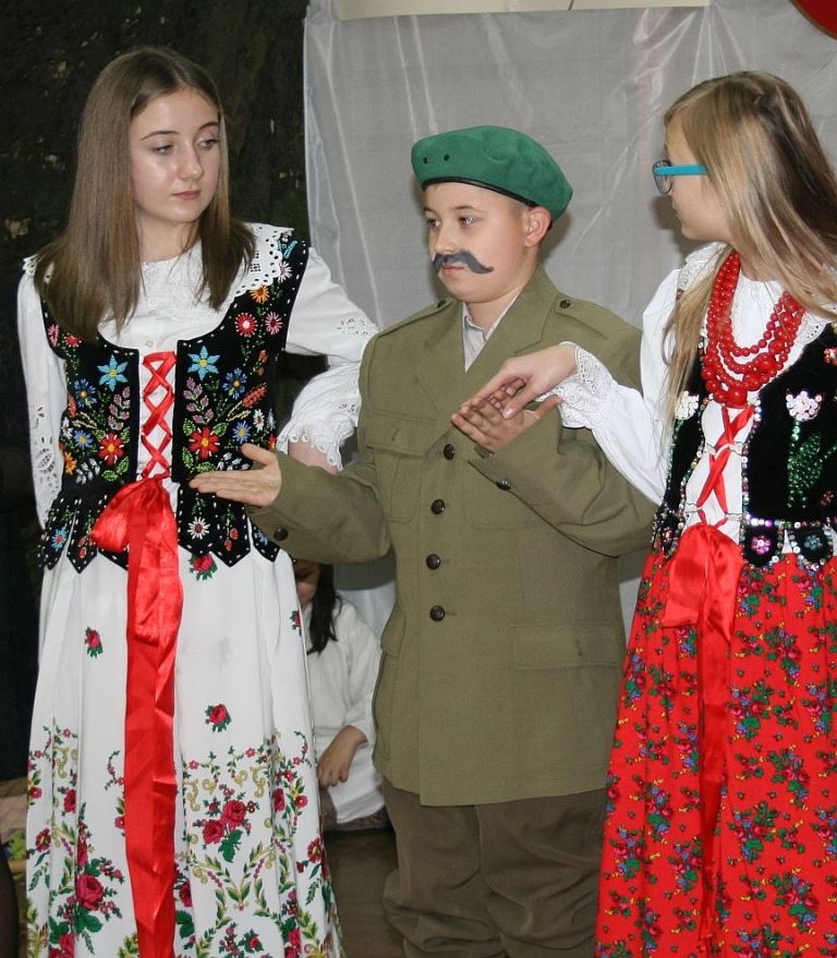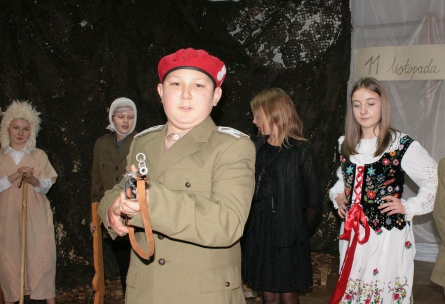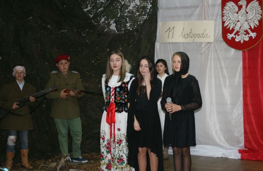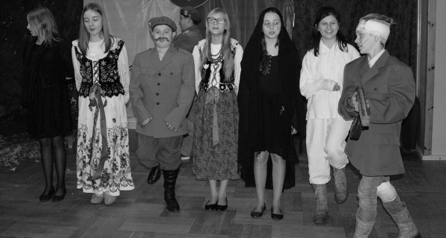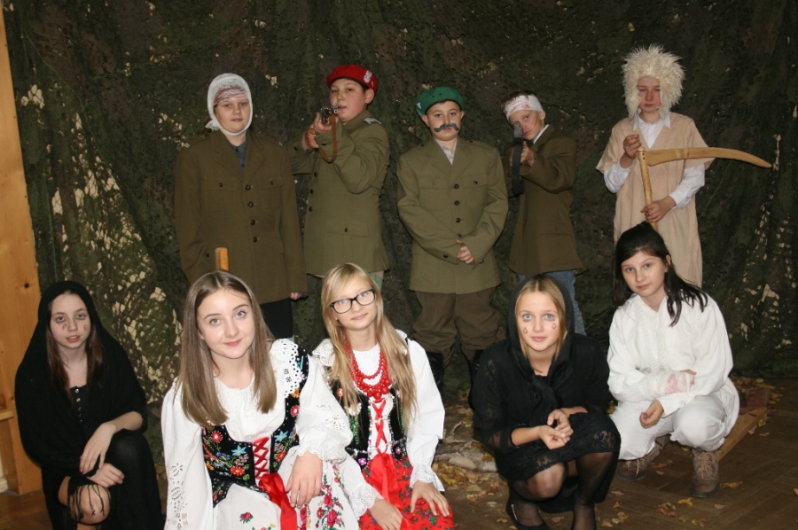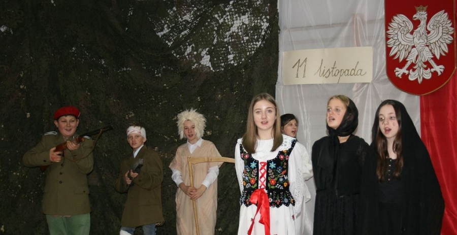 Bo jak wiemy w naszej historii było także wiele smutnych zdarzeń. Nie mogło również zabraknąć akcentu rodzimej kultury i dlatego też pojawiły się dziewczęta w strojach regionalnych. W naszą historię na trwale wpisały się pieśni patriotyczne, które zostały przypomniane przez uczniów. Jak tradycja nakazuje wspólne obchody rozpoczęliśmy od hymnu, a zakończyliśmy „Piechotą”. Były też nieco weselsze utwory takie jak: „Przybyli ułani” czy „Kadrówka”… Wejście Kosyniera zapowiedział utwór „Krakowiak Kościuszki”, a postać Piłsudskiego z odezwą do żołnierzy przywołał utwór „Hej Komendancie”… Nasi uczniowie kolejny już raz pokazali, że potrafią aktywnie uczestniczyć w życiu szkoły i są wrażliwi na odbiór jak i również przekaz treści historycznych. A klasa VI za swój występ otrzymała od kolegów i koleżanek gromkie brawa!