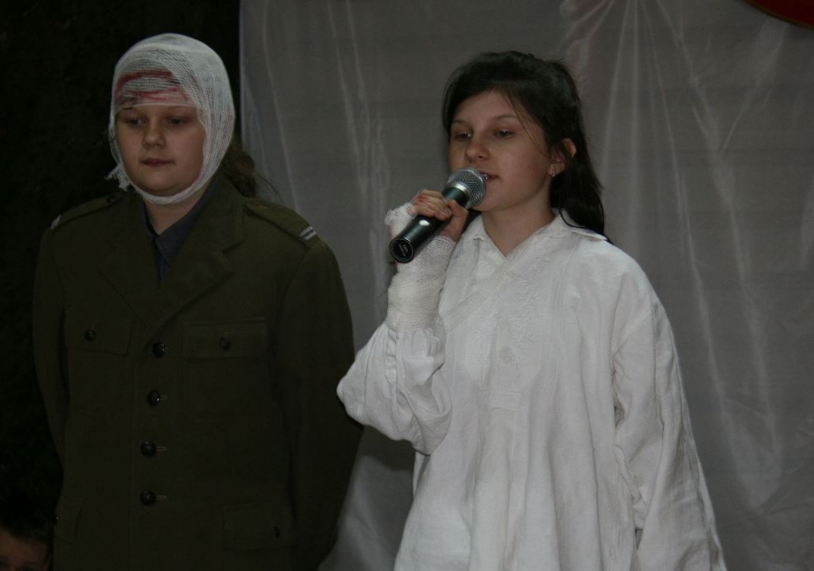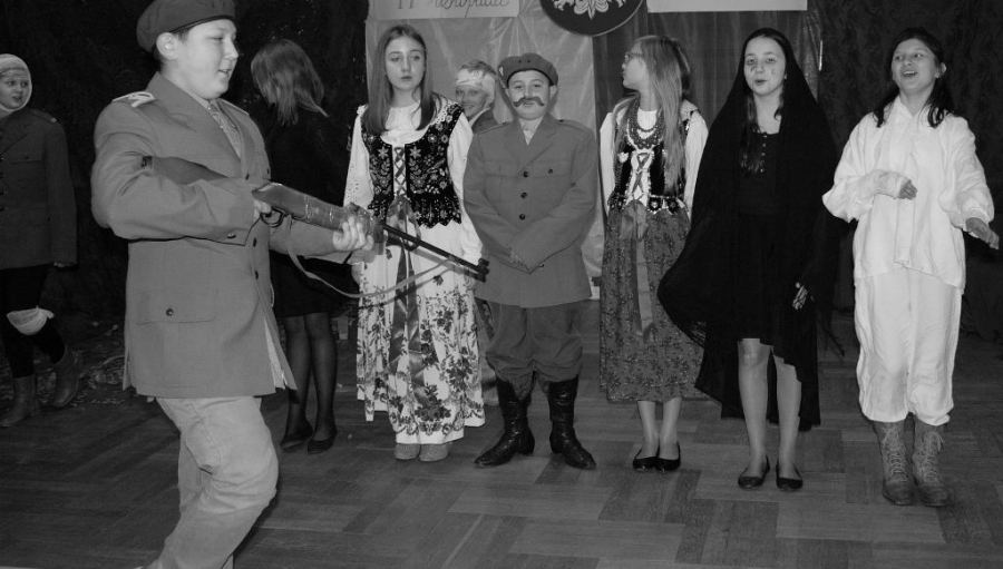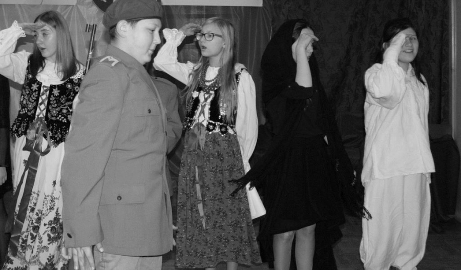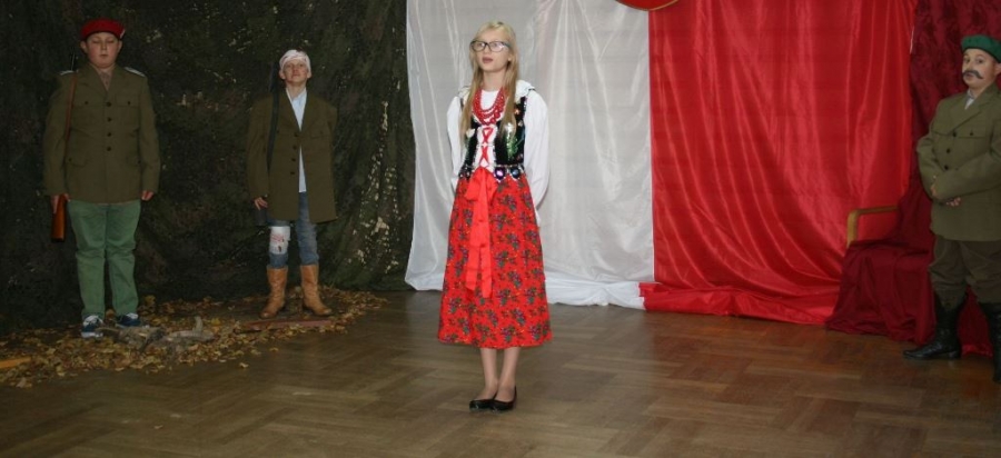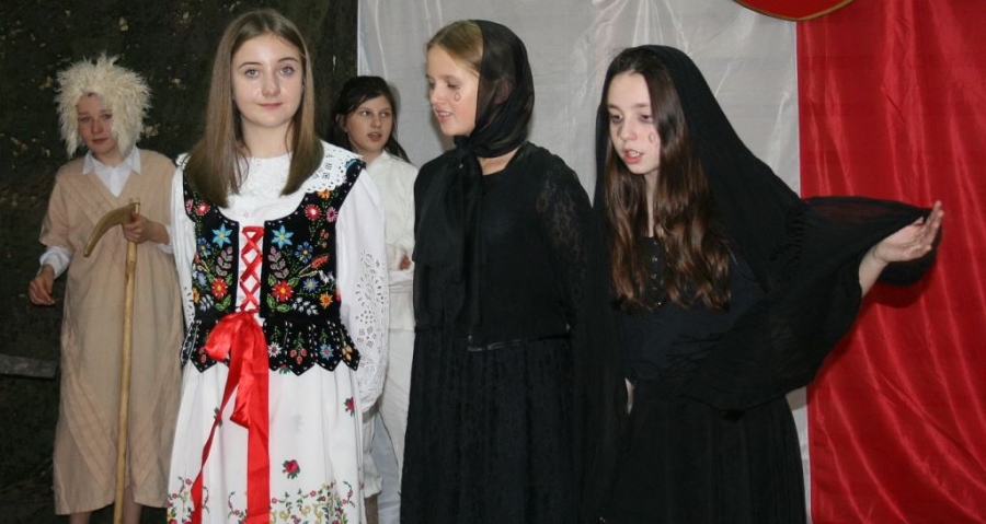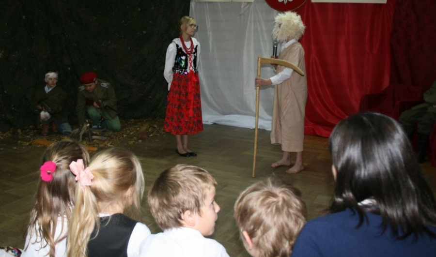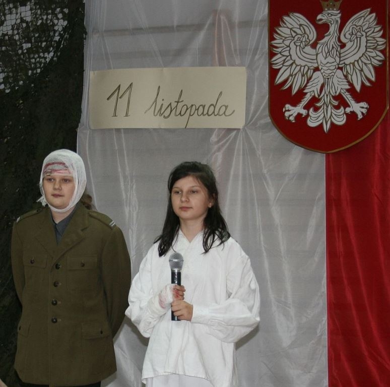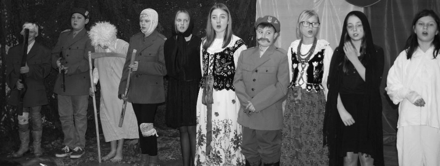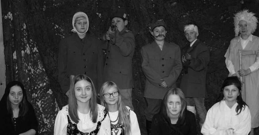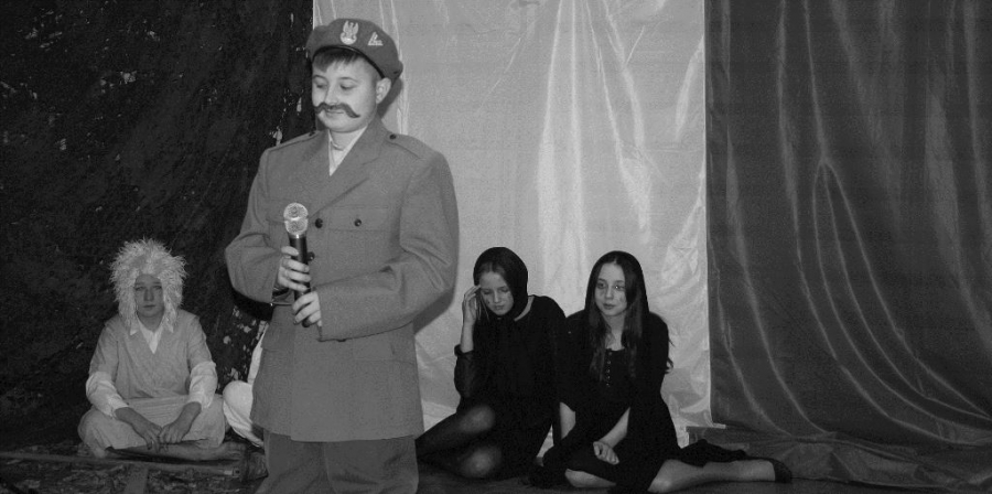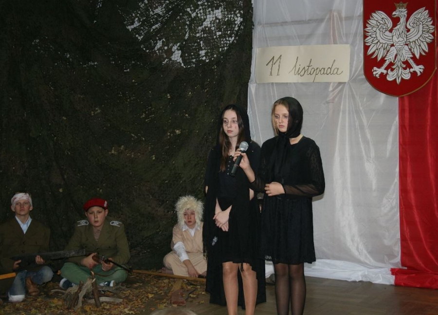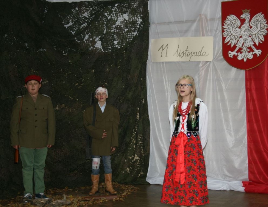 Bo jak wiemy w naszej historii było także wiele smutnych zdarzeń. Nie mogło również zabraknąć akcentu rodzimej kultury i dlatego też pojawiły się dziewczęta w strojach regionalnych. W naszą historię na trwale wpisały się pieśni patriotyczne, które zostały przypomniane przez uczniów. Jak tradycja nakazuje wspólne obchody rozpoczęliśmy od hymnu, a zakończyliśmy „Piechotą”. Były też nieco weselsze utwory takie jak: „Przybyli ułani” czy „Kadrówka”… Wejście Kosyniera zapowiedział utwór „Krakowiak Kościuszki”, a postać Piłsudskiego z odezwą do żołnierzy przywołał utwór „Hej Komendancie”… Nasi uczniowie kolejny już raz pokazali, że potrafią aktywnie uczestniczyć w życiu szkoły i są wrażliwi na odbiór jak i również przekaz treści historycznych. A klasa VI za swój występ otrzymała od kolegów i koleżanek gromkie brawa!