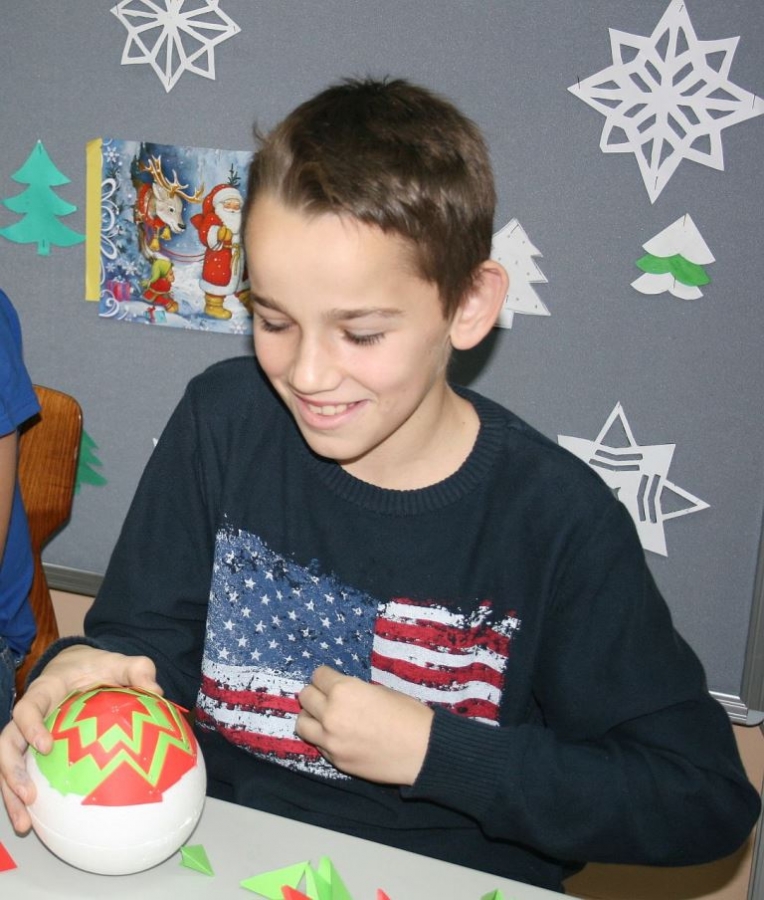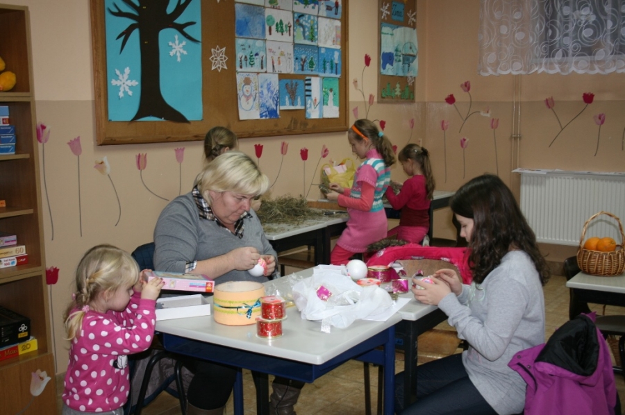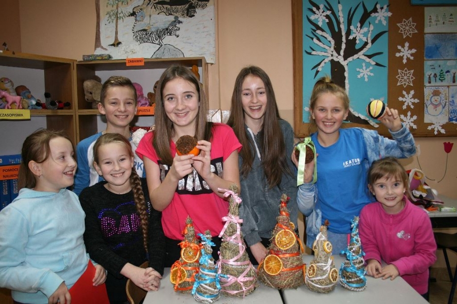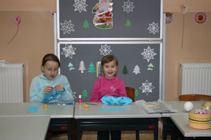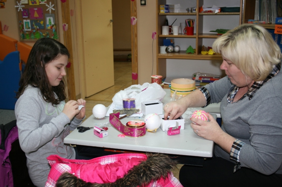 Były to choinki z siana, pachnące pomarańcze i ozdoby z papieru. Ale w trakcie zajęć powstawały również mieniące się kolorami bombki z cekinów i tasiemek.