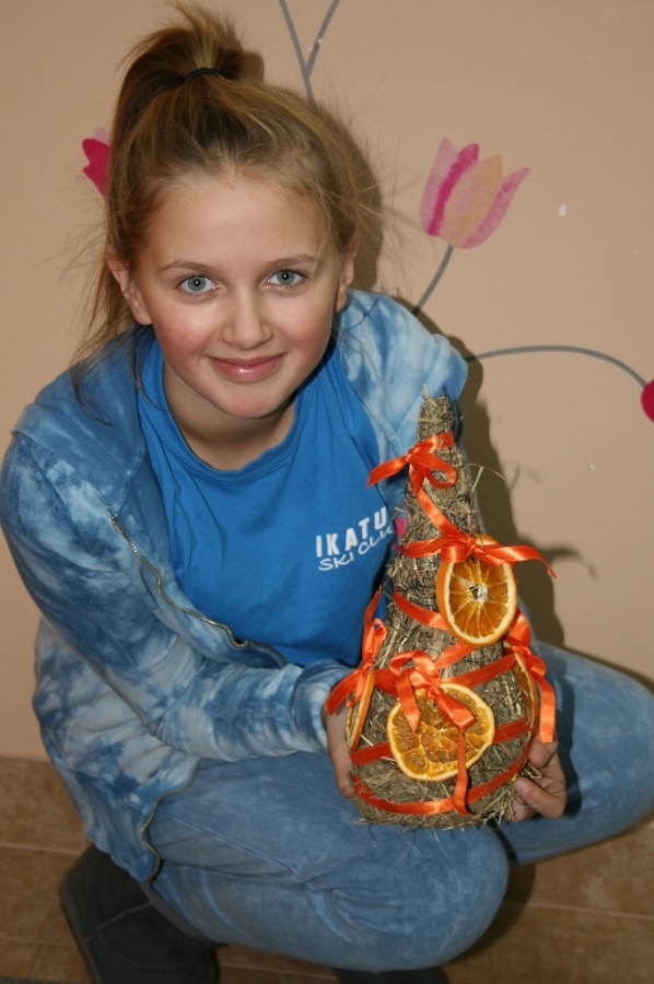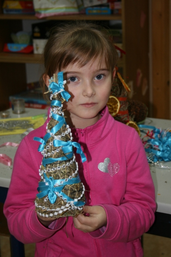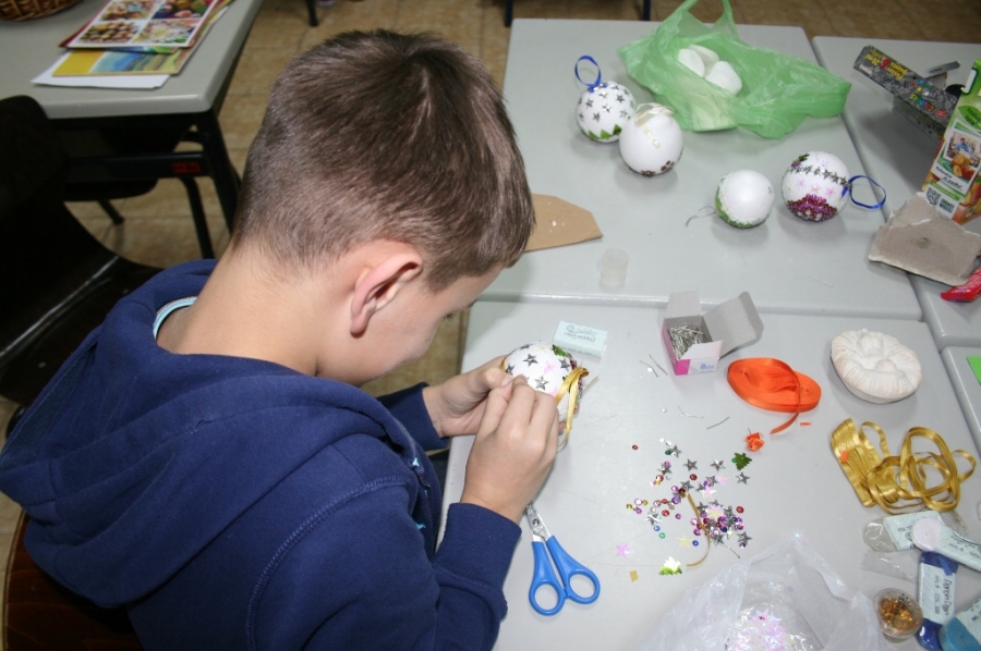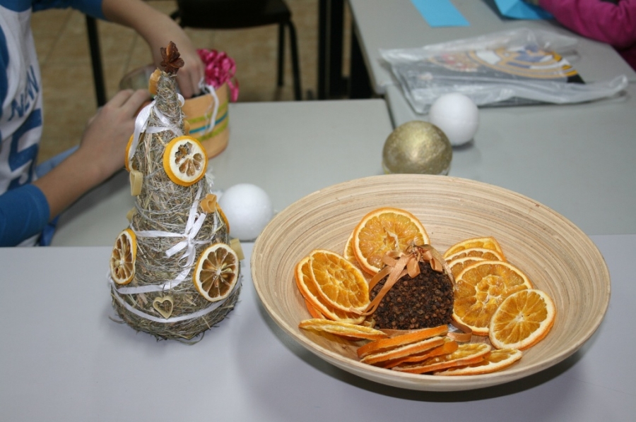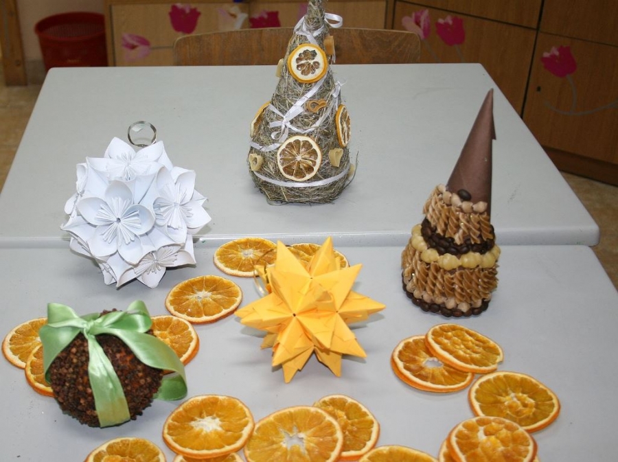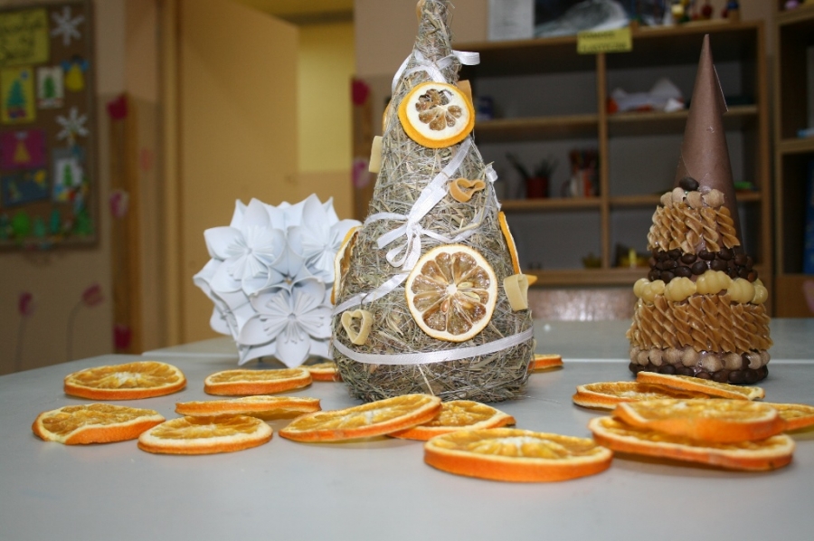 Były to choinki z siana, pachnące pomarańcze i ozdoby z papieru. Ale w trakcie zajęć powstawały również mieniące się kolorami bombki z cekinów i tasiemek.