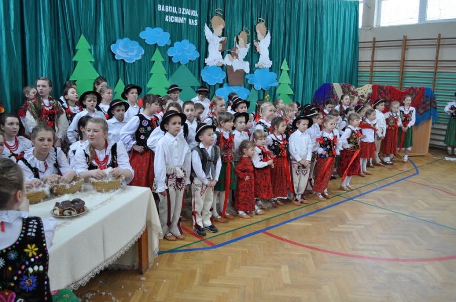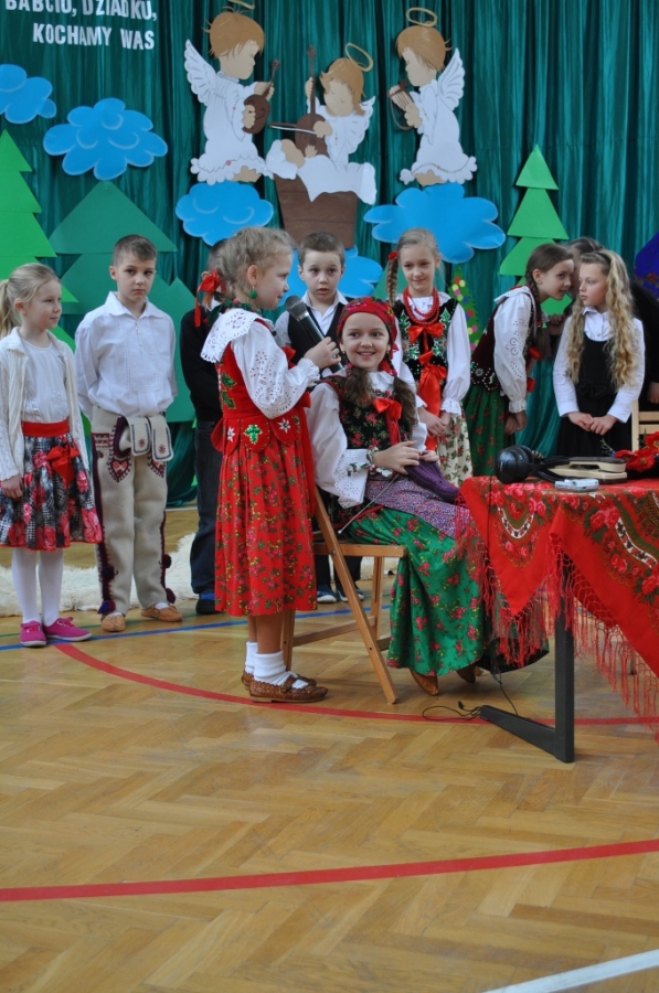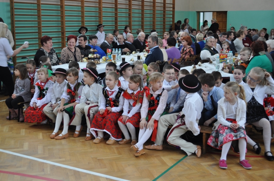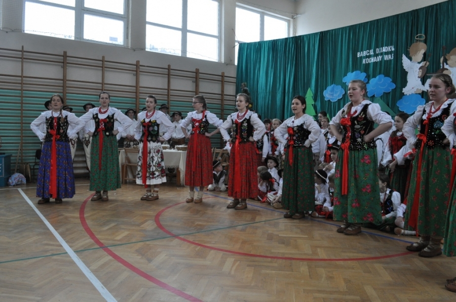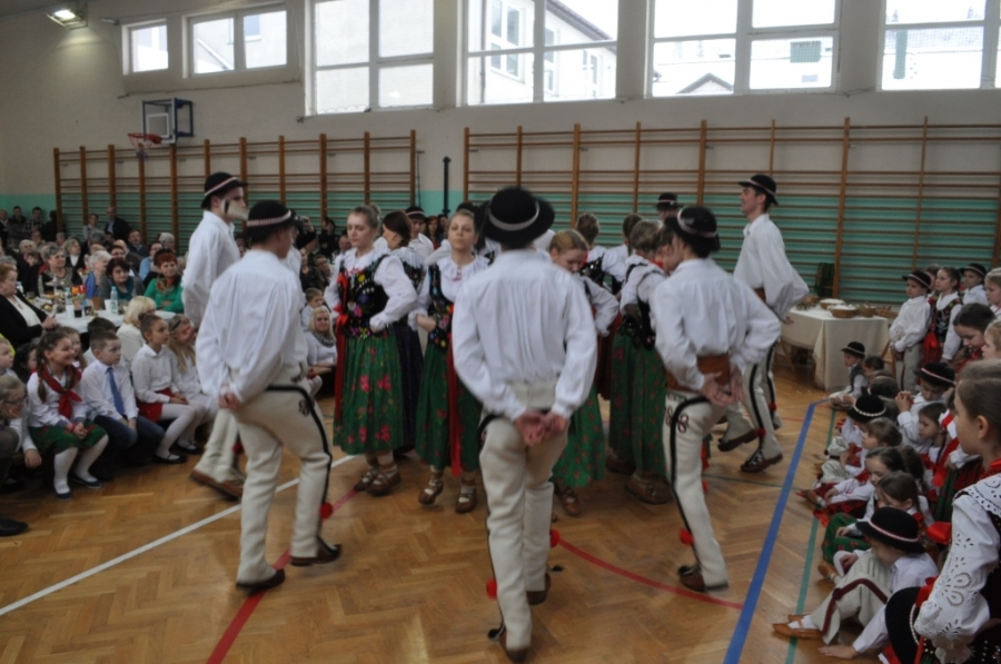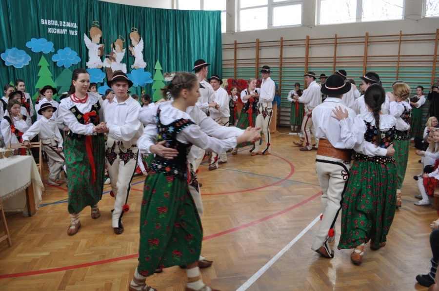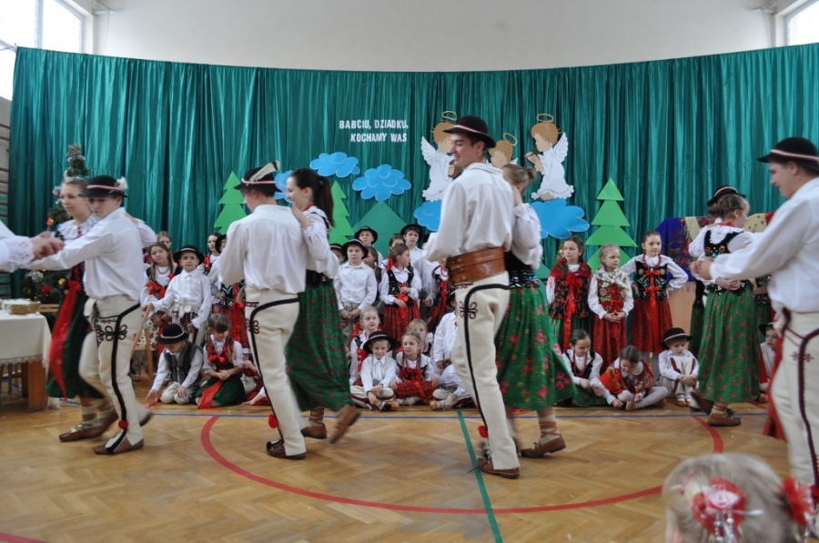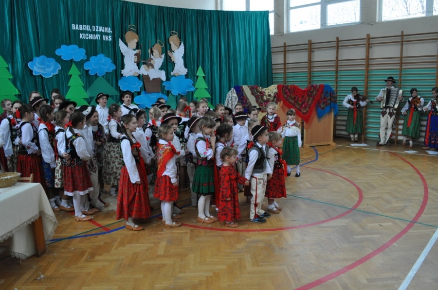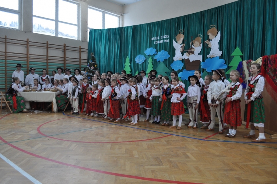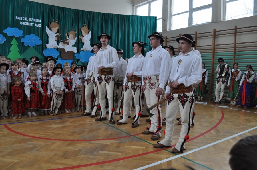 Zaproszeni dziadkowie licznie przybyli, aby podziwiać występy swoich wnucząt. Dla kochanych gości przygotowano poczęstunek oraz wspaniały program artystyczny. Uroczystość rozpoczęła klasa 0, która piosenką i wierszami wprowadziła wszystkich w odświętny nastrój. Wspaniałymi aktorami okazali się uczniowie z kl. II i III, którzy zaprezentowali przedstawienia o Babci i Dziadku. Program artystyczny zapewnił przybyłych gości o tym, że ich wnuczęta nie tylko osiągają wspaniałe wyniki w nauce, ale również posiadają zdolności muzyczne oraz aktorskie. W kolejnej części uroczystości wystąpiła klasa I wraz z Zespołem Regionalnym ,,Mali Zagórzanie’’ oraz ,,Doliną Mszanki’’. W swoim programie przedstawili obrzęd ,,Skubania pierza’’ gdzie nie zabrakło pięknie zaśpiewanych kolęd i pastorałek oraz tańców wykonanych przez dorosłych jak i małych górali. Nie zabrakło życzeń tym razem wyśpiewanych i skierowanych do najbliższych. Każda Babcia i Dziadek otrzymali piękny upominek wykonany własnoręcznie przez Zespół ,,Mali Zagórzanie i Dolinę Mszanki’’. Wzruszeń nie było końca w niejednych oczach widać było radość i szczęście. Oklasków nie brakowało. Gorące słowa podziękowania należą się również rodzicom, którzy nie tylko dowieźli honorowych gości na uroczystość, ale okazali dużą pomoc w przygotowaniu i przeprowadzeniu imprezy. Dziękujemy również Przewodniczącej Rady Gminy Mszana Dolna – Pani Aleksandrze Kani, która przyjęła nasze zaproszenie i przybyła na tę wspaniałą uroczystość. Życzenia drogim solenizantom złożyła także Pani Marta Skowronek , dyrektor ZPO w Mszanie Górnej.