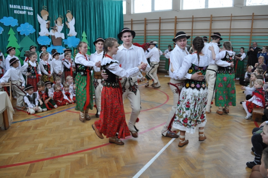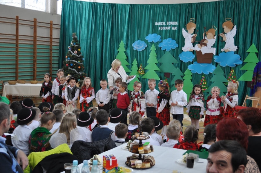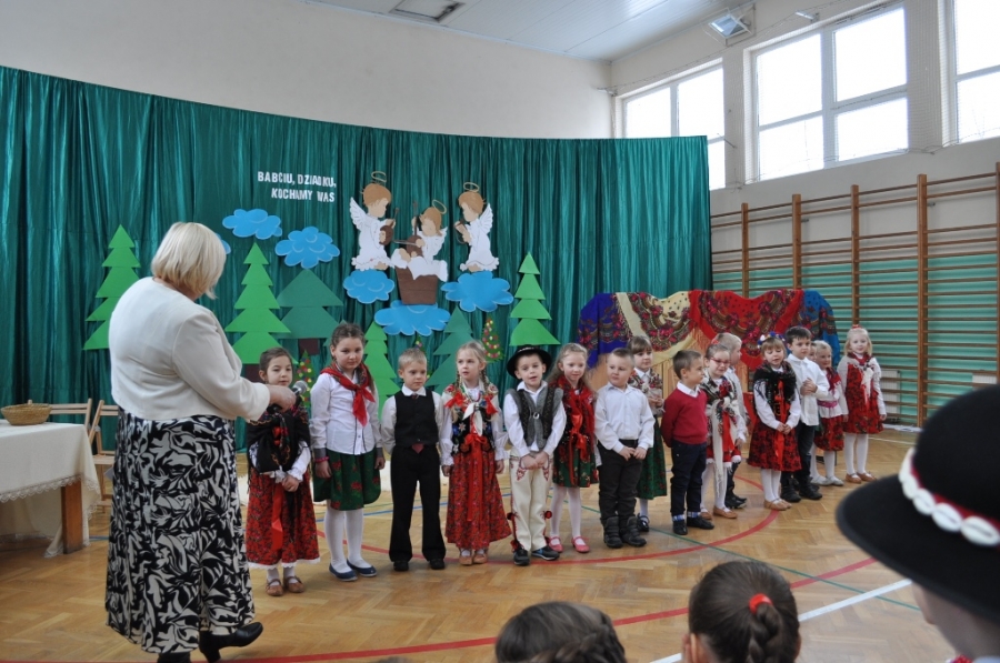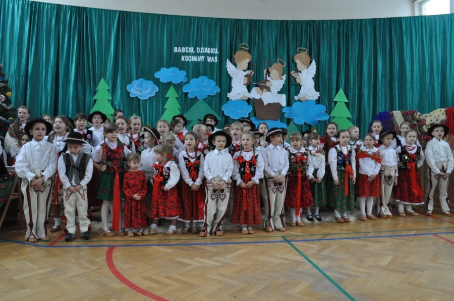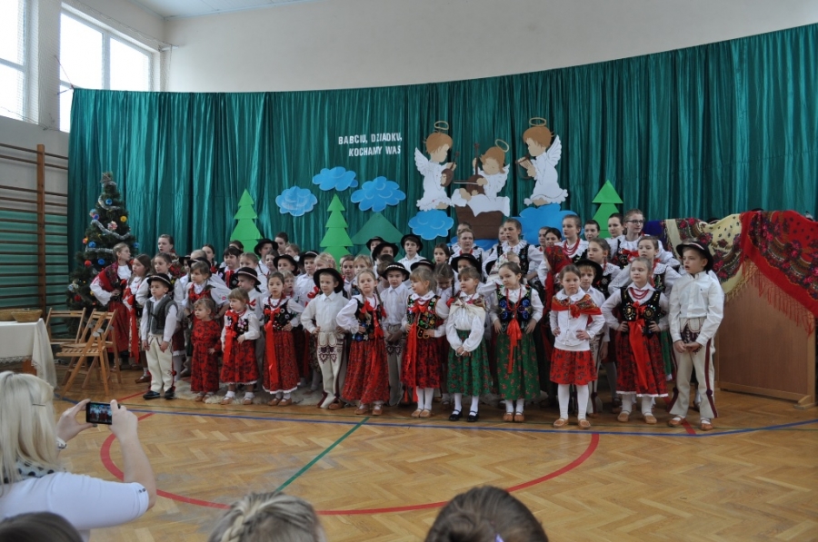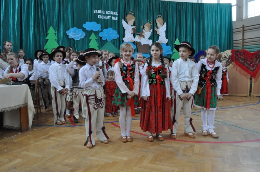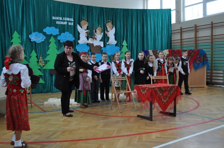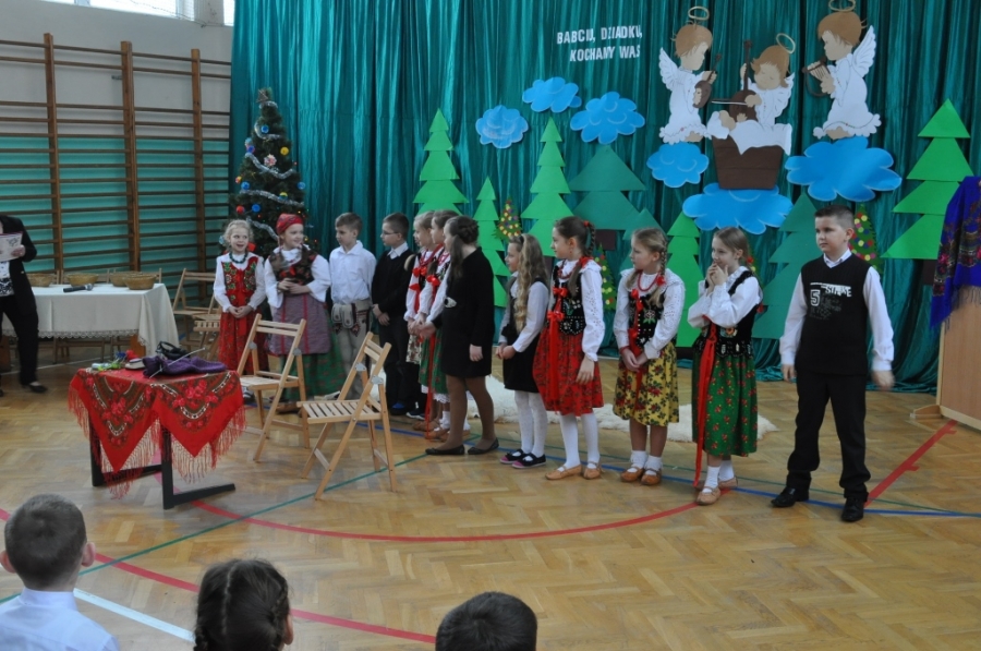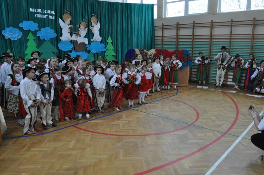 Zaproszeni dziadkowie licznie przybyli, aby podziwiać występy swoich wnucząt. Dla kochanych gości przygotowano poczęstunek oraz wspaniały program artystyczny. Uroczystość rozpoczęła klasa 0, która piosenką i wierszami wprowadziła wszystkich w odświętny nastrój. Wspaniałymi aktorami okazali się uczniowie z kl. II i III, którzy zaprezentowali przedstawienia o Babci i Dziadku. Program artystyczny zapewnił przybyłych gości o tym, że ich wnuczęta nie tylko osiągają wspaniałe wyniki w nauce, ale również posiadają zdolności muzyczne oraz aktorskie. W kolejnej części uroczystości wystąpiła klasa I wraz z Zespołem Regionalnym ,,Mali Zagórzanie’’ oraz ,,Doliną Mszanki’’. W swoim programie przedstawili obrzęd ,,Skubania pierza’’ gdzie nie zabrakło pięknie zaśpiewanych kolęd i pastorałek oraz tańców wykonanych przez dorosłych jak i małych górali. Nie zabrakło życzeń tym razem wyśpiewanych i skierowanych do najbliższych. Każda Babcia i Dziadek otrzymali piękny upominek wykonany własnoręcznie przez Zespół ,,Mali Zagórzanie i Dolinę Mszanki’’. Wzruszeń nie było końca w niejednych oczach widać było radość i szczęście. Oklasków nie brakowało. Gorące słowa podziękowania należą się również rodzicom, którzy nie tylko dowieźli honorowych gości na uroczystość, ale okazali dużą pomoc w przygotowaniu i przeprowadzeniu imprezy. Dziękujemy również Przewodniczącej Rady Gminy Mszana Dolna – Pani Aleksandrze Kani, która przyjęła nasze zaproszenie i przybyła na tę wspaniałą uroczystość. Życzenia drogim solenizantom złożyła także Pani Marta Skowronek , dyrektor ZPO w Mszanie Górnej.