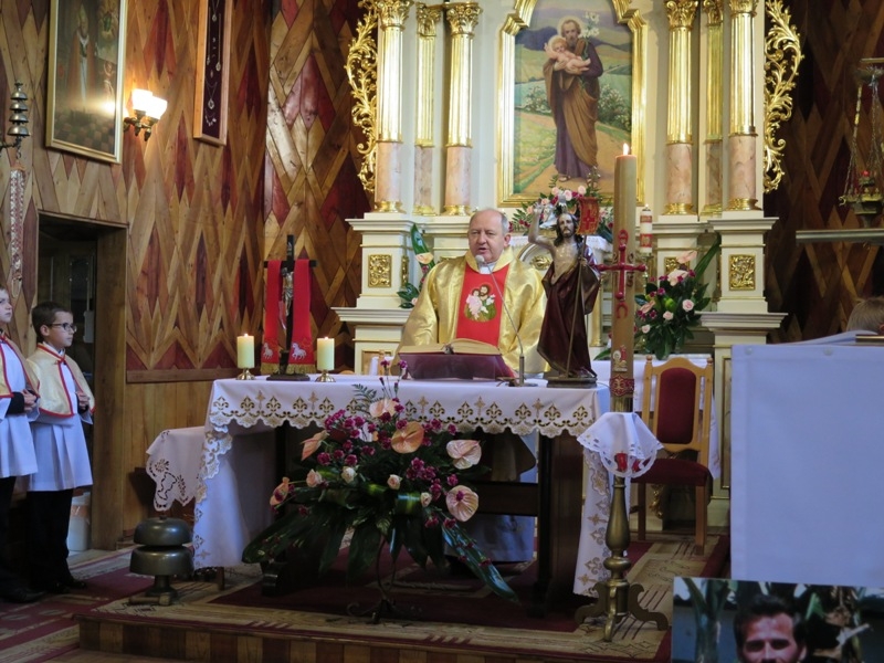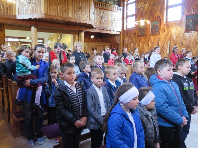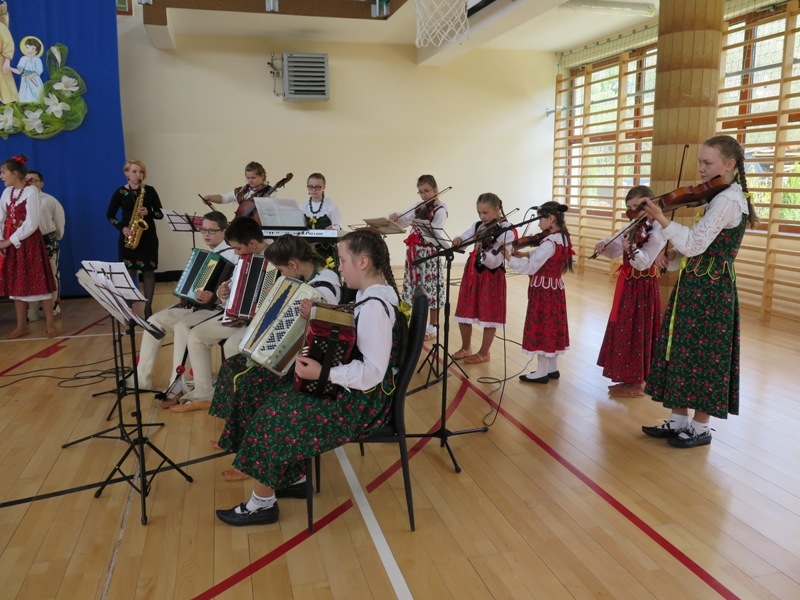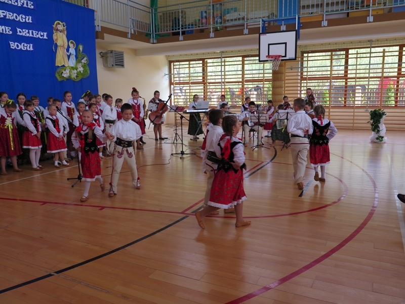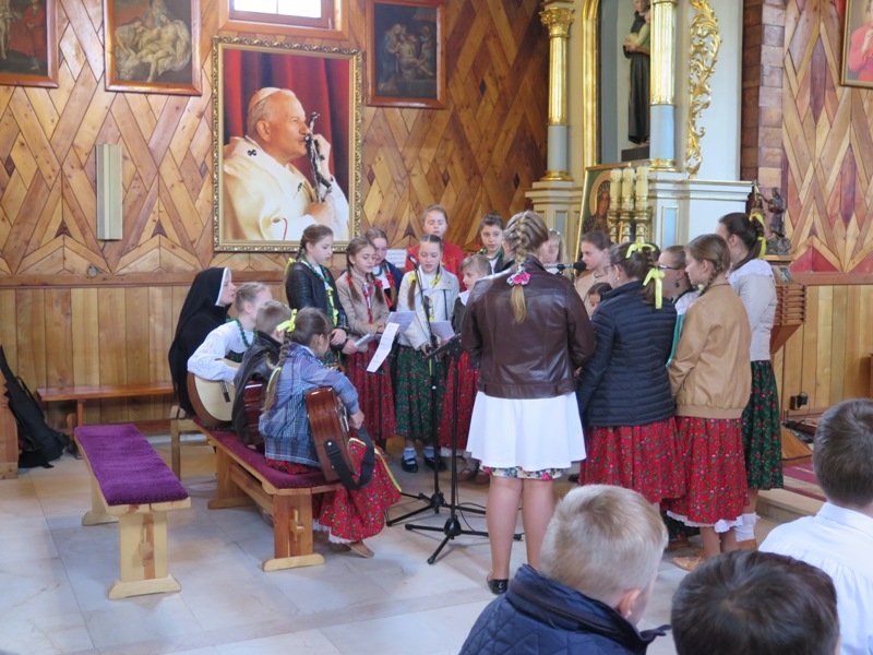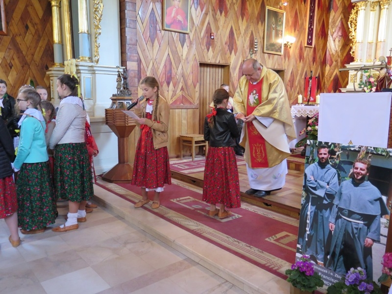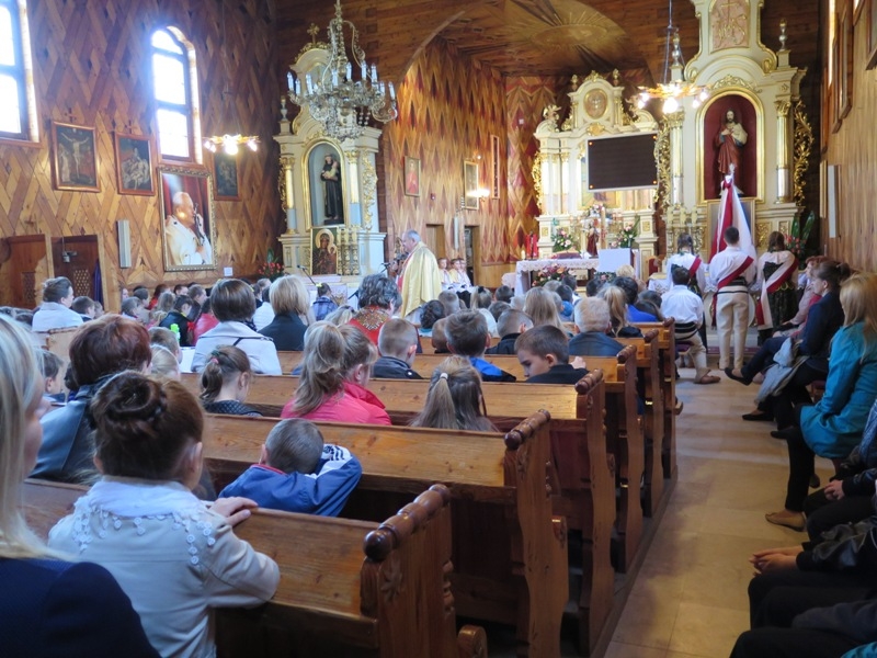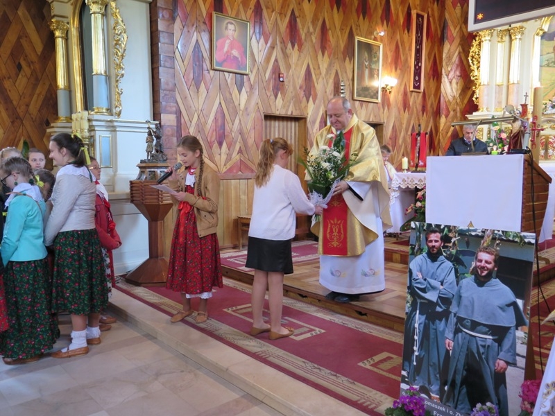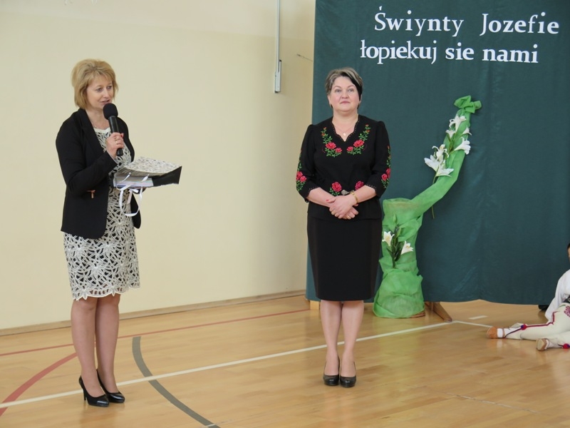 30.04.2015 r. świętowanie rozpoczęto uroczystą mszą świętą w intencji: p. dyrektor, nauczycieli, uczniów, rodziców oraz pracowników szkoły. W oprawę muzyczną i liturgiczną, którą przygotowała s. Anna Laska włączyli się nie tylko uczniowie należący do scholii, ale również nauczycielki: Józefa Nachman i Natalia Kuziel.