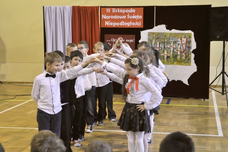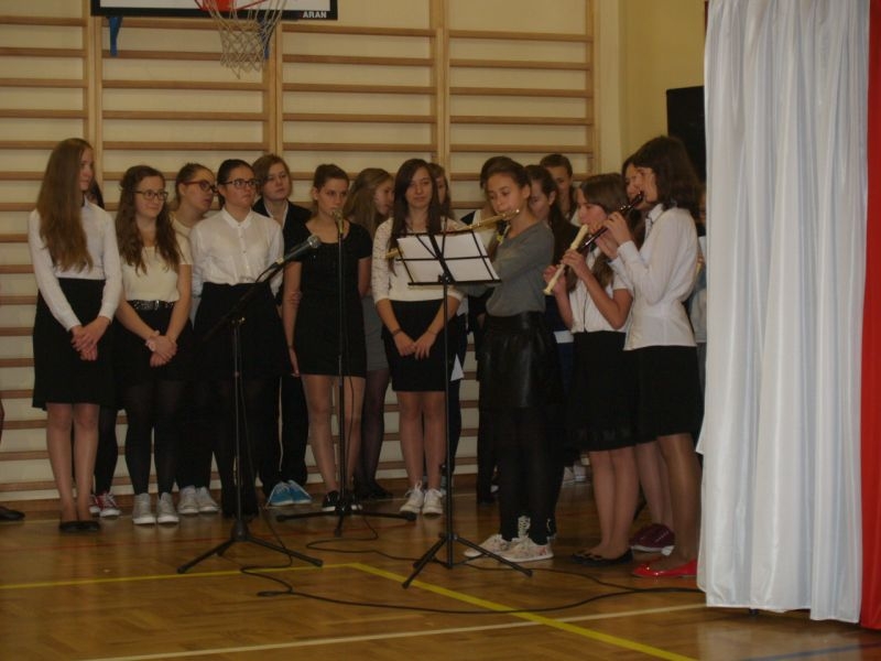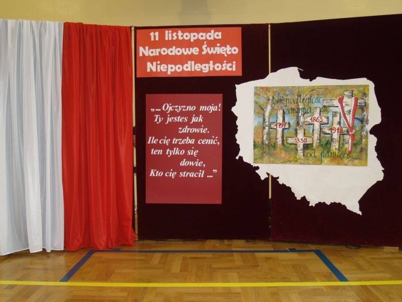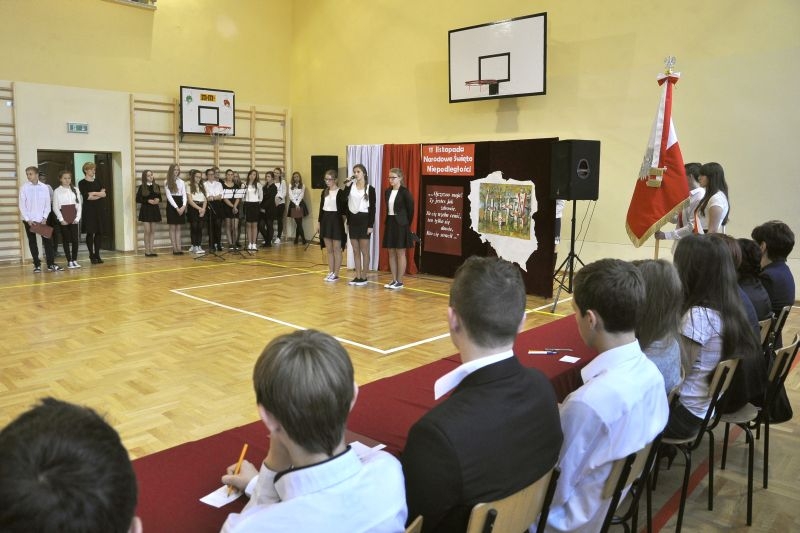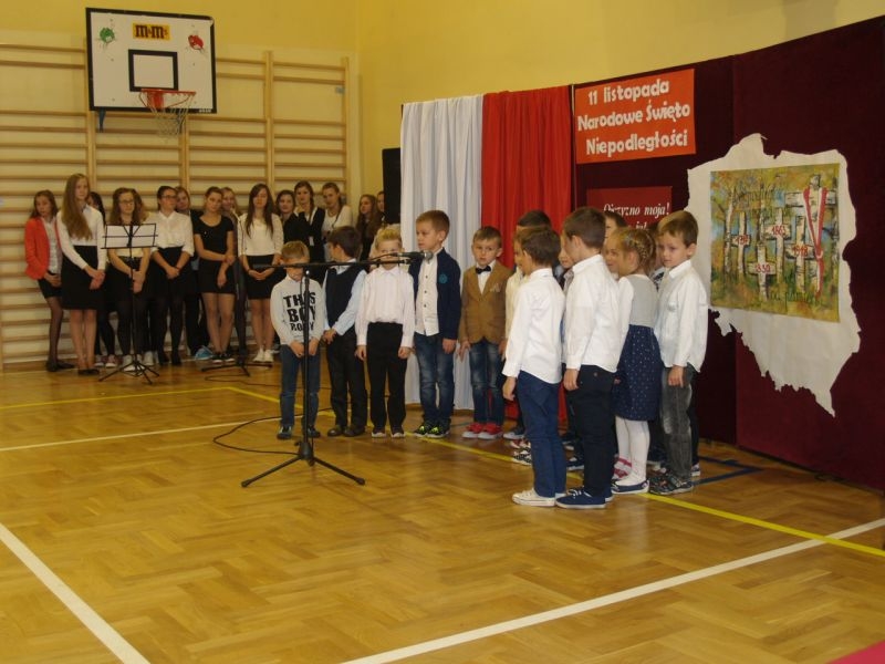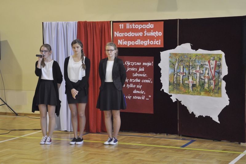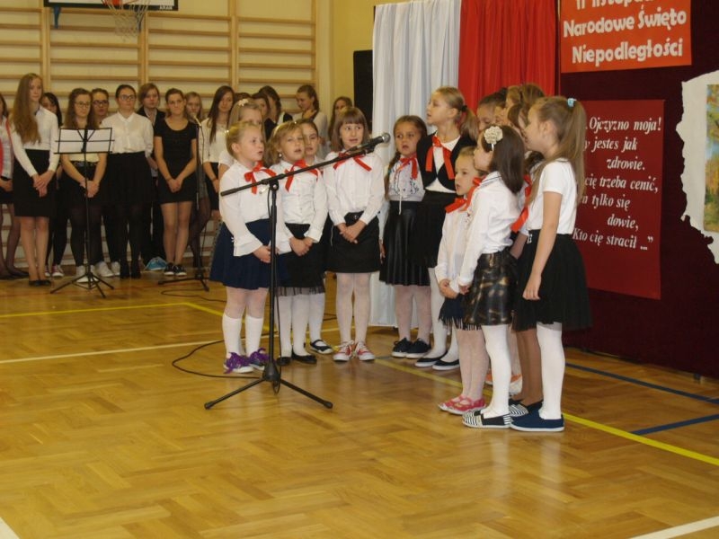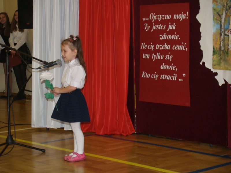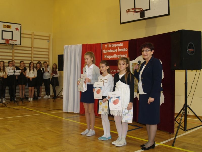 Właśnie 11 listopada 1918 roku Polska po 123 latach niewoli stała się samodzielnym państwem i wróciła na mapy Europy. Przez szacunek dla przeszłości dzień ten czcimy jako Narodowe Święto Odzyskania Niepodległości. Uczniowie podkreślali jak ważna jest pamięć o wszystkich patriotach, którzy przez wieki walczyli i ginęli w obronie wolności Polski, trudzili się o rozwój naszego kraju i strzegli bezpieczeństwa rodaków. Wspomnieli także o Polakach, dzięki którym przetrwała nasza kultura, tradycje, tożsamość narodowa. By uczcić ich pamięć zorganizowano konkurs, w którym przedstawiciele poszczególnych klas recytowali fragmenty naszej epopei narodowej – „Pana Tadeusza”. Podkreślono, że Adam Mickiewicz napisał ten utwór przebywając na przymusowej emigracji we Francji. W utworze tym możemy odnaleźć fragmenty świadczące o wielkiej tęsknocie za Ojczyzną, poznać zwyczaje i kulturę Polaków żyjących w XIX wieku, nauczyć się patriotyzmu i zachwycić cudownymi opisami polskiej przyrody. Wprowadzeniem w klimat ówczesnych czasów był polonez wykonany przez uczniów klasy I szkoły podstawowej. W trakcie narad jury wysłuchaliśmy także pięknych pieśni patriotycznych przygotowanych przez szkolny chórek pod kierunkiem pani Elżbiety Strug oraz panów Łukasza Szlachetki i Marcina Szołdrowskiego.