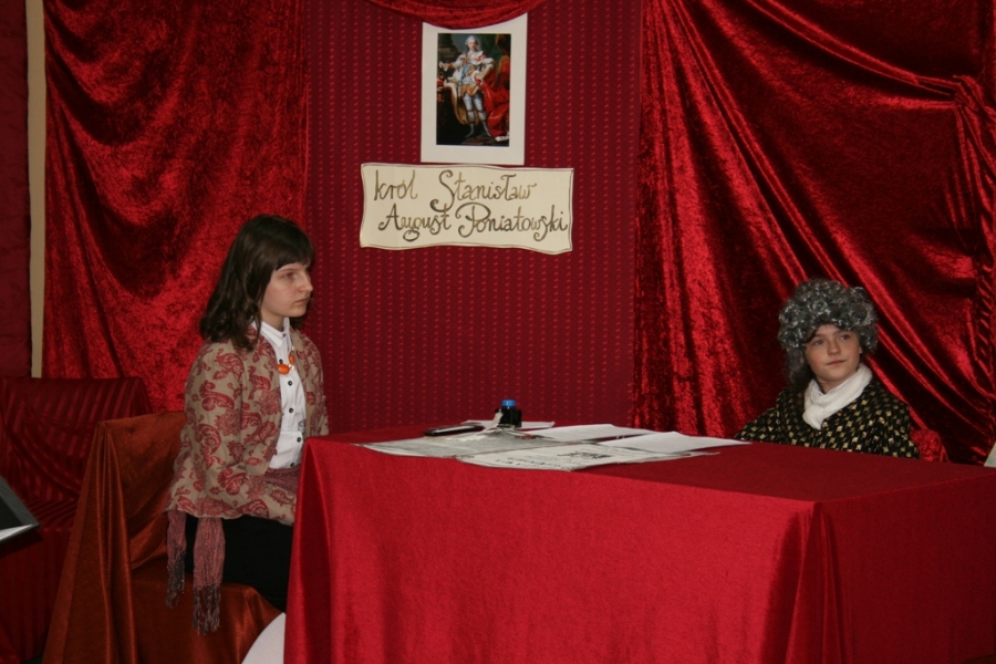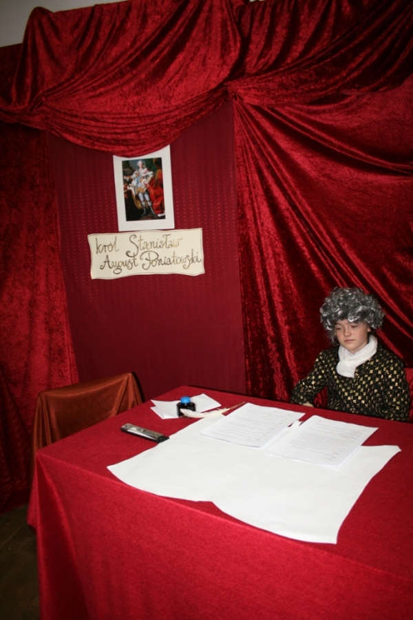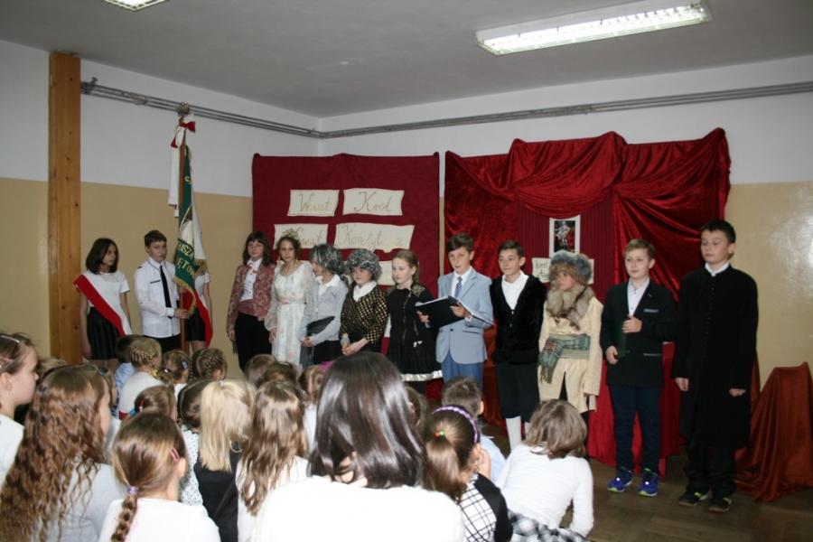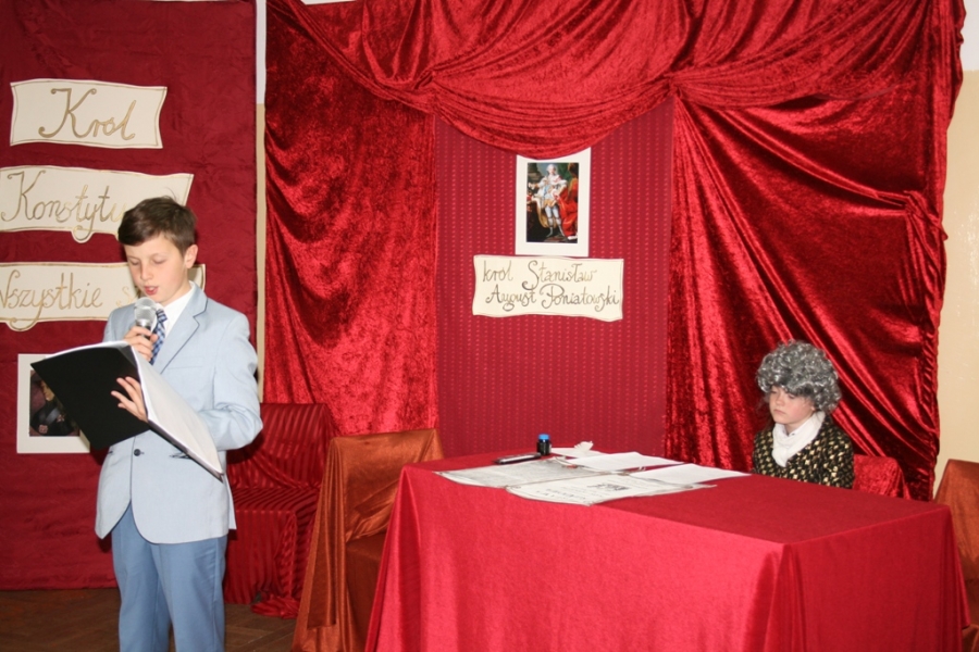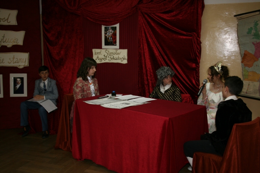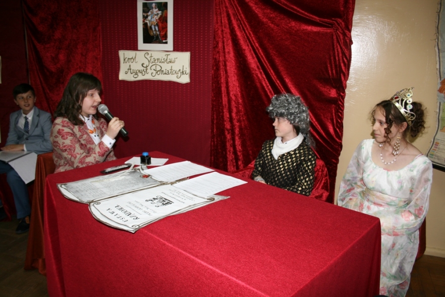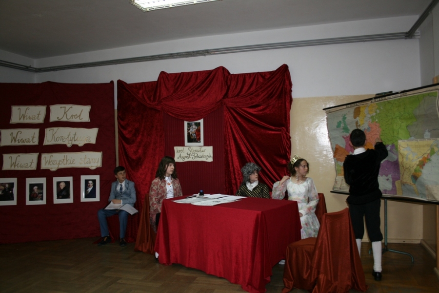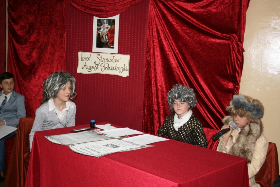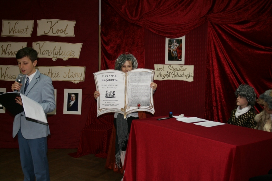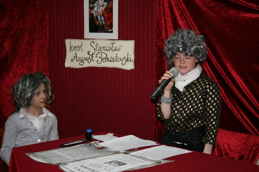Kolejny raz uczniowie klasy V udowodnili, że potrafią w sposób ciekawy przedstawić losy Polski, wcielając się w różne postacie. Na scenie pojawił się: król Polski - Stanisław August Poniatowski,  nasi zaborcy: król Prus -  Fryderyk, cesarz Austrii -  Franciszek Józef oraz władczyni Rosji -  caryca Katarzyna. Mogliśmy zobaczyć również twórców konstytucji: Stanisława Małachowskiego, Hugo Kołłątaja i Ignacego Potockiego.