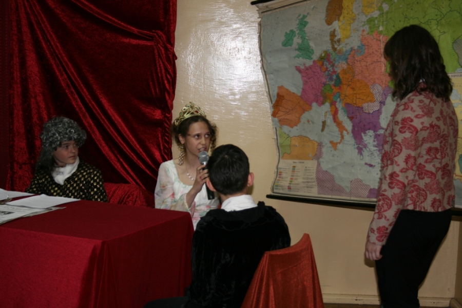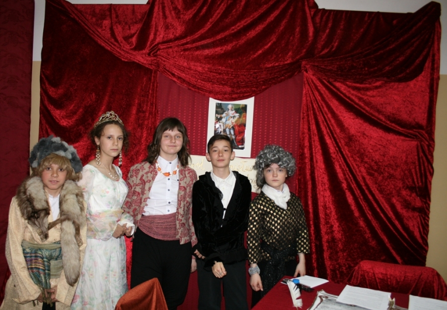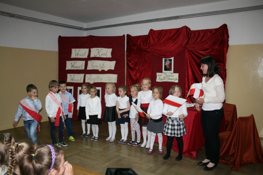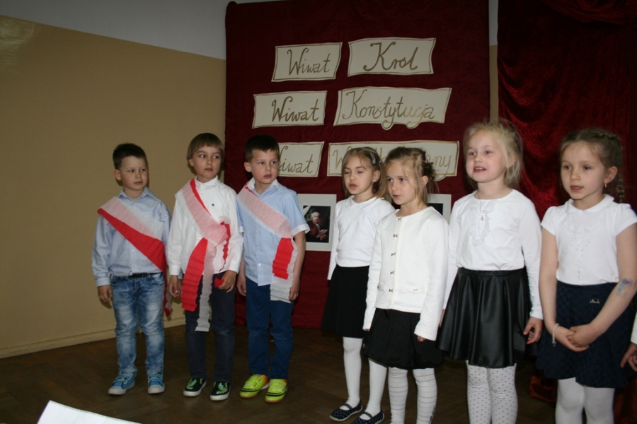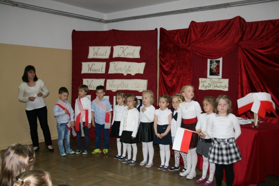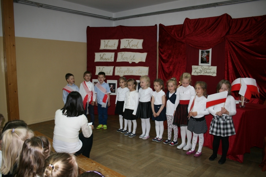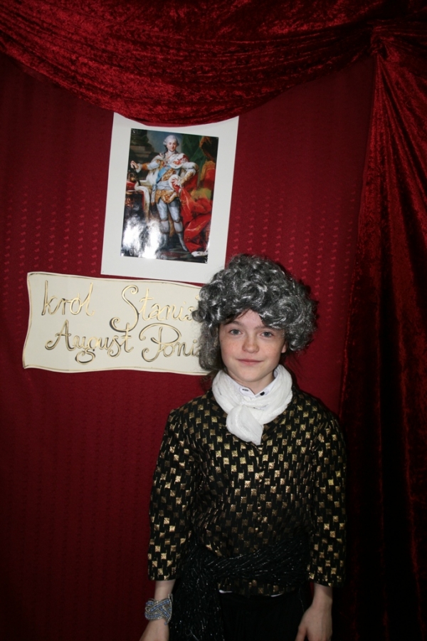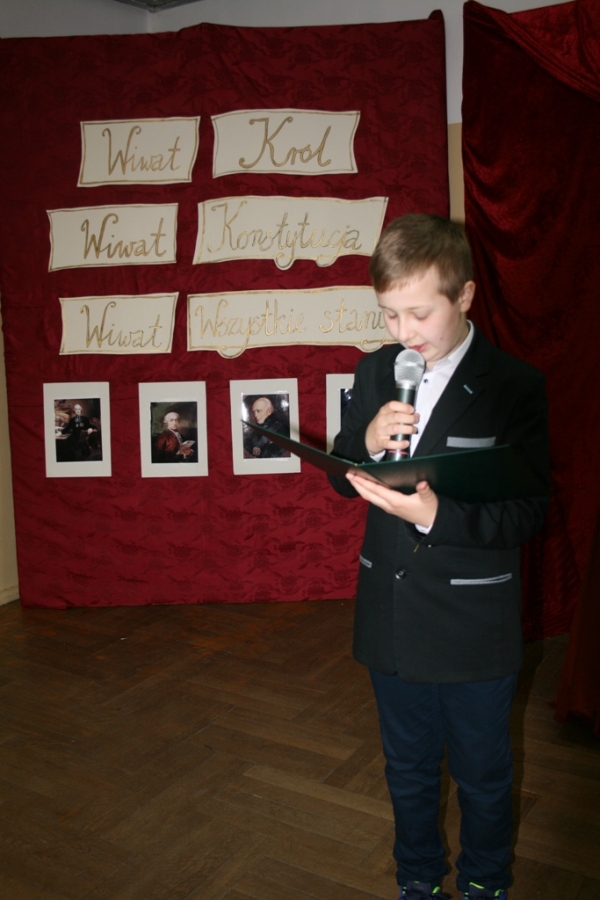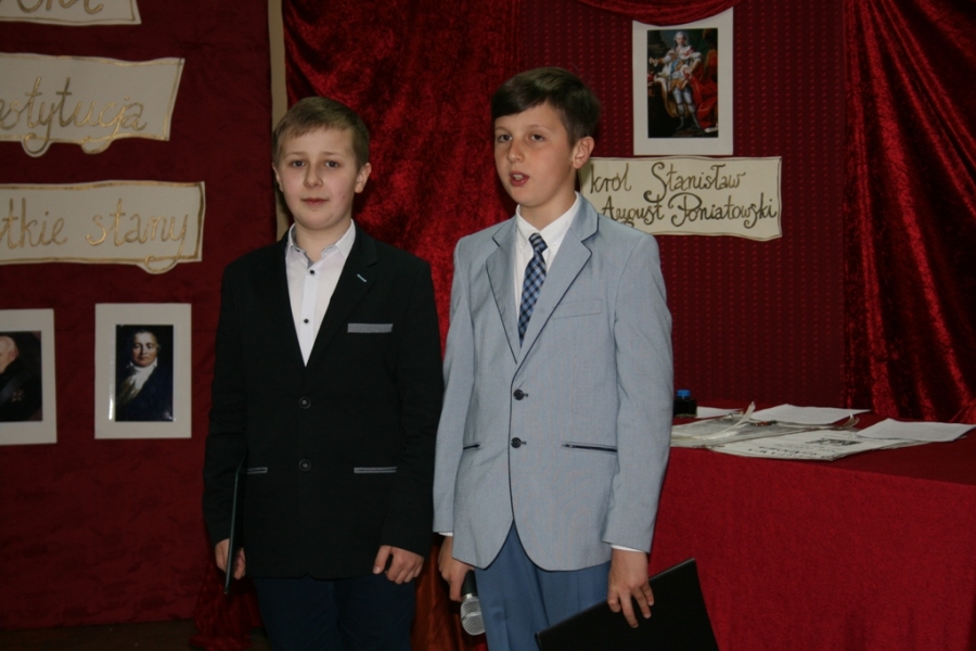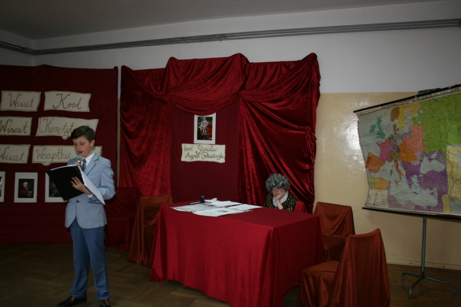 Kolejny raz uczniowie klasy V udowodnili, że potrafią w sposób ciekawy przedstawić losy Polski, wcielając się w różne postacie. Na scenie pojawił się: król Polski - Stanisław August Poniatowski,  nasi zaborcy: król Prus -  Fryderyk, cesarz Austrii -  Franciszek Józef oraz władczyni Rosji -  caryca Katarzyna. Mogliśmy zobaczyć również twórców konstytucji: Stanisława Małachowskiego, Hugo Kołłątaja i Ignacego Potockiego.