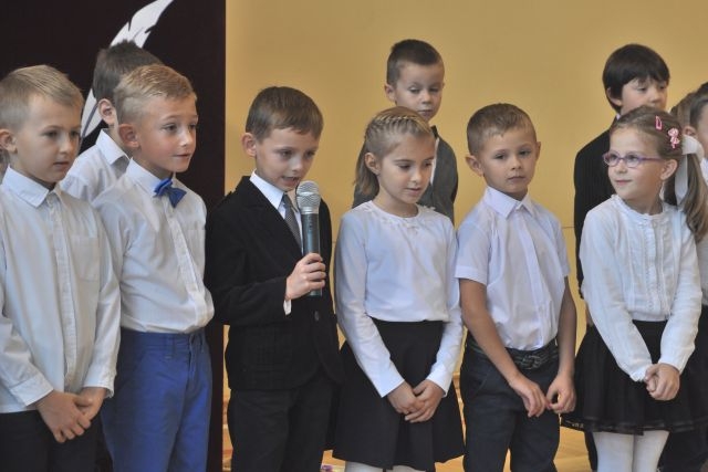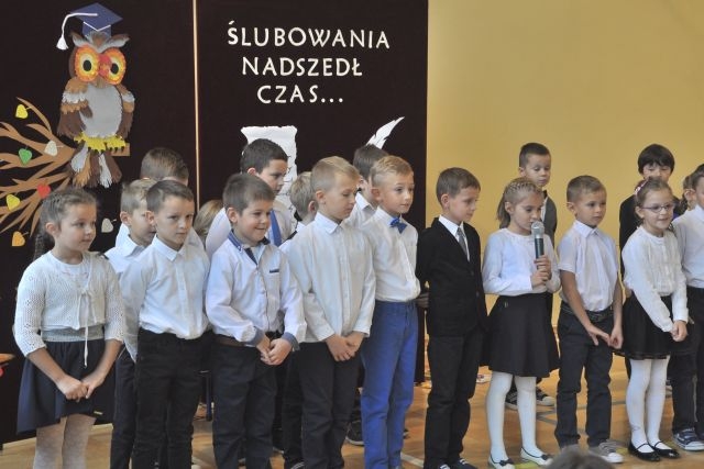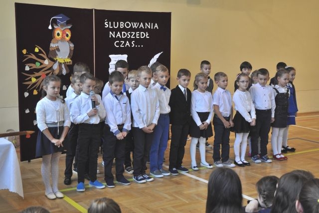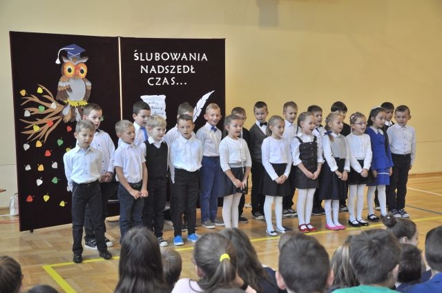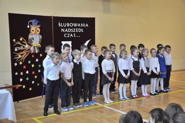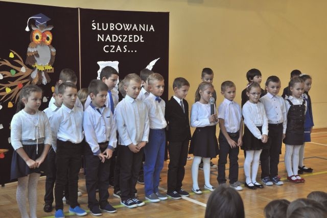 W dniu tak ważnym dla pierwszaków nie mogło zabraknąć ich najbliższych: rodziców, Pani Dyrektor Anny Piwowarskiej, Pani Wicedyrektor Krystyny Rutkowskiej- Topinek, wychowawczyni Pani Elżbiety Strug oraz wszystkich pozostałych nauczycieli i starszych kolegów, którzy dodawali otuchy. Część artystyczną stanowiły liczne piosenki i wierszyki, którymi pierwszoklasiści zaprezentowali swoje talenty. Następnie przyszedł czas na uroczyste ślubowanie oraz pasowania na ucznia przez Panią Dyrektor.