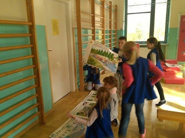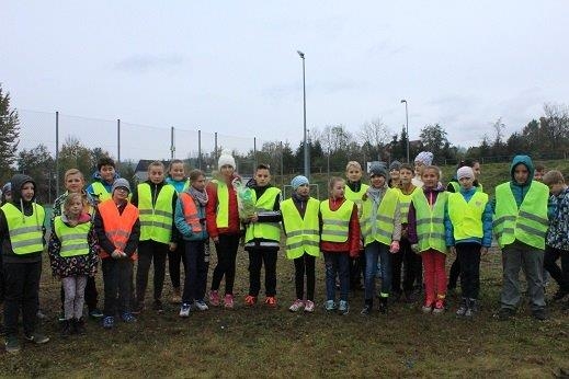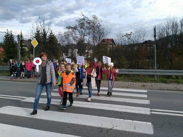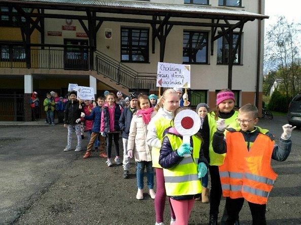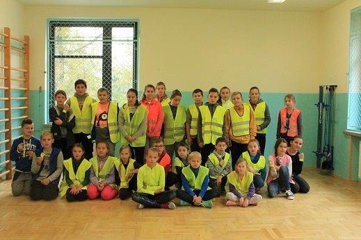 - zorganizowano happening, podczas którego uczniowie z własnoręcznie wykonanymi transparentami przeszli od szkoły do drogi wojewódzkiej, promując konieczność noszenie odblasków. Dzieci ubrane były w kamizelki