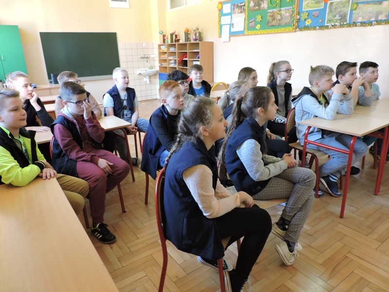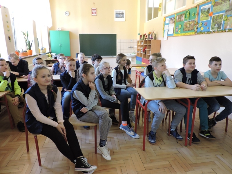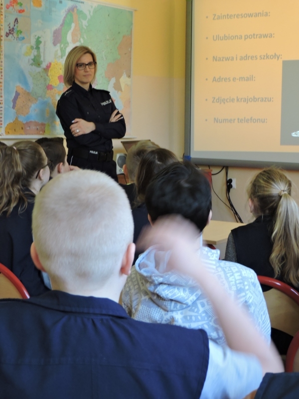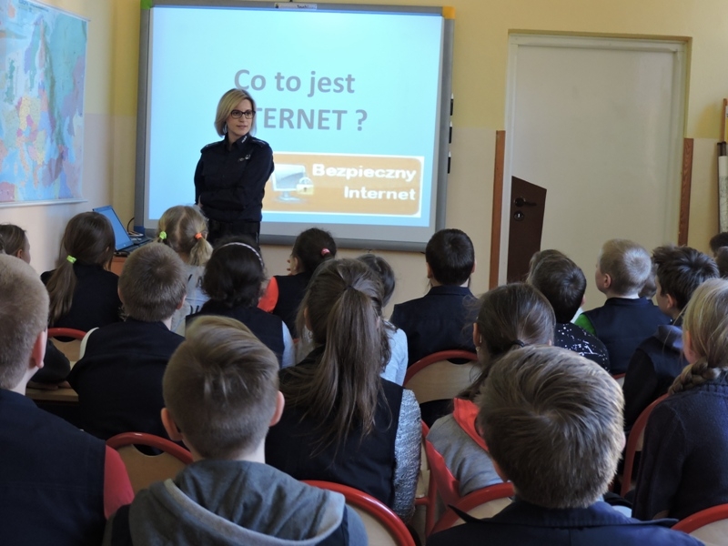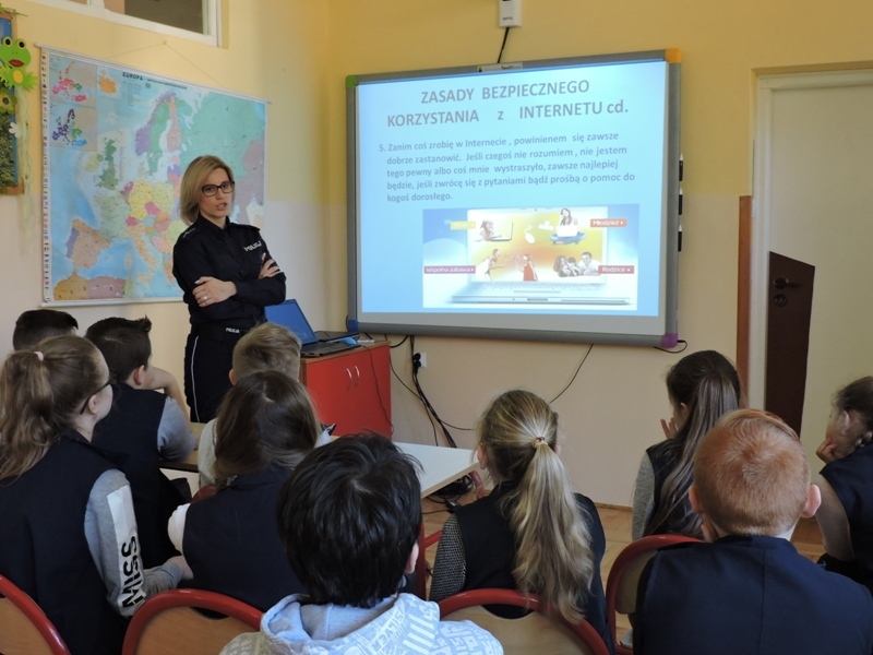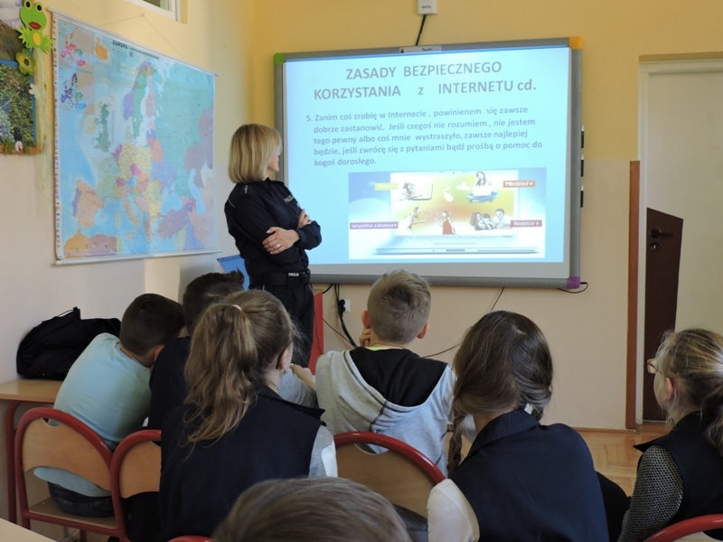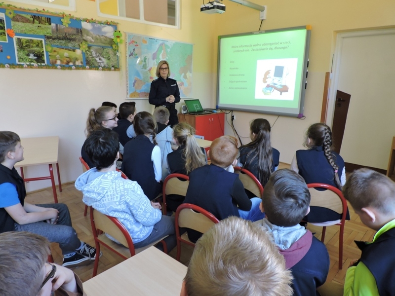 Celem zajęć było przybliżenie  i omówienie form cyberprzemocy.  Uczniowie obejrzeli filmy „Owce w sieci”, które ułatwiły im zrozumienie czym jest cyberprzemoc, jakie niesie ze sobą zagrożenie, a przede wszystkim jak jej unikać i jak się przed nią bronić.  Ważne było uświadomienie tym młodym ludziom, że w chwili zagrożenie nie pozostają sami. Pomocą zawsze służą im rodzice, nauczyciele, wychowawcy. Drugim zagadnieniem, które było poruszane podczas tego spotkania były gry, które są aktualnie „na topie” wśród dzieci i młodzieży. Uczniowie bardzo chętnie wzięli udział w dyskusji, dzielili się swoimi doświadczeniami. Wykazali się dużą wiedzą jak również, co ważniejsze, roztropnością w wyborze gier, w które grają.  Małgorzata Wojtas podziękowała za aktywność i wyraziła nadzieję, że uczniowie będą umieli zdobytą wiedzę wykorzystać w praktyce, a podczas korzystania z Internetu, będą przestrzegać zasad bezpieczeństwa.