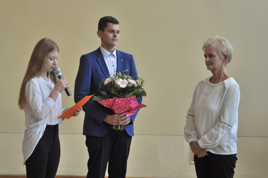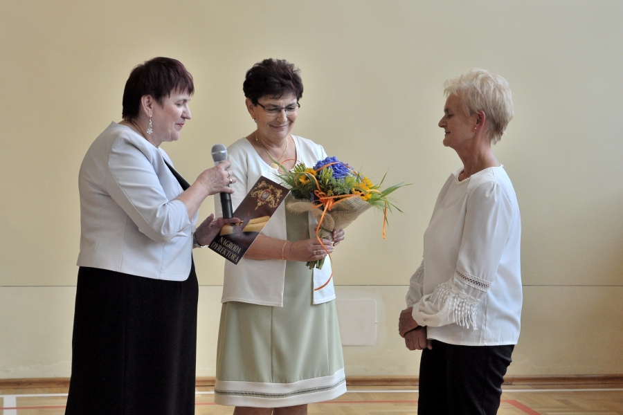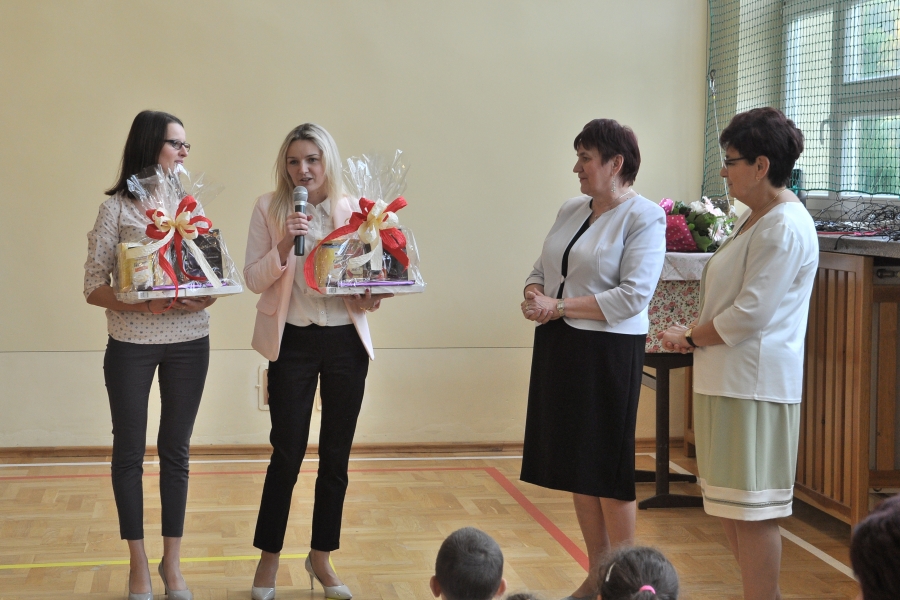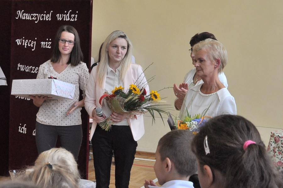 W części oficjalnej Dyrektor Anna Piwowarska skierowała do grona pedagogicznego oraz pracowników administracji i obsługi wiele ciepłych słów, życząc wytrwałości i zadowolenia z wykonywania codziennych obowiązków oraz dużo sił do podejmowania wyzwań, jakie czekają w pracy z dziećmi i młodzieżą. W tym wyjątkowym dniu szczególne podziękowania w związku z przejściem na emeryturę popłynęły do Heleny Bierowiec, kucharki, która przez wiele długich lat dbała o podniebienia uczniów i pracowników szkoły.