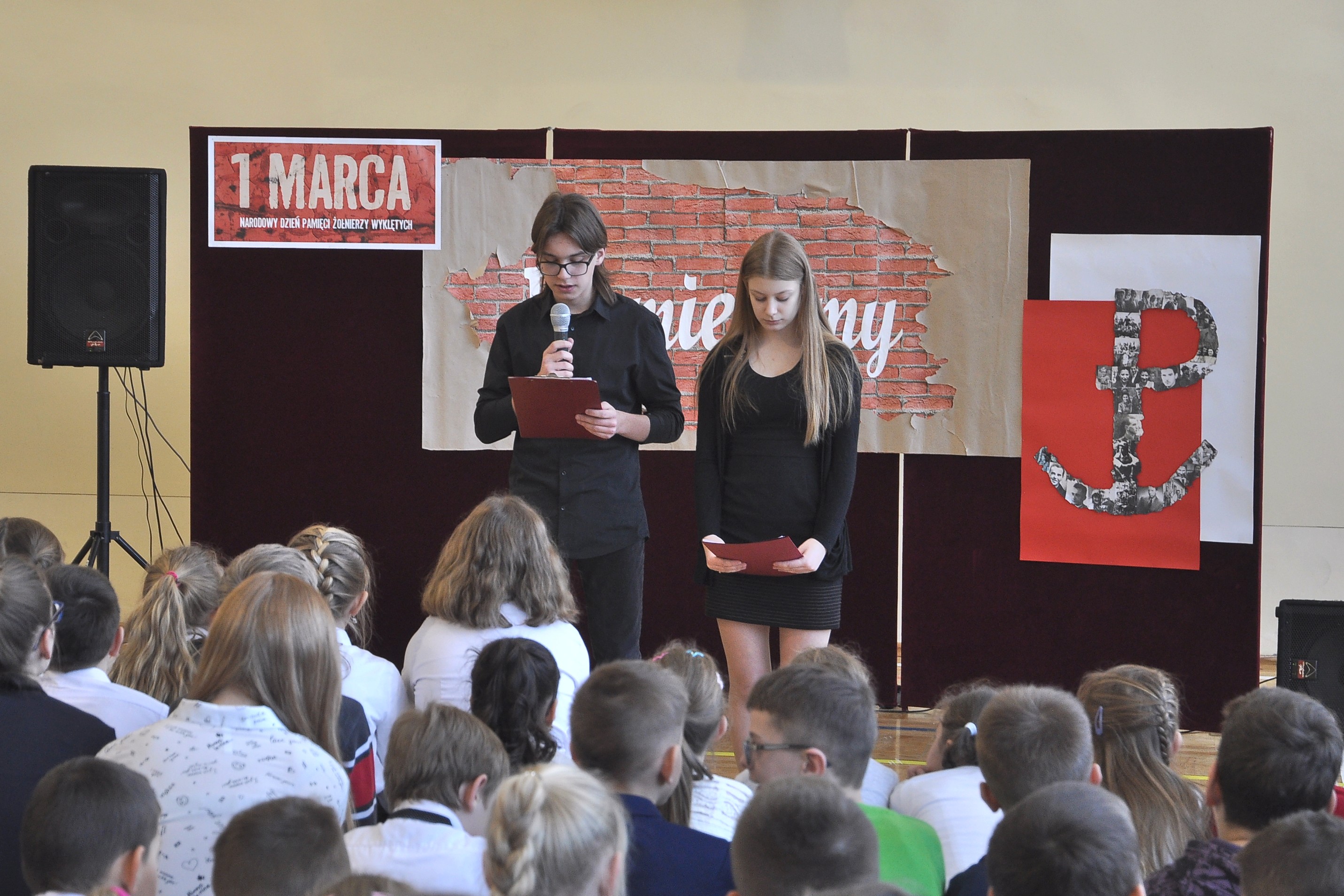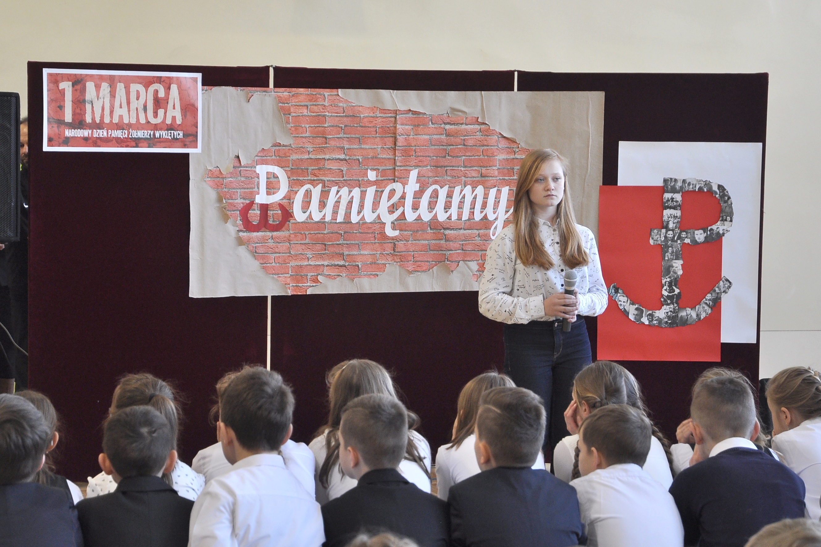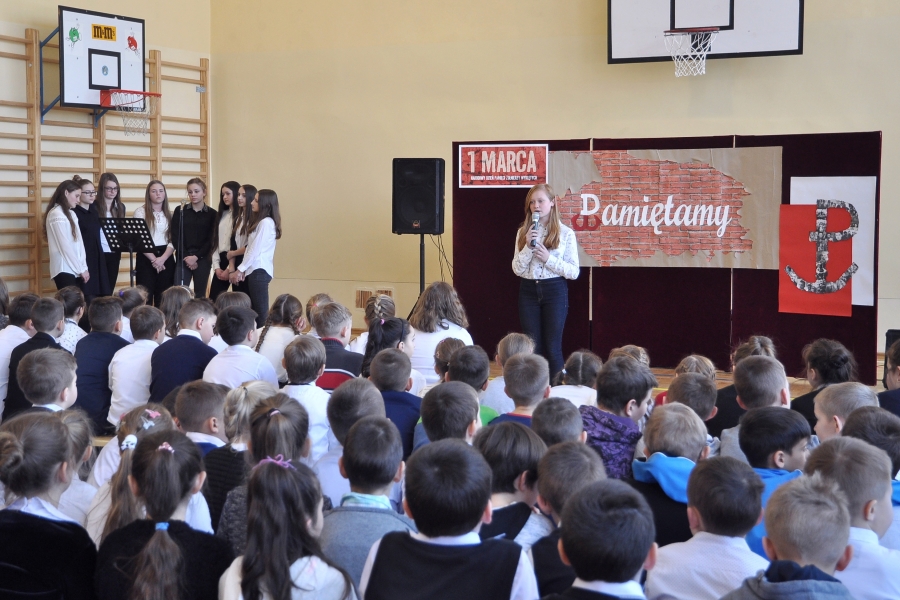 Uczniowie pod kierunkiem Joanny Kubowicz przypomnieli w programie artystycznym tragiczną historię żołnierzy, o których pamięć przez lata nie była przywoływana, a którzy z poświęceniem życia stawili opór próbie sowietyzacji Polski. Wysłuchaliśmy utworu „Idę dziś walczyć, mamo” w wykonaniu uczniów kl. IV oraz szczególnie wzruszającego występu gimnazjalistki Anny Filipiak, która zaprezentowała piosenkę „Jedna chwila” o heroizmie i poświęceniu Danuty Siedzikówny (Inki) - młodej dziewczyny, która za marzenia o niepodległej Polsce zapłaciła najwyższą cenę – informują uczestnicy uroczystości. Przejmująca recytacja Aleksandry Cieżak (kl. III gim.) wiersza Krzysztofa Kamila Baczyńskiego „Niebo złote ci otworzę” z podkładem muzycznym doskonale oddała dramatyzm tamtych chwil.