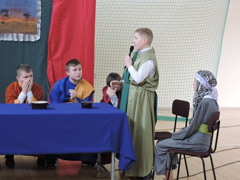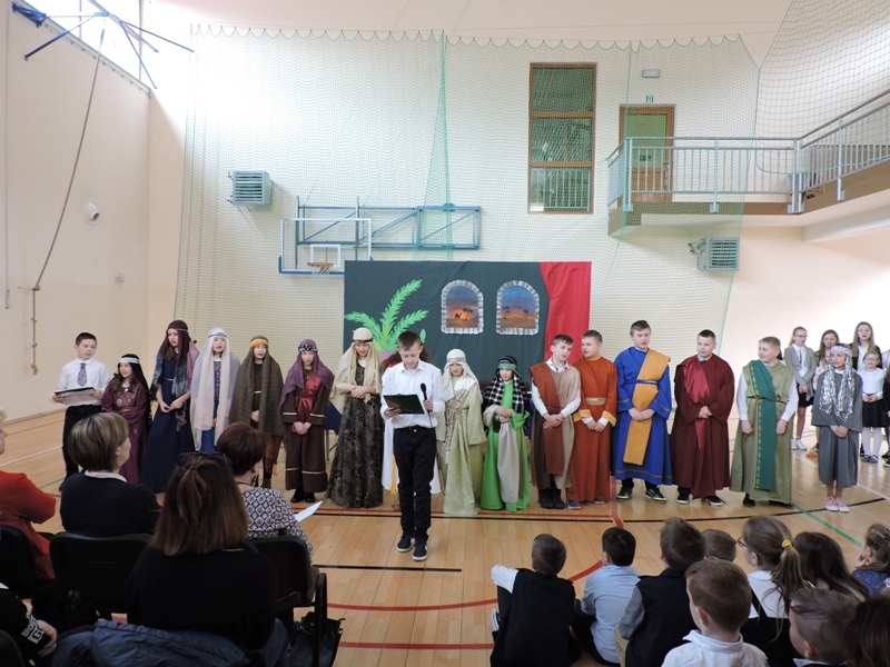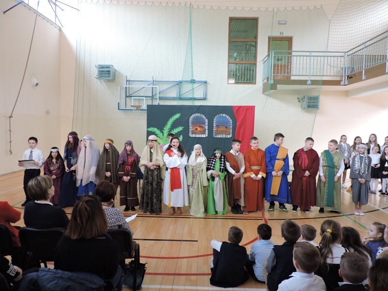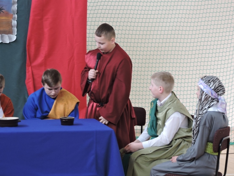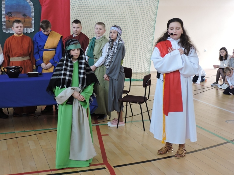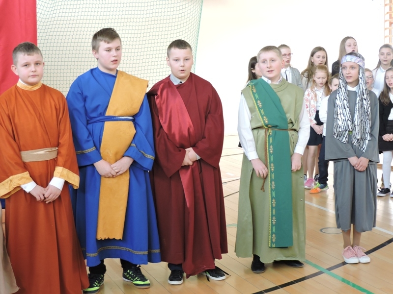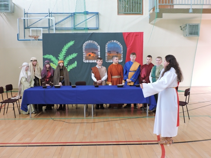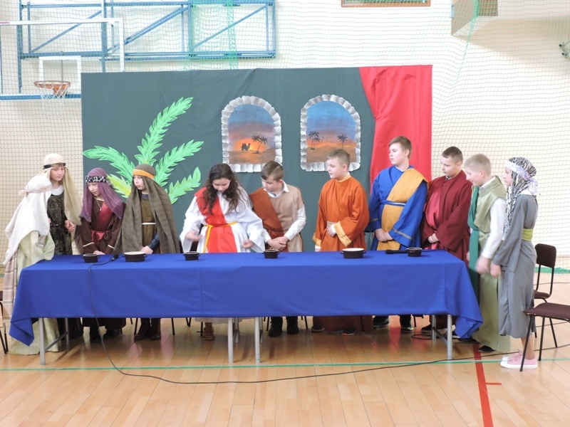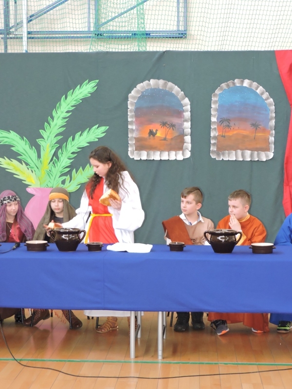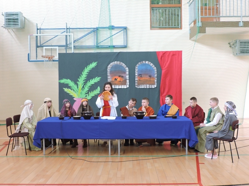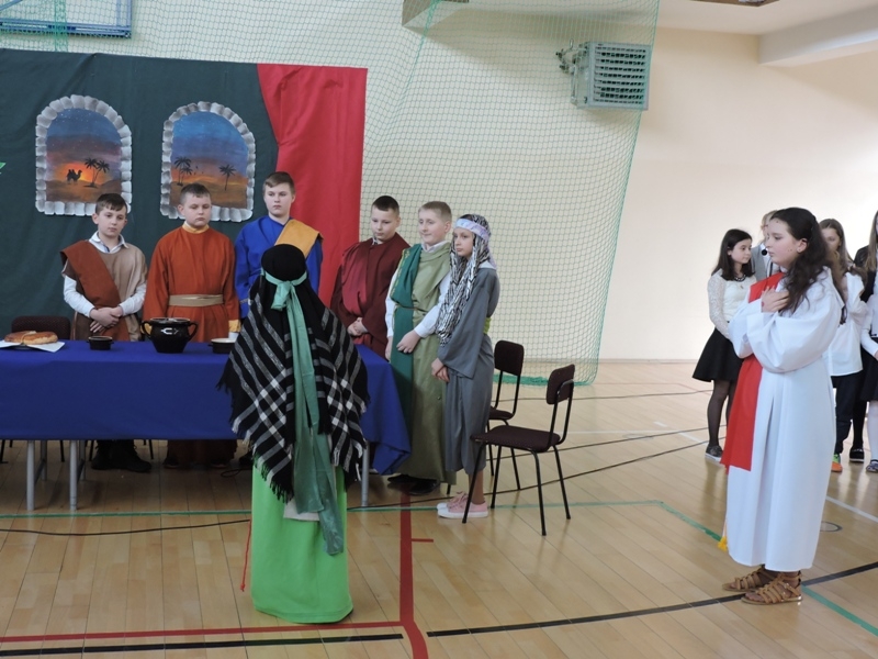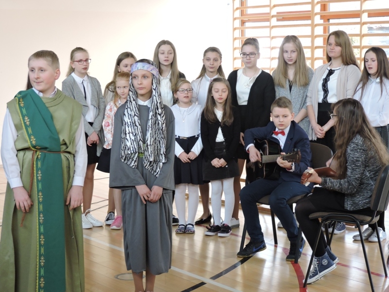 Program artystyczny - scenkę pt: Zmartwychwstanie – przygotowali i przedstawili uczniowie klasy piątej, a dzieci ze scholi parafialnej śpiewały i grały pieśni wielkanocne. Inscenizację obejrzeli: dyrektor, nauczyciele, pracownicy, rodzice i uczniowie lubomierskiej jedynki.