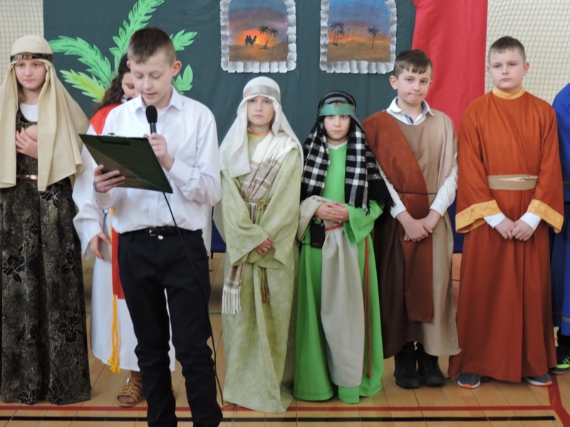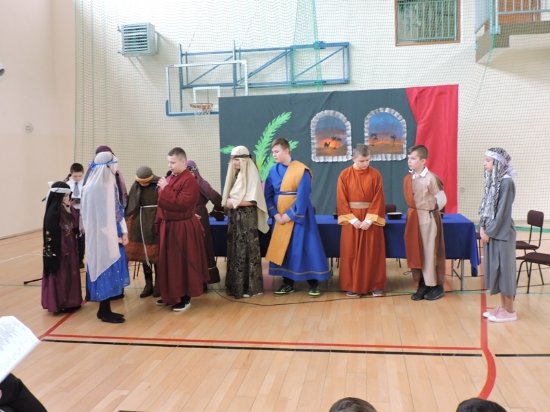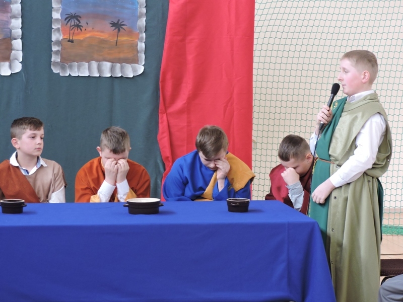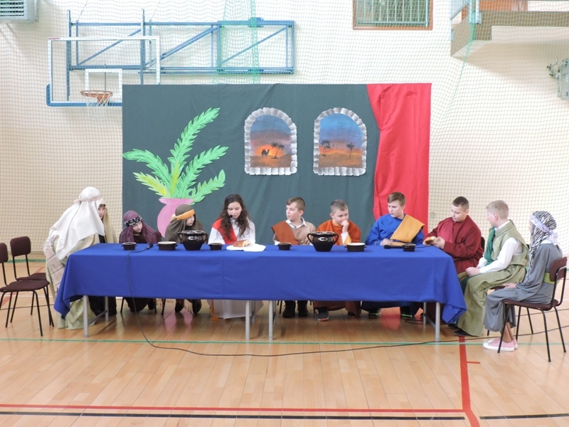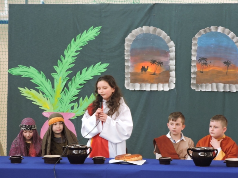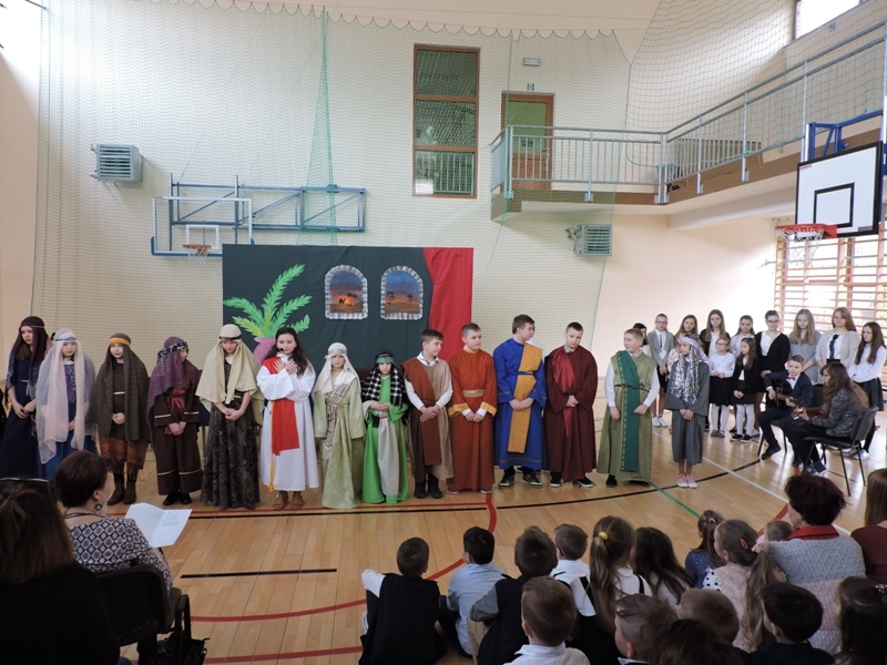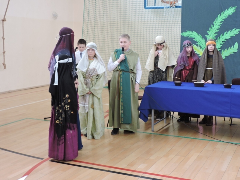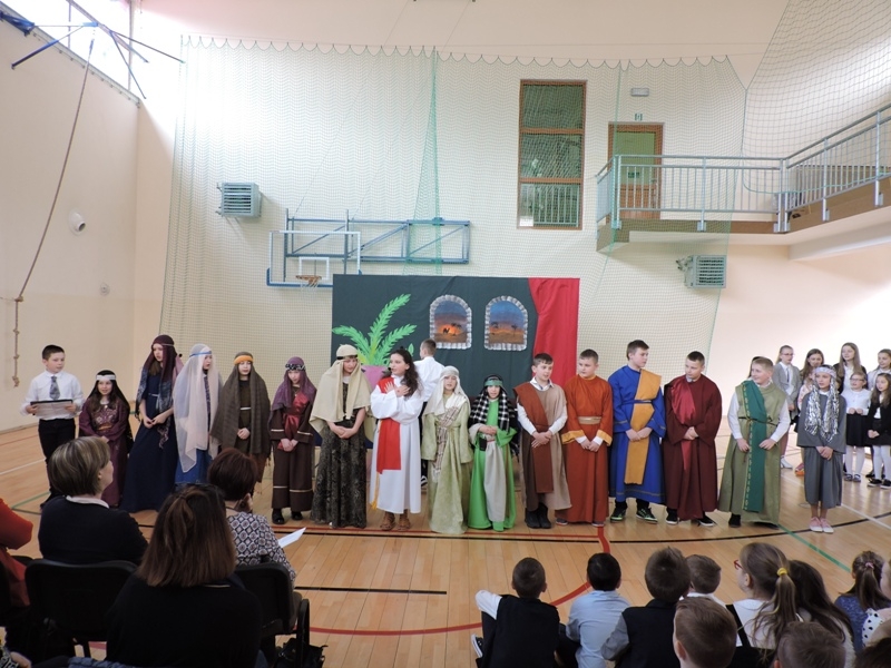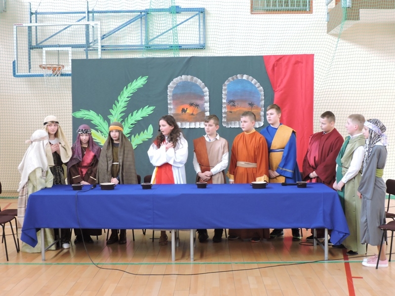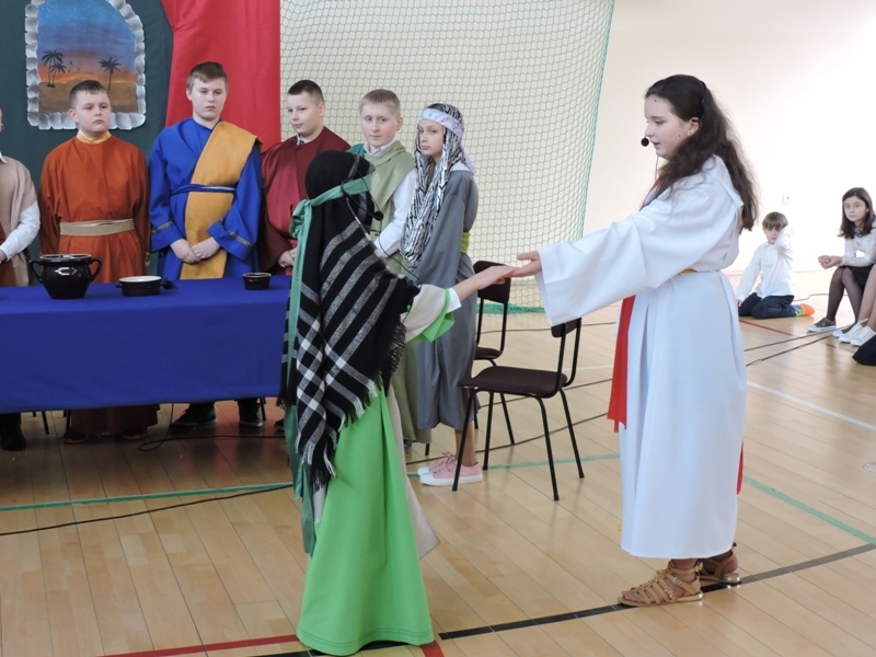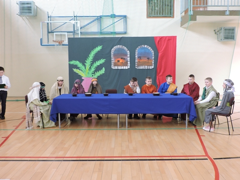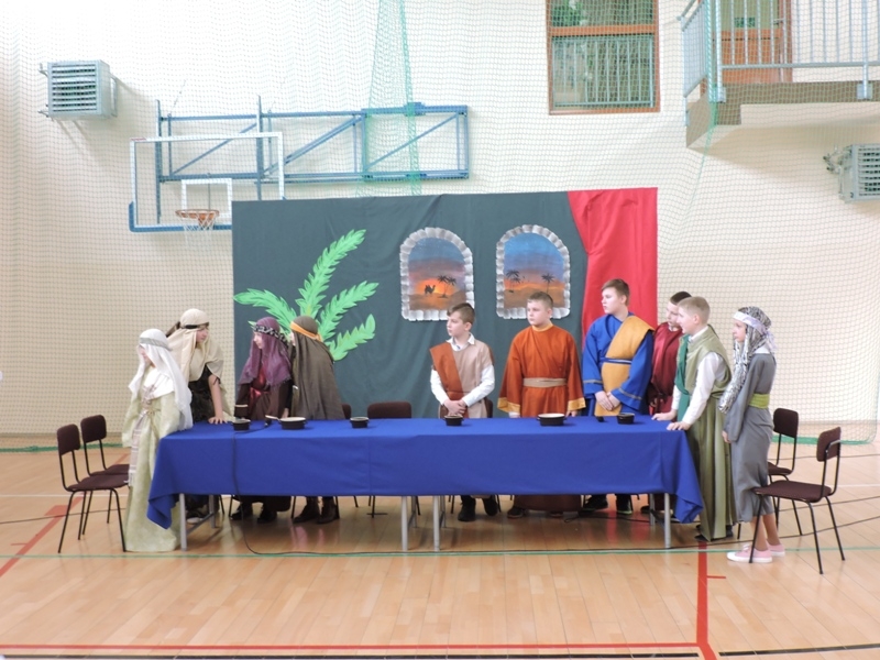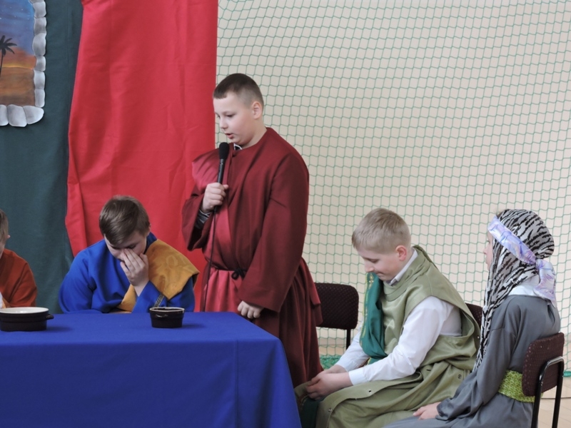Program artystyczny - scenkę pt: Zmartwychwstanie – przygotowali i przedstawili uczniowie klasy piątej, a dzieci ze scholi parafialnej śpiewały i grały pieśni wielkanocne. Inscenizację obejrzeli: dyrektor, nauczyciele, pracownicy, rodzice i uczniowie lubomierskiej jedynki.