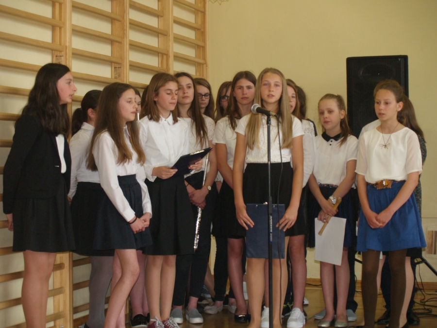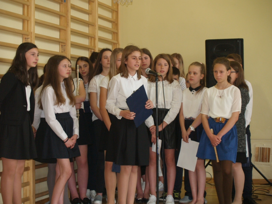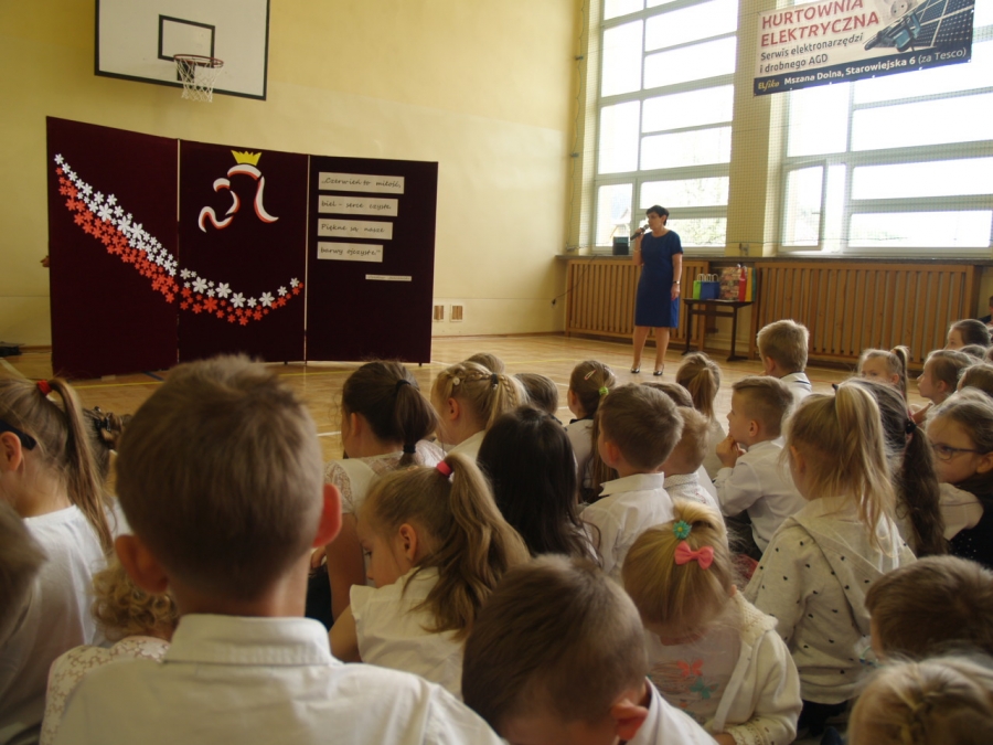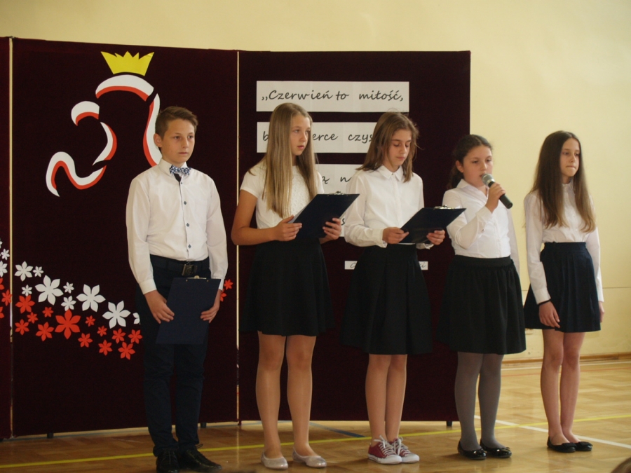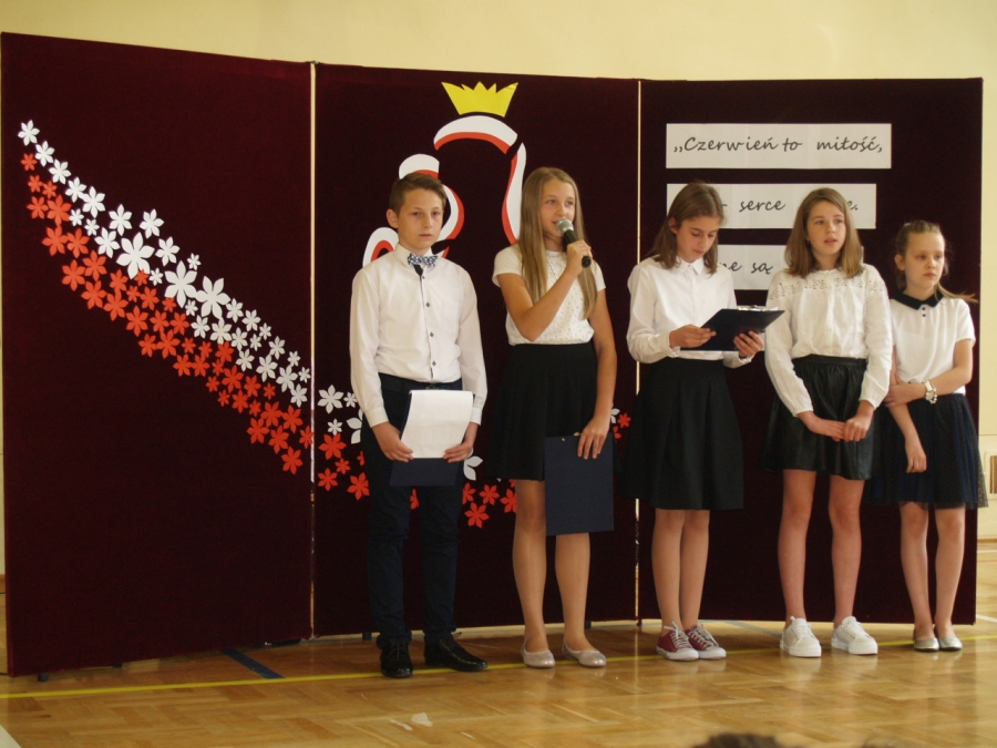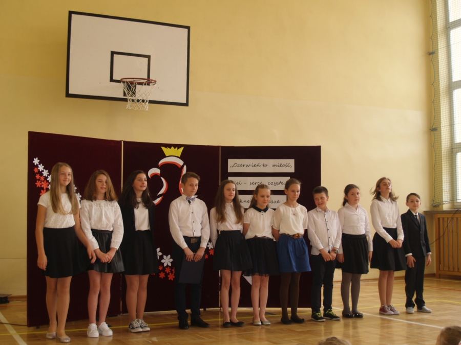 Uczniowie pod kierunkiem Ewy Cetnarowskiej, Elżbiety Strug i Łukasza Szlachetki przypomnieli zgromadzonym tło historyczne majowego święta oraz ważne wydarzenia z historii naszego narodu, który przez wieki musiał walczyć o suwerenność. Podniosłej atmosferze towarzyszyły pieśni patriotyczne wykonane przez szkolny chórek przy akompaniamencie instrumentów. Poetycka wędrówka w przeszłość Polski była piękną lekcją historii i próbą połączenia ważnych dla nas, Polaków, wydarzeń z współczesnością, z tym, jakie wartości powinien pielęgnować każdy z nas. Uczniowie przypomnieli, że wspólnie z innymi państwami od setek lat budujemy współczesną kulturę i tradycję Europy, a Konstytucja 3 Maja jest tego dowodem. Narodowe tradycje, wydarzenia, święta powinny być ważne dla każdego Polaka. Uczniowie co rok starają się, aby ten dzień nie został zapomniany także w szkolnej społeczności.