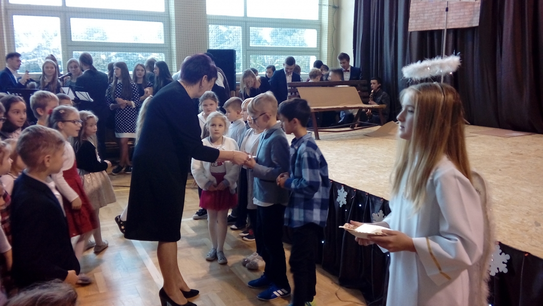 Kiedy już umilkły ostatnie dźwięki muzyki, głos zabrała Dyrektor Anna Piwowarska, która złożyła wszystkim życzenia świąteczne oraz wręczyła nagrody i dyplomy uczniom biorącym udział w konkursach organizowanych w szkole w okresie przedświątecznym – konkursie „Mój kalendarz adwentowy”, konkursie znajomości tradycji i zwyczajów bożonarodzeniowych oraz konkursie na najpiękniejszą dekorację świąteczną sali lekcyjnej.