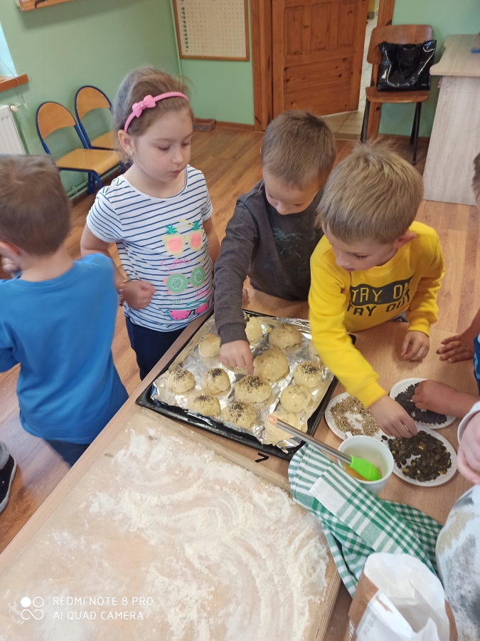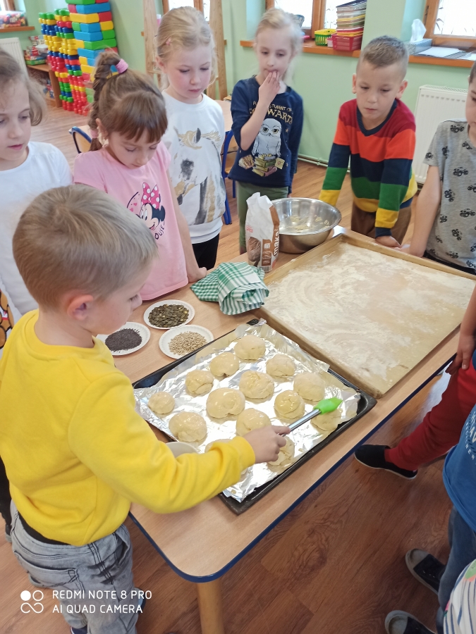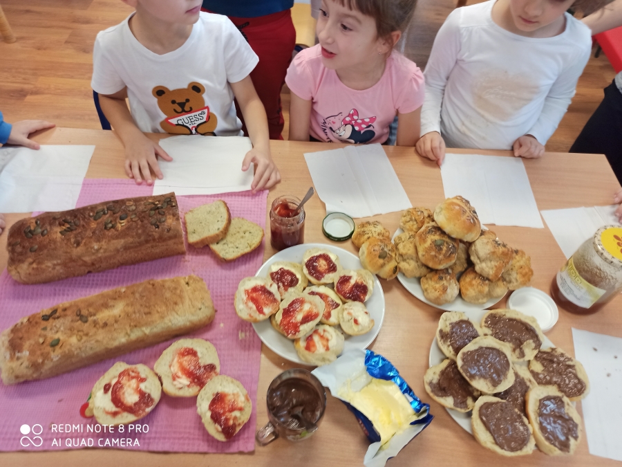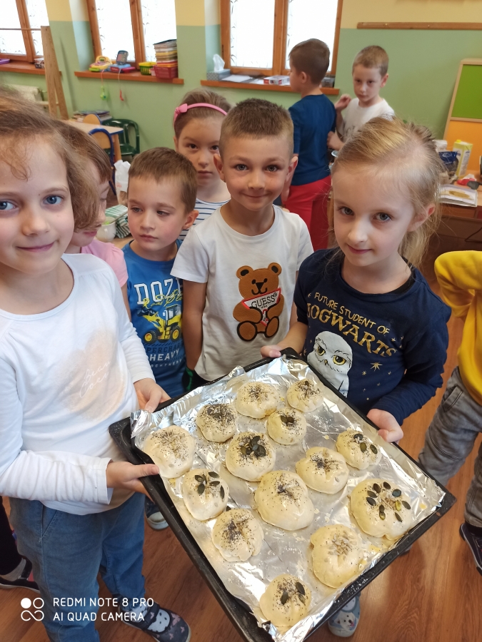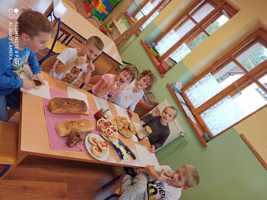 Z okazji „Dnia Chleba” 6 - latki wspólnie z p. Tosią aktywnie uczestniczyły w pieczeniu bułeczek i chleba. Dzieci zapoznały się z przepisem i przygotowały składniki potrzebne do przygotowania pieczywa, wyrabiały ciasto, obserwowały jak rośnie i oczywiście jak pięknie rumieni się w piekarniku. Ostatnim etapem tego procesu był poczęstunek wypiekami przygotowanymi podczas zajęć. A aromatyczne kromeczki smakowała cała obsługa przedszkola. Wychowankowie przedszkola świeże i pachnące pieczywo posmarowali dżemem truskawkowym i nutellą. Był  ogrom radości i wielka satysfakcja dla świętujących ten szczególny dzień w roku.