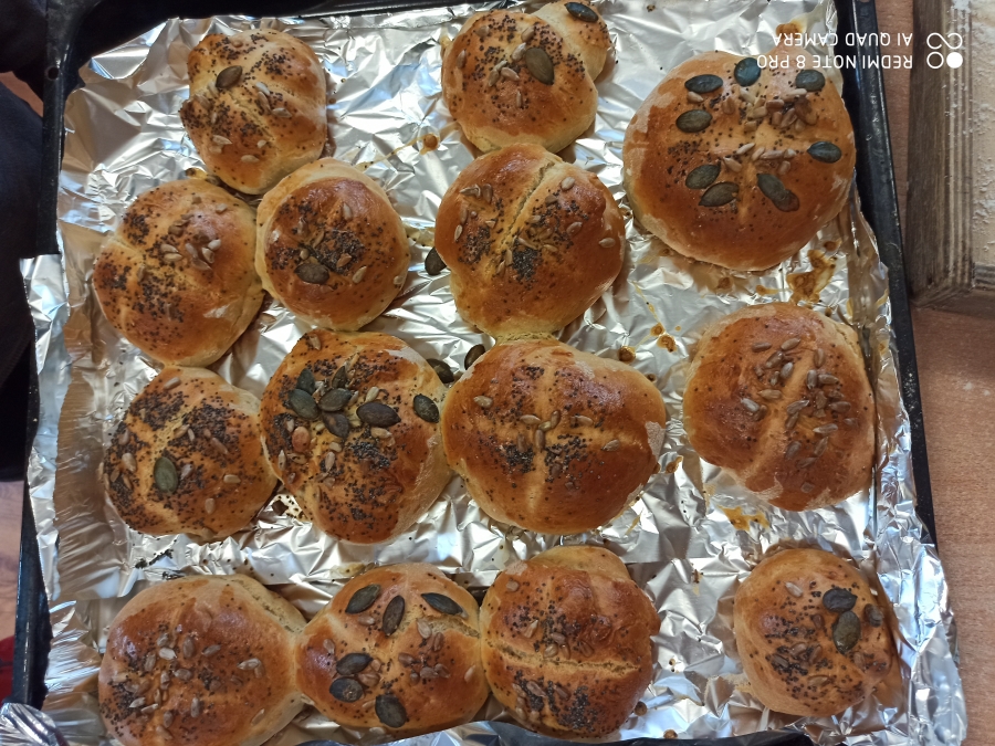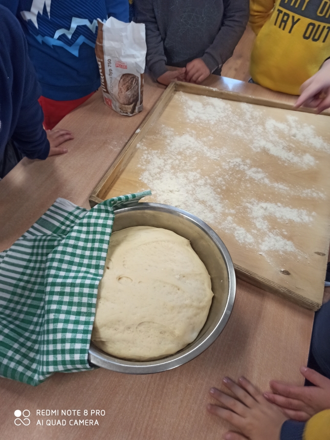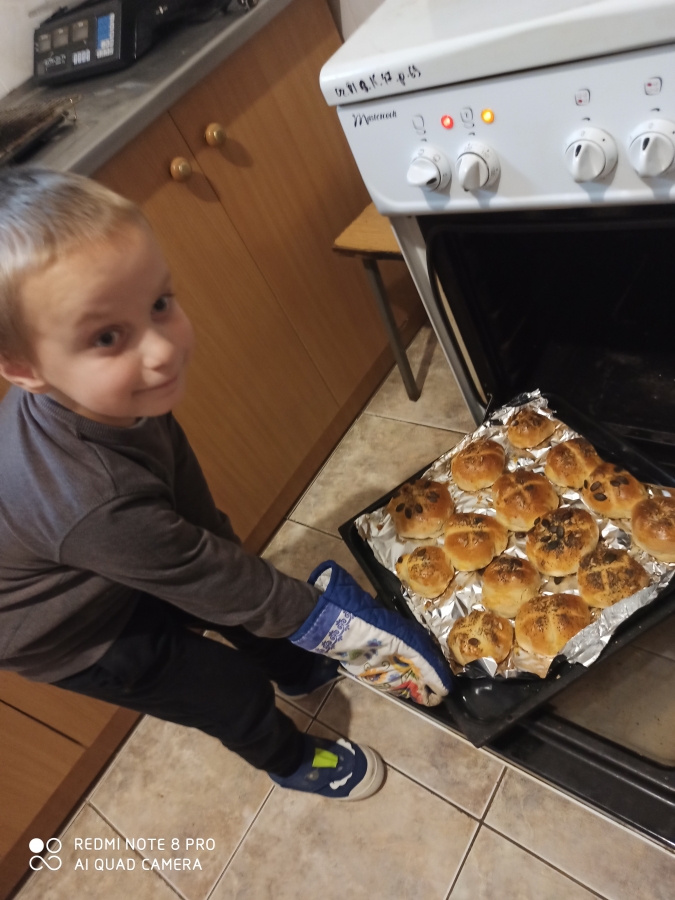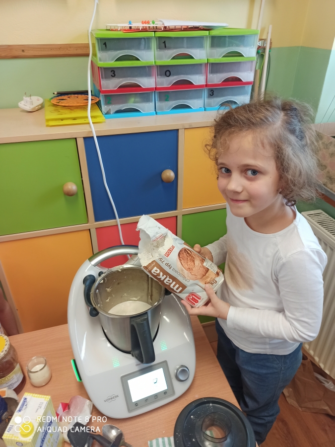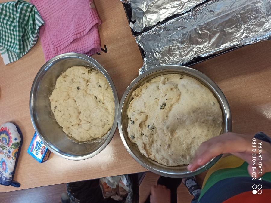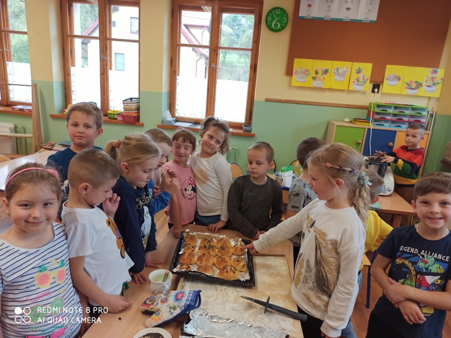 Z okazji „Dnia Chleba” 6 - latki wspólnie z p. Tosią aktywnie uczestniczyły w pieczeniu bułeczek i chleba. Dzieci zapoznały się z przepisem i przygotowały składniki potrzebne do przygotowania pieczywa, wyrabiały ciasto, obserwowały jak rośnie i oczywiście jak pięknie rumieni się w piekarniku. Ostatnim etapem tego procesu był poczęstunek wypiekami przygotowanymi podczas zajęć. A aromatyczne kromeczki smakowała cała obsługa przedszkola. Wychowankowie przedszkola świeże i pachnące pieczywo posmarowali dżemem truskawkowym i nutellą. Był  ogrom radości i wielka satysfakcja dla świętujących ten szczególny dzień w roku.